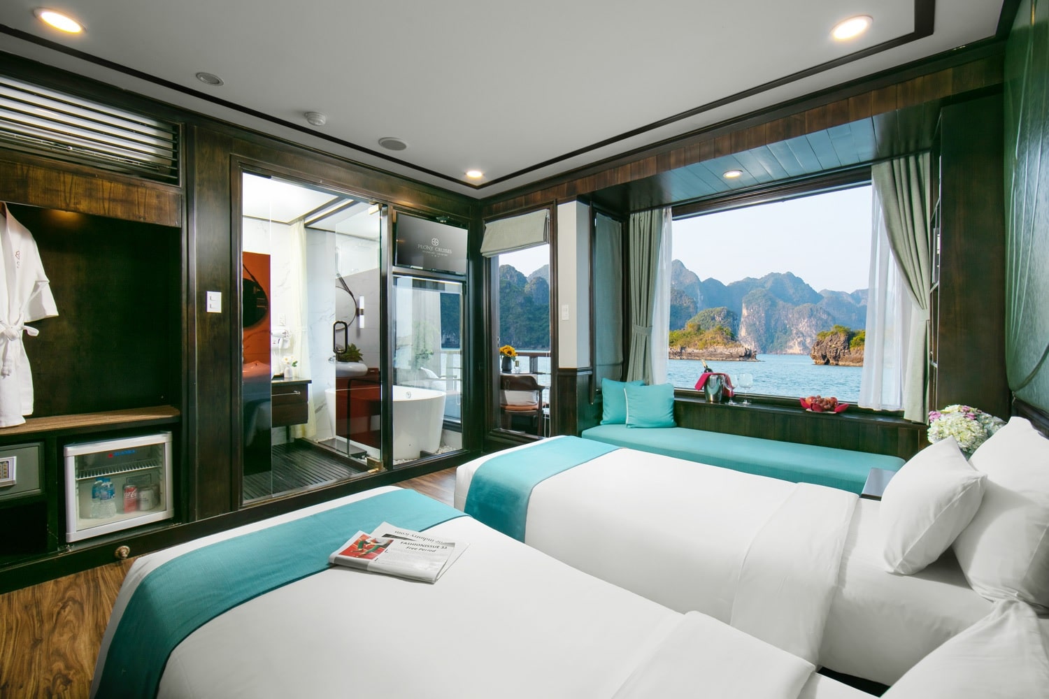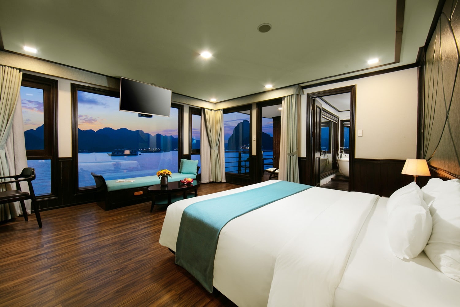 Bước chân vào bên trong, phong cách Indochine với tone gỗ tối màu quyền quý sẽ lập tức vỗ về cảm xúc của bạn. Đây là thiết kế “sang trọng ấm cúng” đặc trưng, nơi những mảng tường xanh mint và cửa sổ kính kịch trần xóa nhòa ranh giới giữa căn phòng và vịnh xanh. Điểm chạm đắt giá nhất chính là hệ thống bồn tắm nằm đặt ngay sát cửa sổ kính hướng biển trong 100% các hạng phòng, từ Deluxe, Premium cho đến các căn Exclusive Suite rộng 45 m2 ở mũi tàu. Hãy tưởng tượng bạn đang ngâm mình trong làn nước ấm, nhâm nhi ly vang đỏ, và ngắm nhìn hoàng hôn lướt qua ngoài cửa sổ — đó chính là khoảnh khắc sự sang trọng chạm đến cảm xúc.