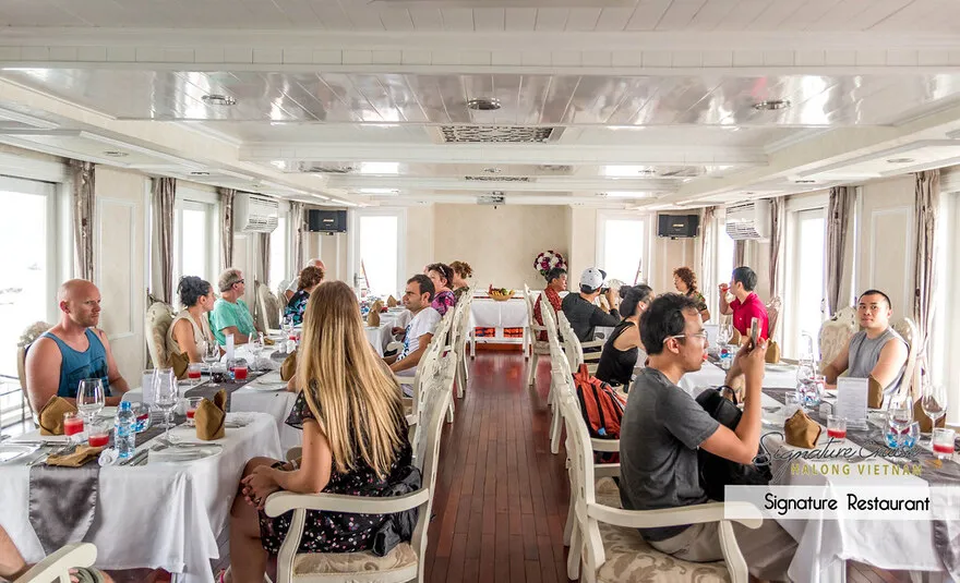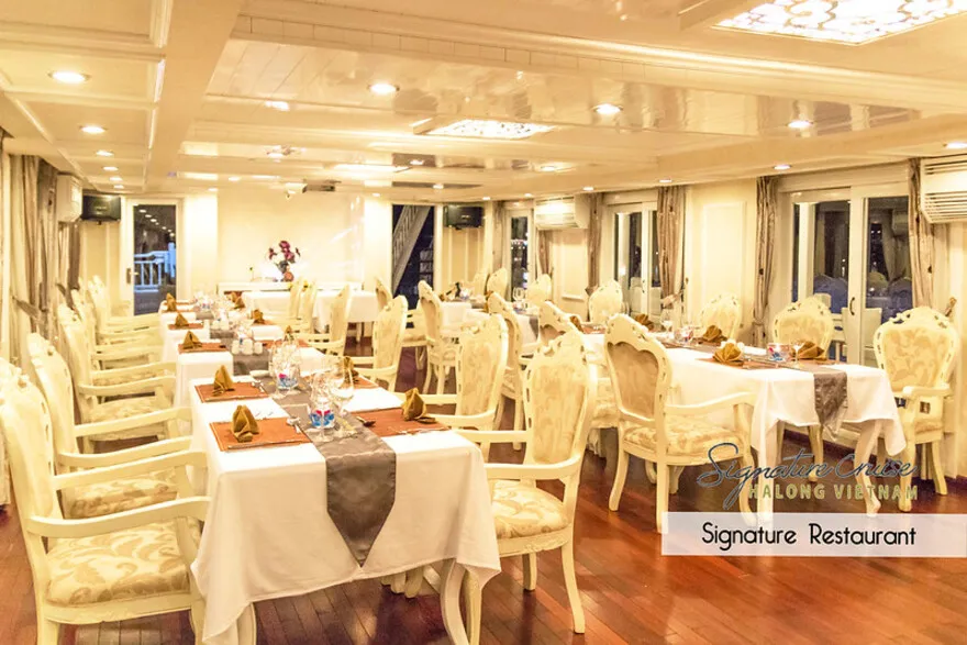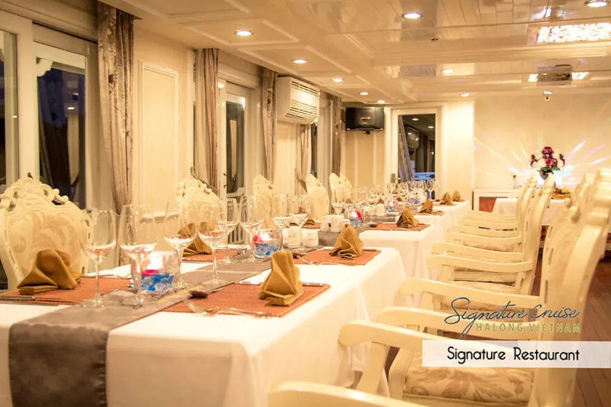 Trải nghiệm ẩm thực trên Du thuyền Signature Hạ Long không chỉ đơn thuần là những bữa ăn mà là một hành trình khám phá hương vị tinh tế, góp phần quan trọng tạo nên sự trọn vẹn cho kỳ nghỉ 5 sao của bạn. Bữa ăn được phục vụ tại nhà hàng chính tọa lạc trên tầng 3, một không gian sang trọng và ấm cúng với thiết kế cửa kính lớn bao quanh, mang đến tầm nhìn panorama tuyệt đẹp ra Vịnh Bái Tử Long thơ mộng. Đây là bối cảnh hoàn hảo cho những bữa ăn lãng mạn hay những khoảnh khắc quây quần đáng nhớ. Thực đơn trên tàu là sự kết hợp hài hòa và chọn lọc giữa tinh hoa ẩm thực Á và Âu. Điểm nhấn đặc biệt chính là việc ưu tiên sử dụng nguồn nguyên liệu tươi ngon nhất theo mùa, đặc biệt là hải sản địa phương nổi tiếng của vùng biển Hạ Long như tôm, mực, cá, hàu… được chế biến đa dạng theo nhiều phong cách. Mỗi món ăn không chỉ chú trọng hương vị mà còn được các đầu bếp tài hoa trình bày tỉ mỉ, đẹp mắt, đánh thức mọi giác quan.