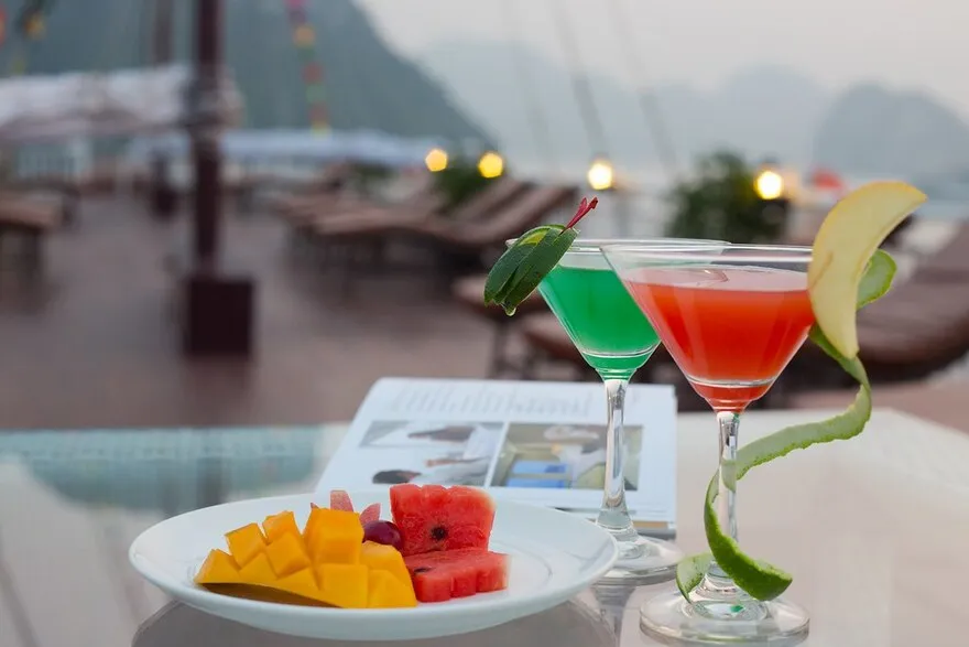 Luôn đặt sự hài lòng của khách hàng lên hàng đầu, du thuyền thể hiện sự chu đáo khi sẵn lòng đáp ứng các yêu cầu ăn kiêng đặc biệt như ăn chay, không gluten hay dị ứng thực phẩm. Để đảm bảo sự chuẩn bị tốt nhất, bạn chỉ cần thông báo chi tiết nhu cầu của mình ít nhất 24 giờ trước chuyến đi. Bên cạnh nhà hàng, quầy bar liền kề với đủ loại đồ uống chọn lọc và chương trình “Happy Hour” hấp dẫn cũng là điểm đến lý tưởng để thư giãn trước hoặc sau bữa ăn, ngắm nhìn cảnh vịnh tuyệt đẹp.