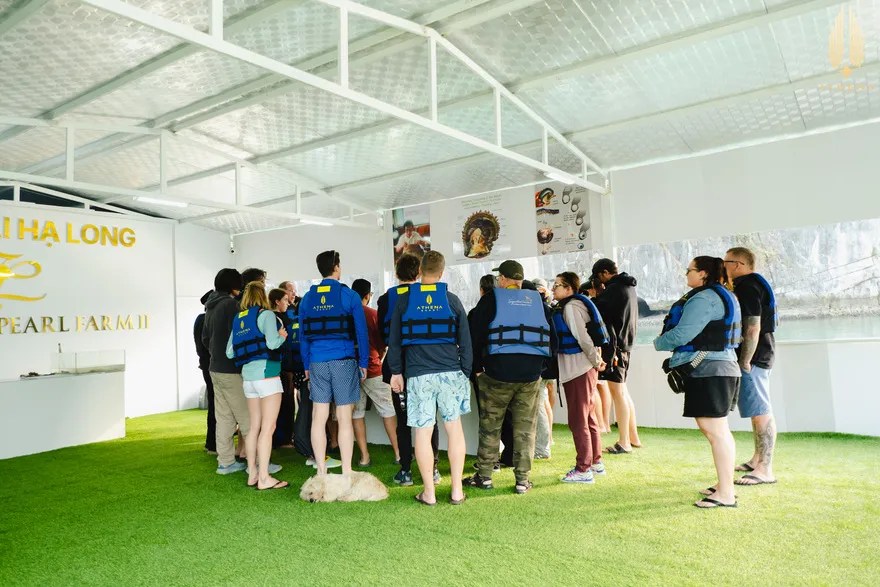Di chuyển ra tàu bằng xuồng cao tốc, thưởng thức đồ uống chào mừng và nghe hướng dẫn an toàn.