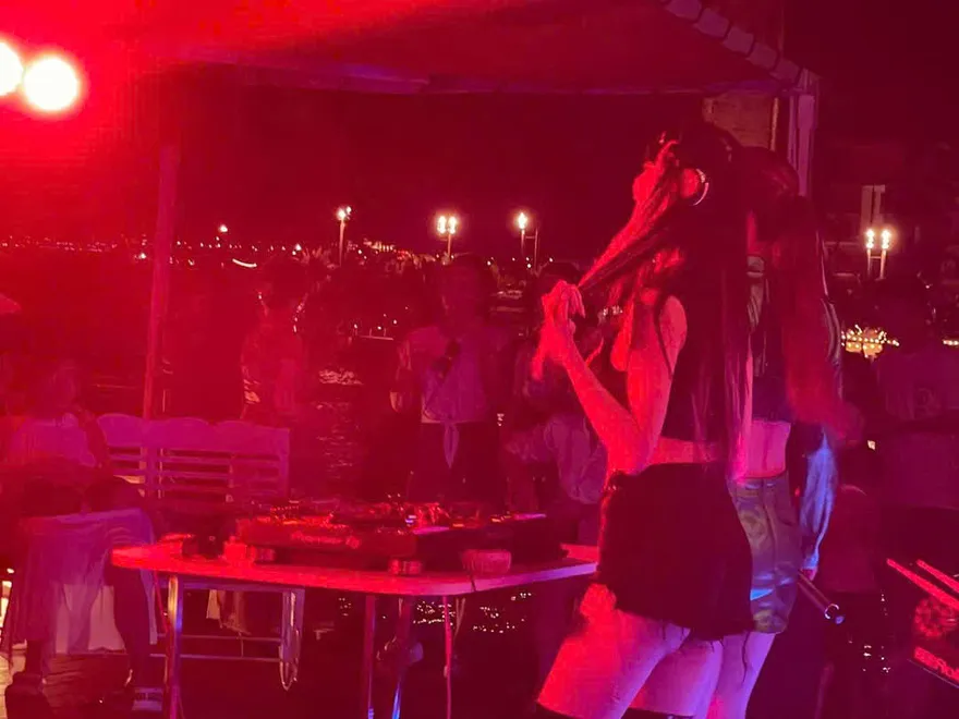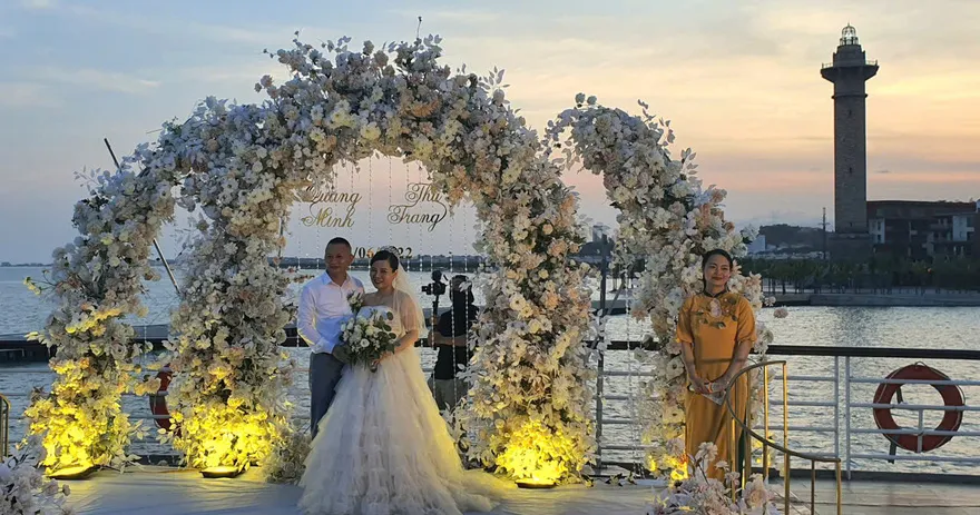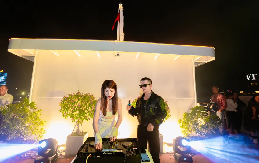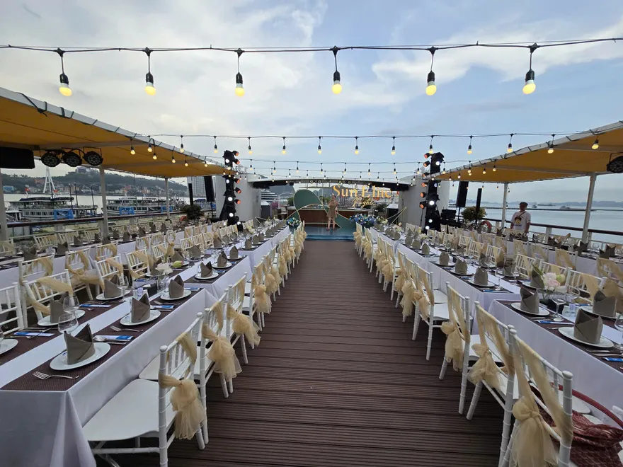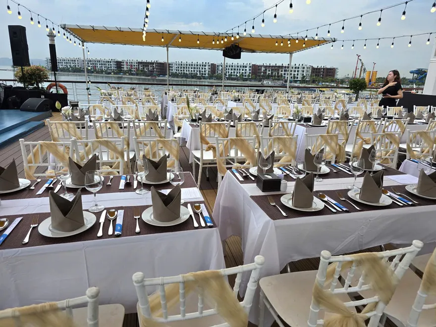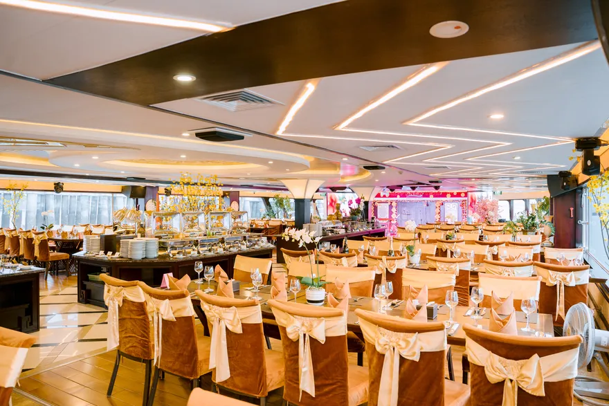 Hành trình bắt đầu đầy ấn tượng tại cầu cảng với sự chào đón nồng hậu từ đội ngũ lễ tân trong tà áo dài truyền thống duyên dáng. Ngay khi bước lên du thuyền, sự tinh tế trong cách đón tiếp được thể hiện qua những ly đồ uống chào mừng mát lạnh, kết hợp cùng những giai điệu nhạc dân tộc trầm bổng vang lên tại sân khấu, giúp hành khách trút bỏ mọi ồn ào của phố thị để chuẩn bị bước vào một đêm tiệc thượng lưu.