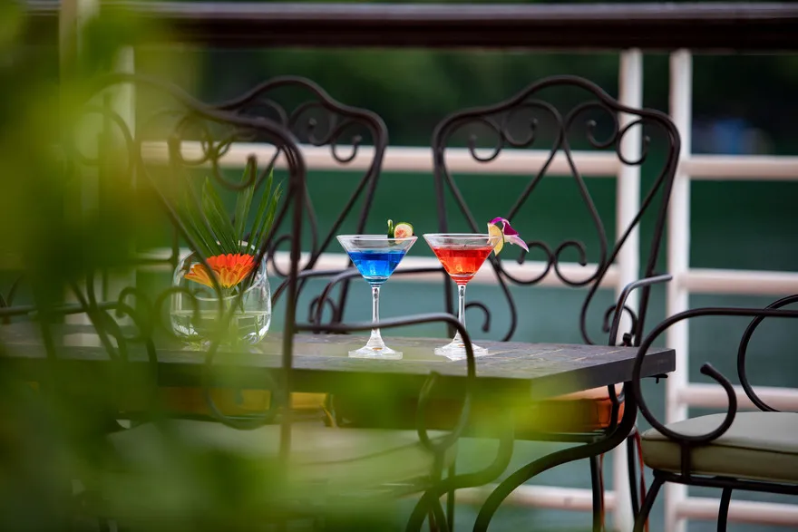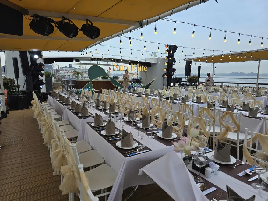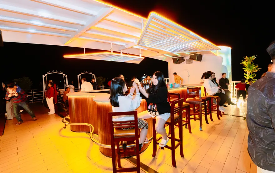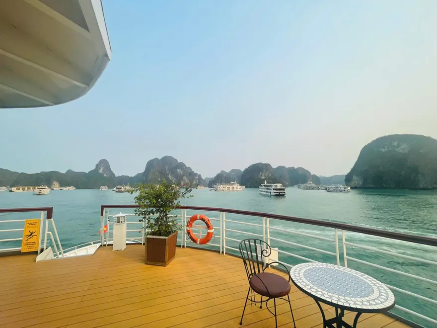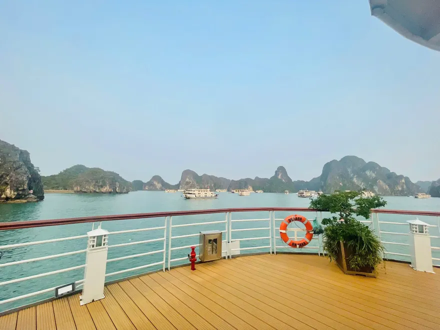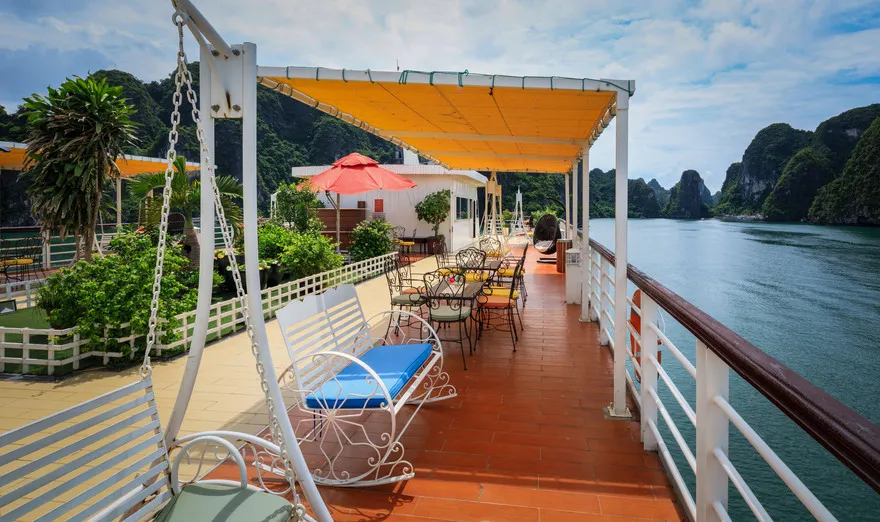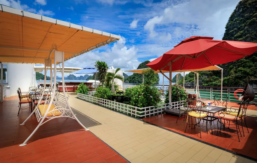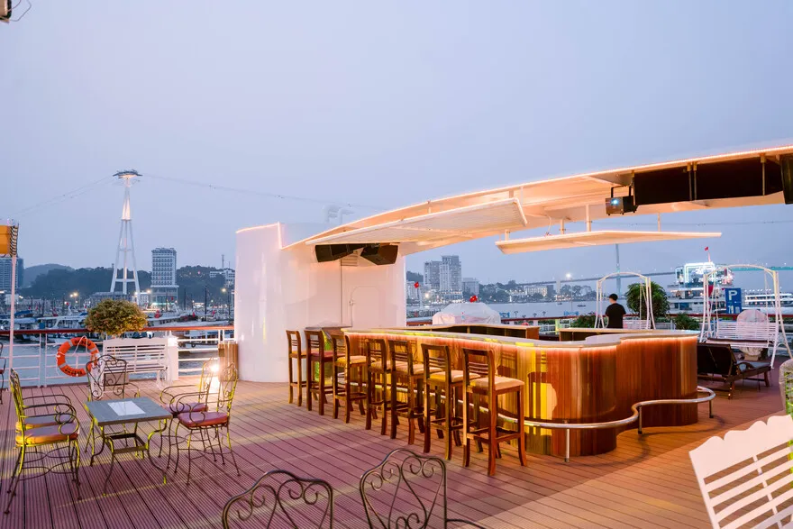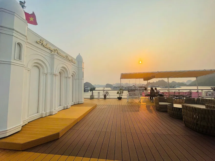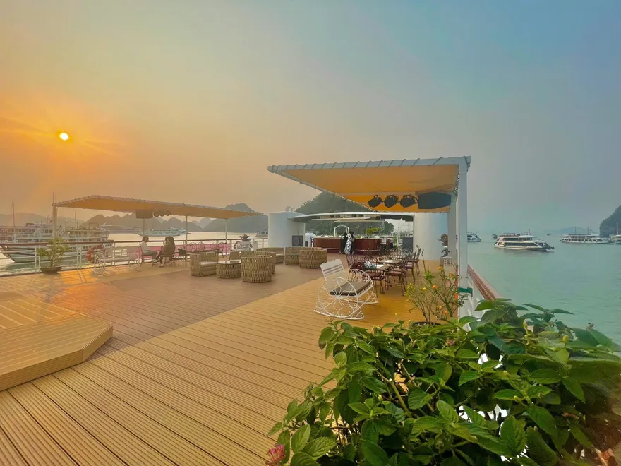 Điểm nhấn ấn tượng nhất trong thiết kế ngoại thất chính là khu vực Sundeck Sky Bar tọa lạc tại tầng ba, ề Bề rang muố đến tầm nhìn toàn cảnh 360 độ ngắm trọn vẹn vẻ kỳ vĩ của Vịnh Hạ Long. Đây là không gian mở hoàn toàn, nơi du khách có thể tự do thư giãn, lưu lại những khung hình tuyệt đẹp và thưởng thức bộ sưu tập hơn 50 loại đồ uống tinh tế, từ các loại cocktail huyền thoại đến mocktail bổ dưỡng. Dù ở bất kỳ vị trí nào trên du thuyền, sự chăm chút trong kiến trúc cũng sẽ khiến bạn cảm nhận được sự tận tâm và đẳng cấp của một dịch vụ 5 sao thực thụ.