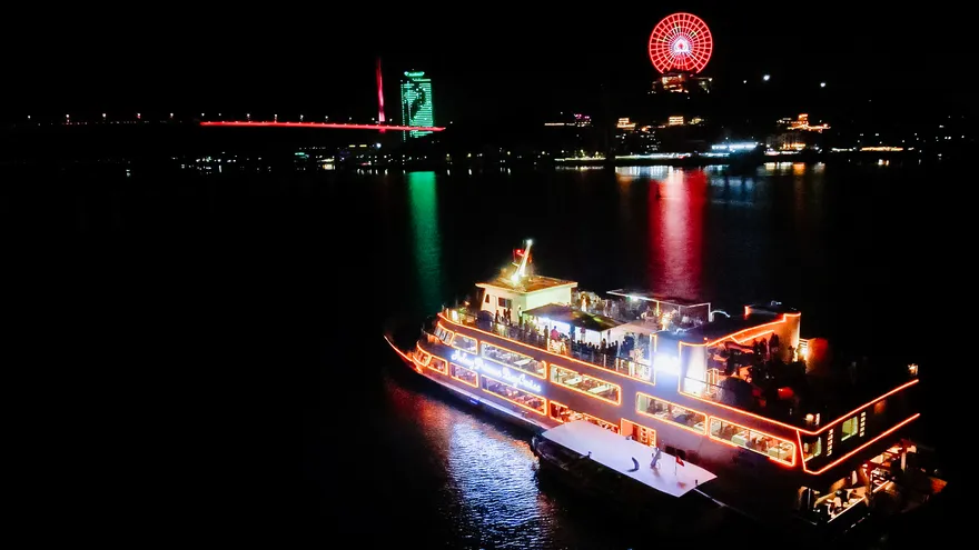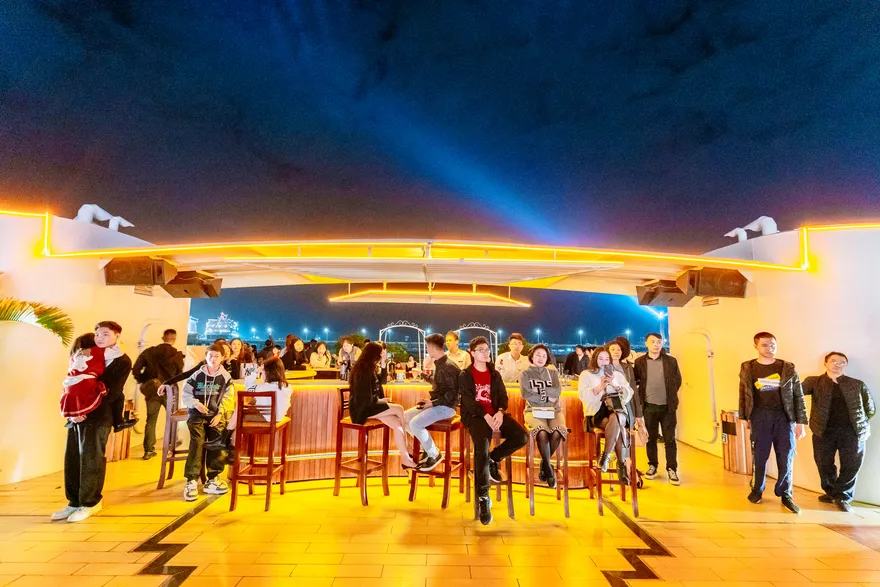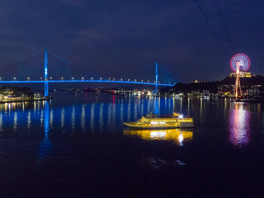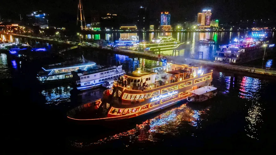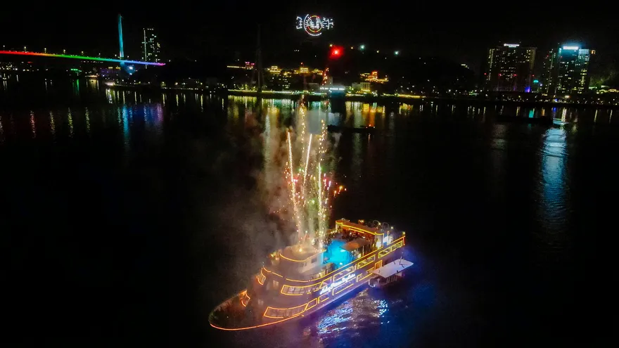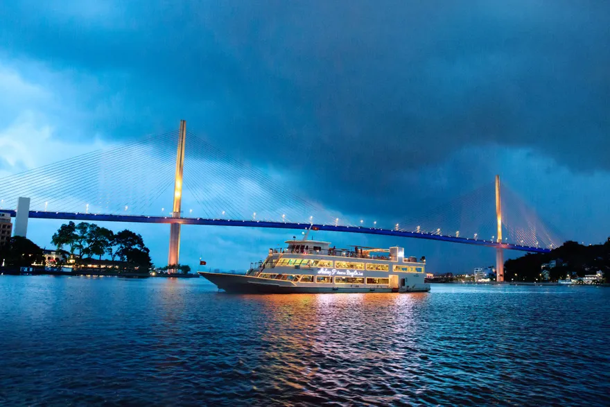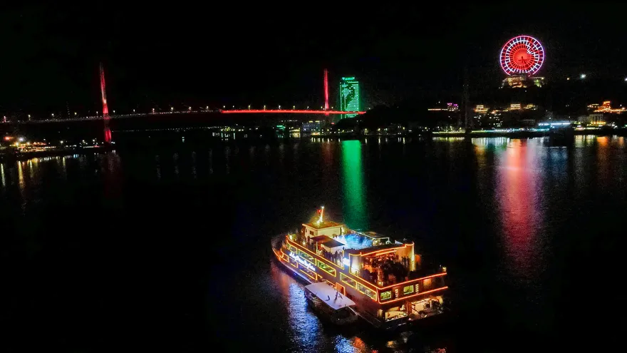 Khi du thuyền nhẹ nhàng rời bến, một khung cảnh lộng lẫy dần hiện ra trước mắt. Du khách sẽ được chiêm ngưỡng thành phố Hạ Long lung linh dưới muôn vàn ánh đèn, từ nhịp sống sôi động ven biển đến vẻ rực rỡ của cầu Bãi Cháy và vòng quay Mặt Trời Sun Wheel soi bóng xuống mặt nước êm đềm. Cảm giác ngồi giữa không gian sang trọng của du thuyền, ngắm nhìn “thành phố ánh sáng” từ ngoài khơi xa mang lại một sự thư thái và lãng mạn tuyệt đối.