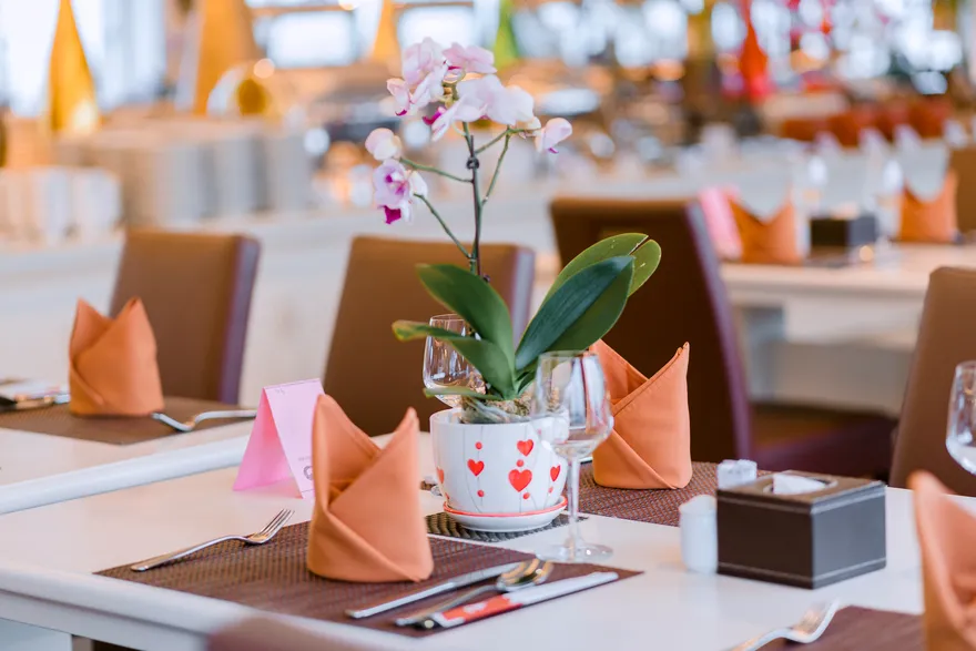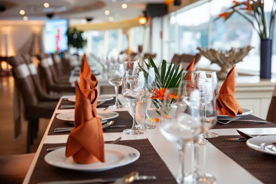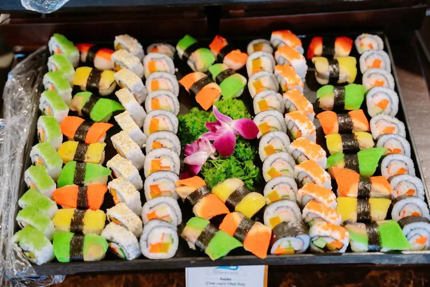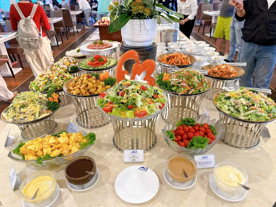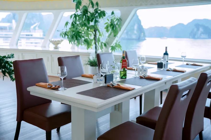 Đội ngũ hơn 60 nhân viên phục vụ F&B luôn sẵn sàng hỗ trợ các yêu cầu đặc biệt của thực khách. Ngoài thực đơn chay phong phú, nếu hành khách có tiền sử dị ứng với bất kỳ loại nguyên liệu nào, vui lòng thông báo cho bộ phận đặt chỗ hoặc quản lý nhà hàng ngay khi lên tàu. Đầu bếp tài năng của du thuyền sẽ tư vấn và chuẩn bị các phương án thay thế an toàn mà vẫn đảm bảo hương vị tinh túy của bữa tiệc.