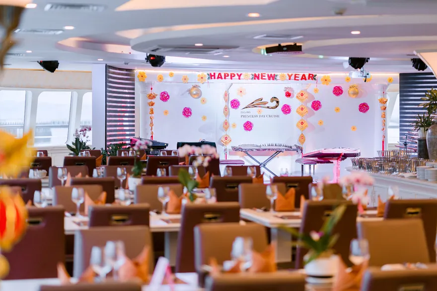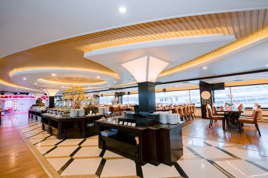 Kiến trúc của Princess Day Cruise là một bản giao hưởng đầy nghệ thuật, nơi linh hồn Á Đông thuần khiết gặp gỡ nét tinh tế, lãng mạn của phương Tây. Ngay tại tầng một, du khách sẽ được chào đón bởi không gian của nhà hàng Viet House với sức chứa 140 chỗ ngồi, một nơi tôn vinh những giá trị bản địa truyền thống của Việt Nam. Toàn bộ mặt sàn được lát đá marble đánh bóng sang trọng, kết hợp cùng hệ thống sân khấu chuyên dụng cho các loại nhạc cụ dân tộc và ban nhạc quốc tế, tạo nên một điểm đến văn hóa đầy chiều sâu ngay giữa lòng di sản.