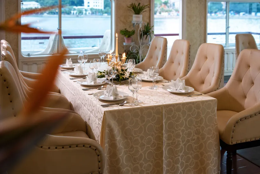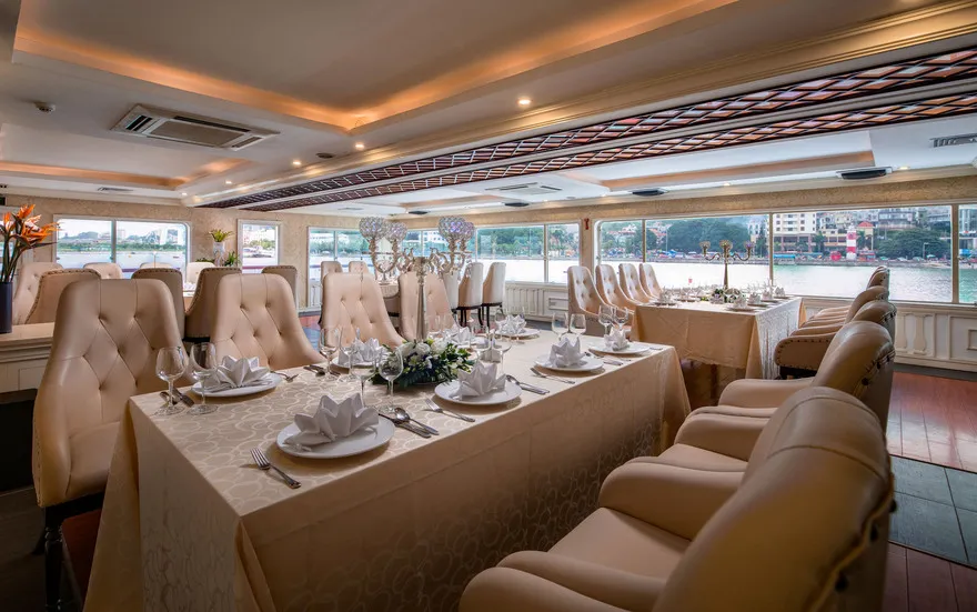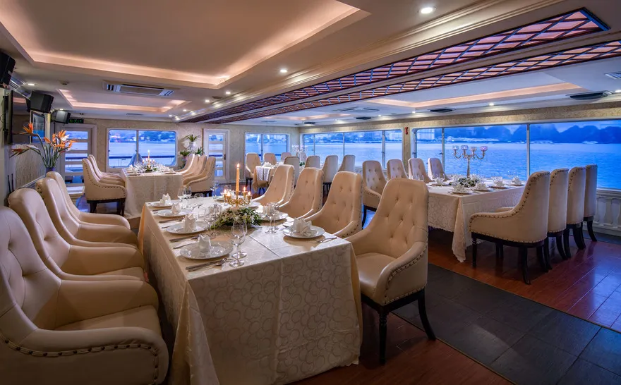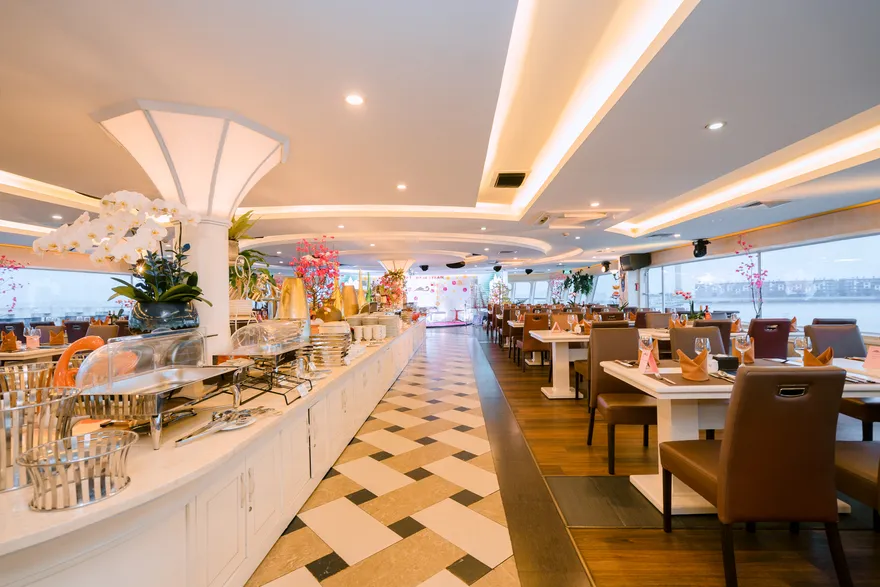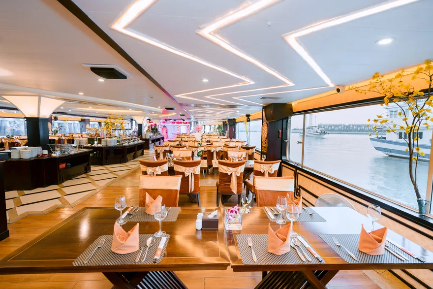 Tiếp bước lên tầng hai, bầu không khí chuyển mình sang vẻ đẹp quý phái của nhà hàng Le Bon với phong cách thiết kế Tân cổ điển kiểu Pháp (French Neoclassical). Với sàn gỗ ấm cúng và hệ thống điều hòa trung tâm hiện đại, Le Bon là không gian lý tưởng cho những bữa tiệc lịch lãm với quy mô 120 khách. Đặc biệt, du thuyền còn khéo léo bố trí hệ thống 02 phòng VIP riêng biệt với sức chứa 40 khách, được trang bị sẵn màn hình LCD và các thiết bị trình chiếu chuyên nghiệp, đáp ứng hoàn hảo mọi nhu cầu hội họp kín hay các sự kiện mang tính riêng tư cao.