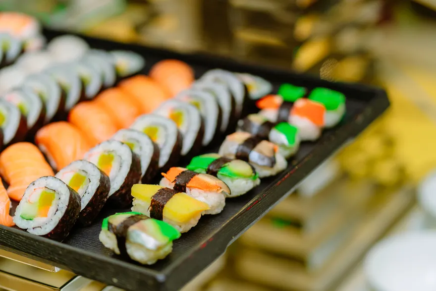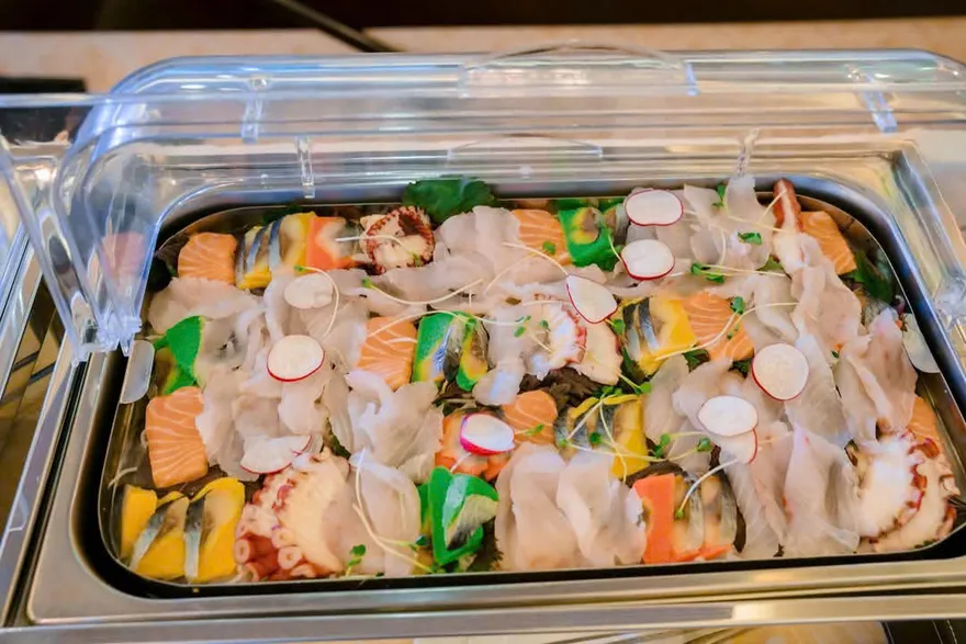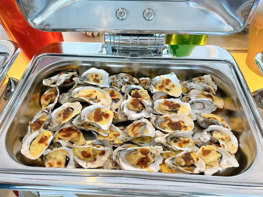 Tâm điểm của đêm hội chính là đại tiệc Buffet hải sản kết hợp cùng mỹ vị Hàn – Nhật tinh túy. Với thực đơn hơn 100 món được chế biến bởi đội ngũ đầu bếp tâm huyết, hành khách sẽ được trải nghiệm sự giao thoa ẩm thực độc đáo, từ những món hải sản tươi rói đặc trưng của vùng vịnh đến những nét tinh tế của ẩm thực xứ sở Kim Chi và Hoa Anh Đào. Không gian thưởng thức ẩm thực càng thêm phần thăng hoa khi có sự xuất hiện của ban nhạc quốc tế và ban nhạc truyền thống biểu diễn luân phiên, tạo nên một sự kết nối tuyệt vời giữa các nền văn hóa.
