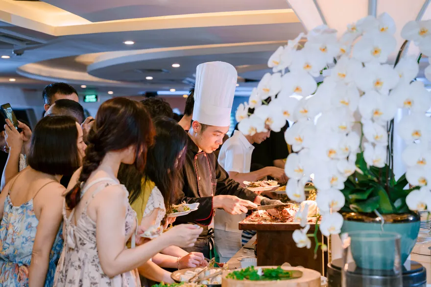 Khai tiệc Buffet hải sản kết hợp cùng mỹ vị Hàn – Nhật. Ban nhạc quốc tế và truyền thống biểu diễn luân phiên phục vụ thực khách.