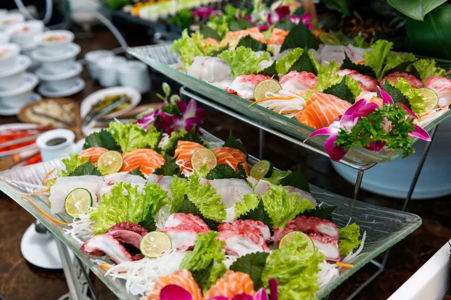 Thưởng thức đại tiệc Buffet hải sản và quốc tế với hơn 100 món trong không gian âm nhạc sống động.