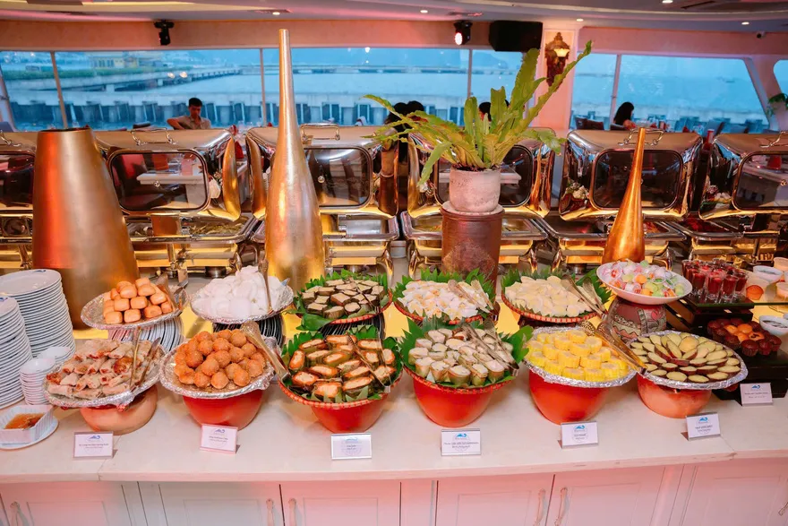 Đúng 12:00, khi du thuyền nhẹ nhàng lướt qua Hòn Gà Chọi (Hòn Trống Mái) và núi Hoa Cương kỳ vĩ, một đại tiệc buffet 5 sao với hơn 100 món ăn sẽ được phục vụ tại hệ thống nhà hàng sang trọng. Thực khách có thể vừa thưởng thức hải sản tươi sống cùng mỹ vị Hàn – Nhật tinh túy, vừa chiêm ngưỡng những khối núi đá vôi triệu năm tuổi ngay qua khung cửa kính lớn của nhà hàng Viet House hay Le Bon. Sự kết hợp giữa ẩm thực thượng hạng, ban nhạc Philippines biểu diễn trực tiếp và cảnh sắc tuyệt mỹ bên ngoài chính là khoảnh khắc thăng hoa nhất, kết thúc hành trình lúc 14:10 khi tàu trở về bến cảng, để lại những dư vị khó quên về một chuyến đi đẳng cấp giữa kỳ quan thế giới.