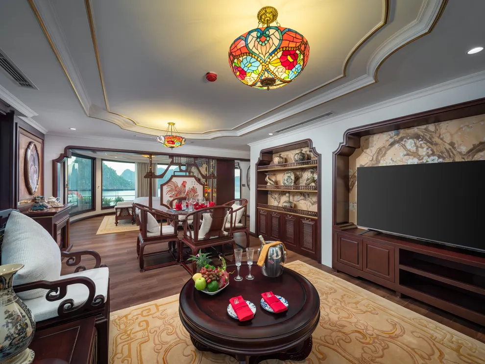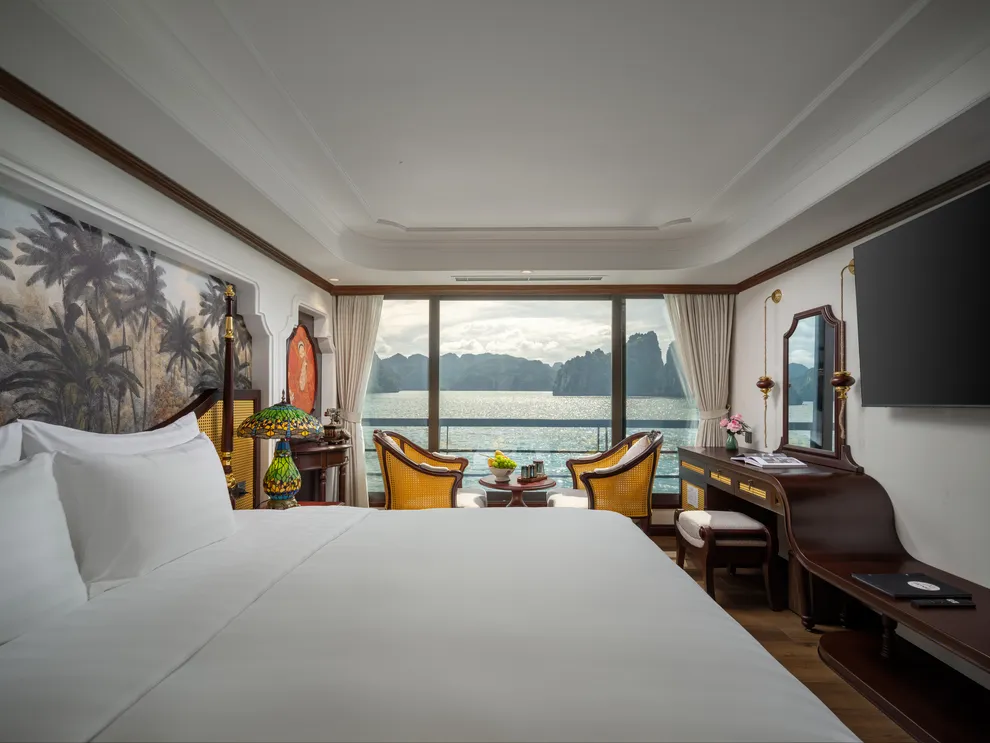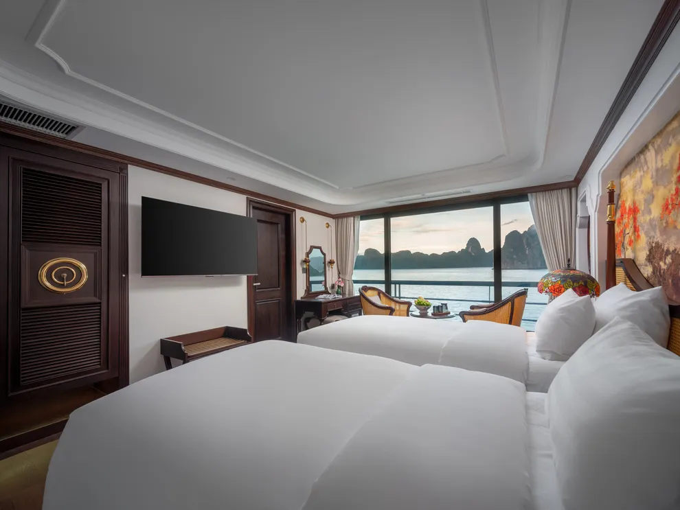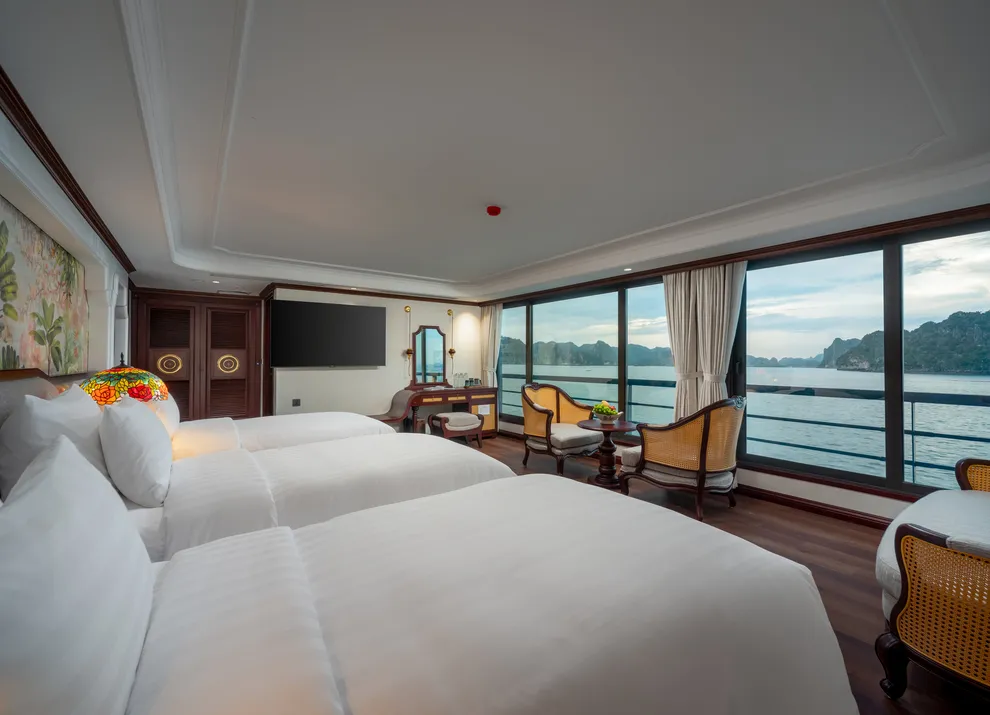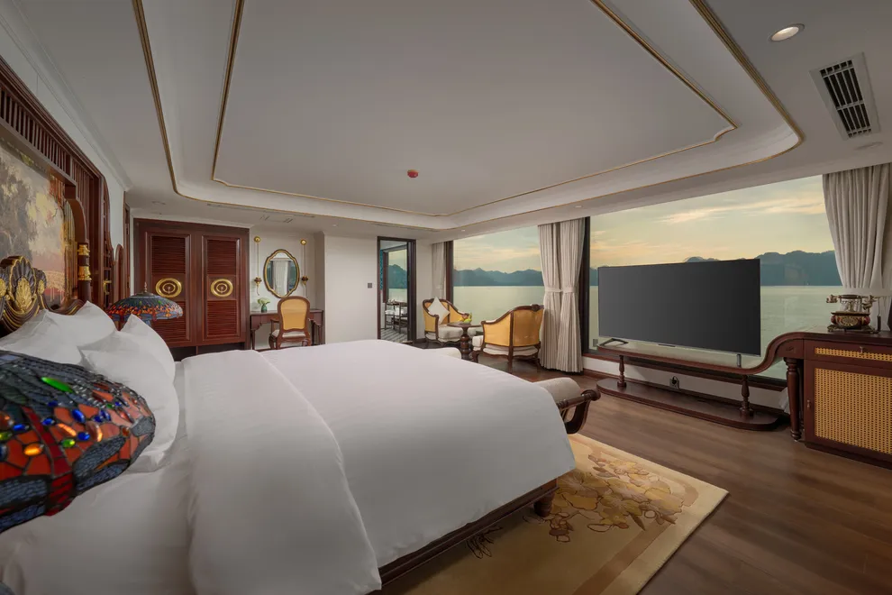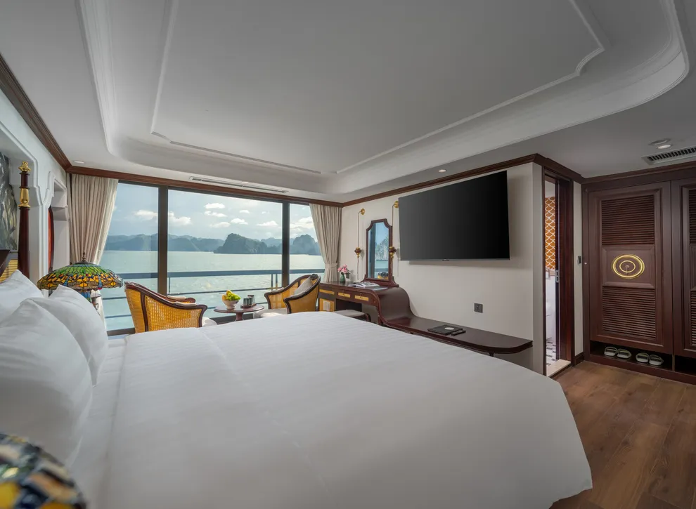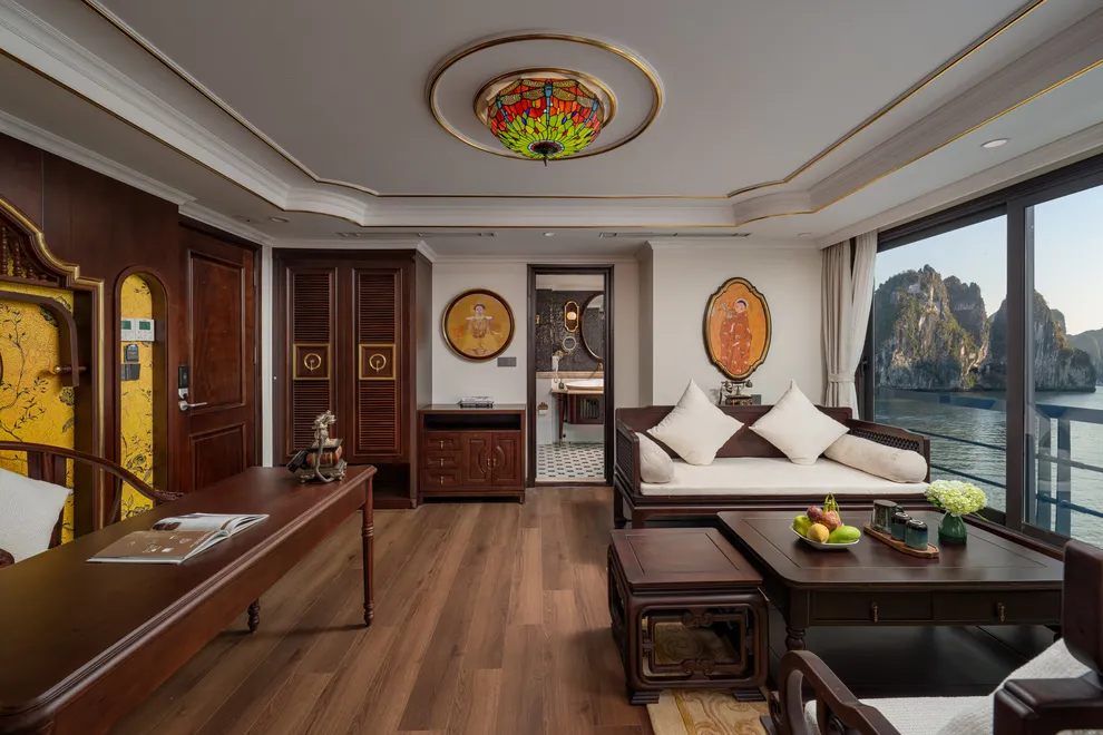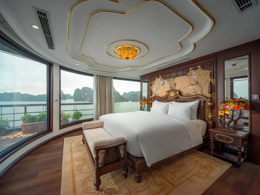 Hệ thống lưu trú của L’Amour Cruise bao gồm 33 phòng Suites được ví như những “dinh thự nổi”, tất cả đều sở hữu bồn tắm và tầm nhìn hướng biển. Hạng phòng tiêu chuẩn Century Suite (26m²) tại các tầng 1, 2, 3 phù hợp cho gia đình nhờ thiết kế cửa thông nhau. Hạng Oriental Suite (30m²) gây ấn tượng với cửa kính trượt Panorama sát trần. Cao cấp hơn, hạng Imperial Suite (55m²) tại tầng 2 sở hữu sân hiên riêng và bồn sục Jacuzzi ngoài trời. Hạng Majestic Suite (70m²) nâng tầm trải nghiệm Wellness với phòng xông hơi đá muối Himalaya tích hợp ngay trong phòng. Đỉnh cao của sự xa hoa là Royal Palace Suite (100m²) tại tầng 3, nơi du khách tận hưởng đặc quyền tối thượng với quản gia riêng phục vụ 24/24 và các bữa ăn riêng tư ngay tại phòng.
