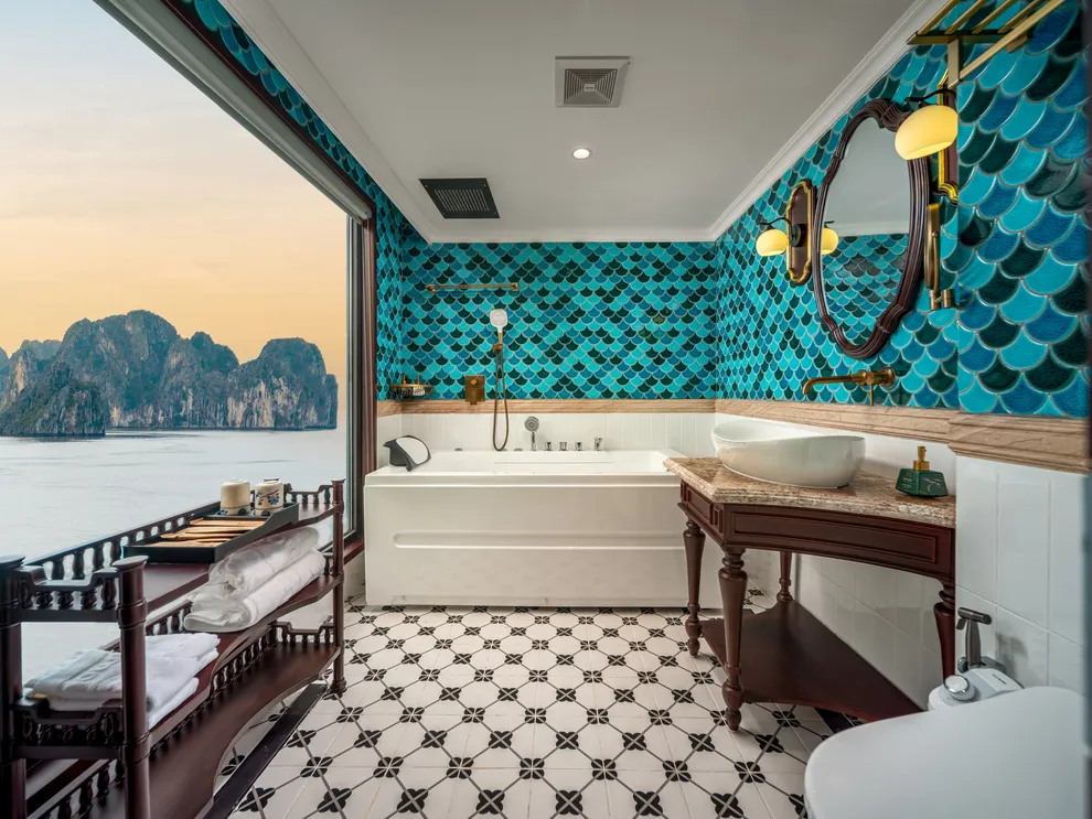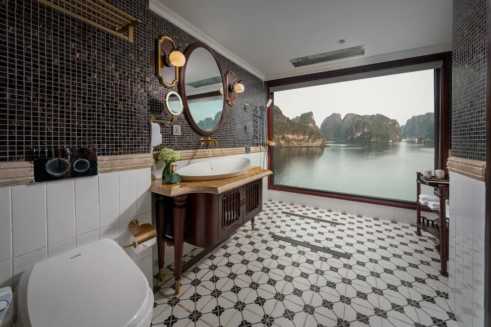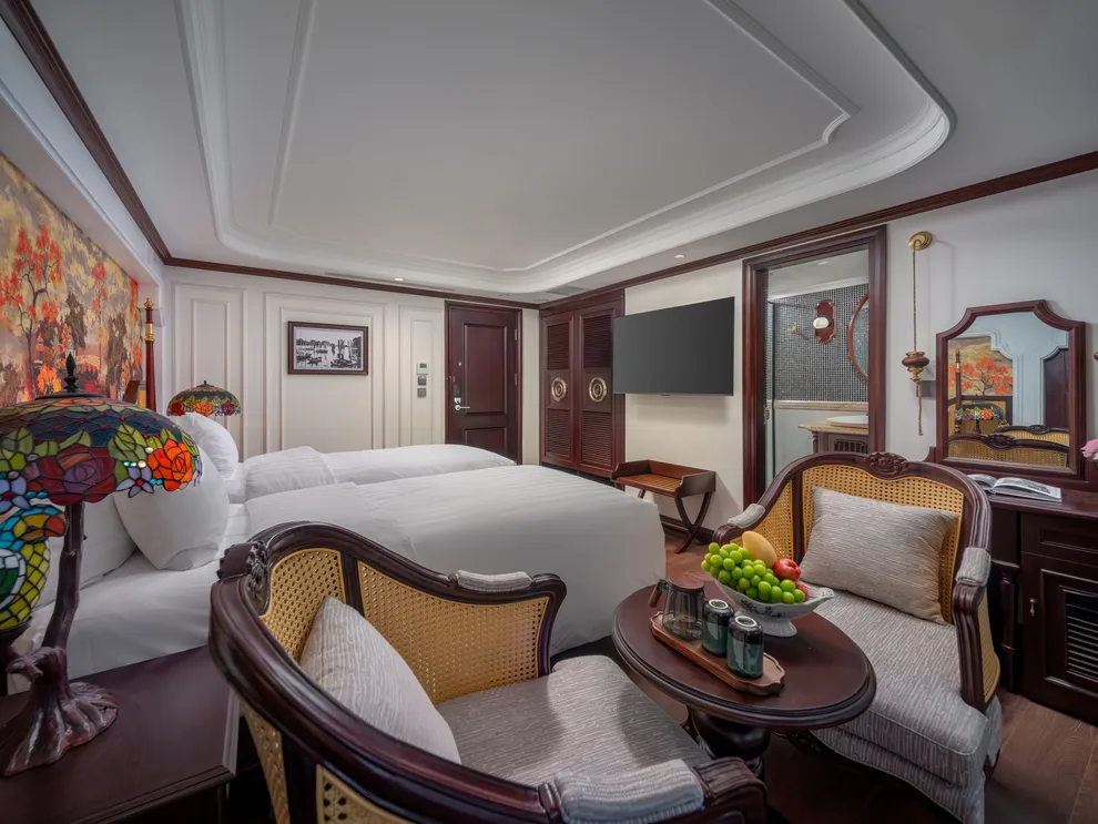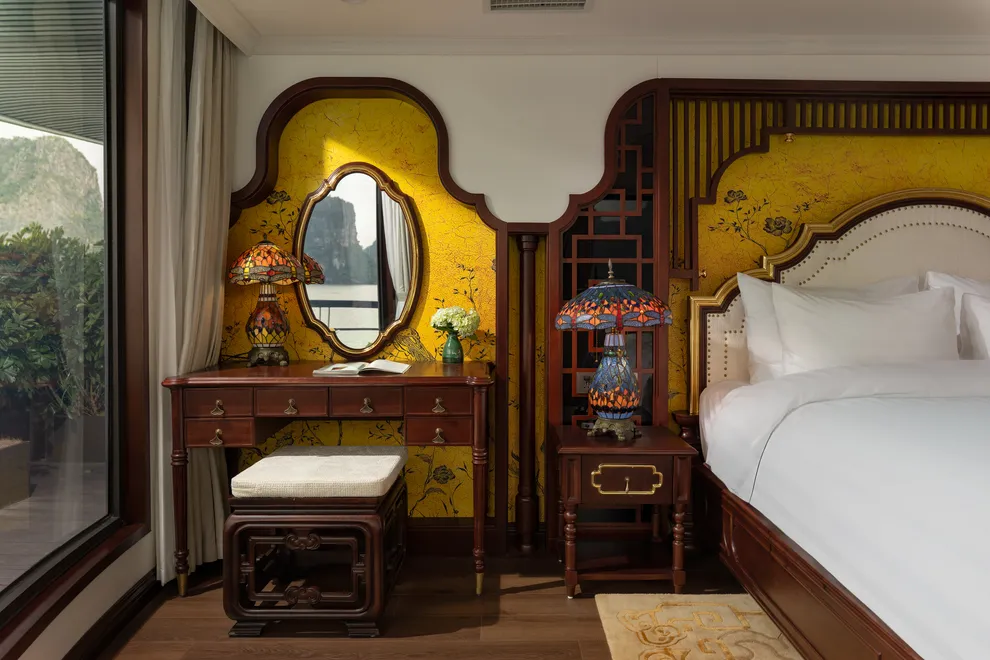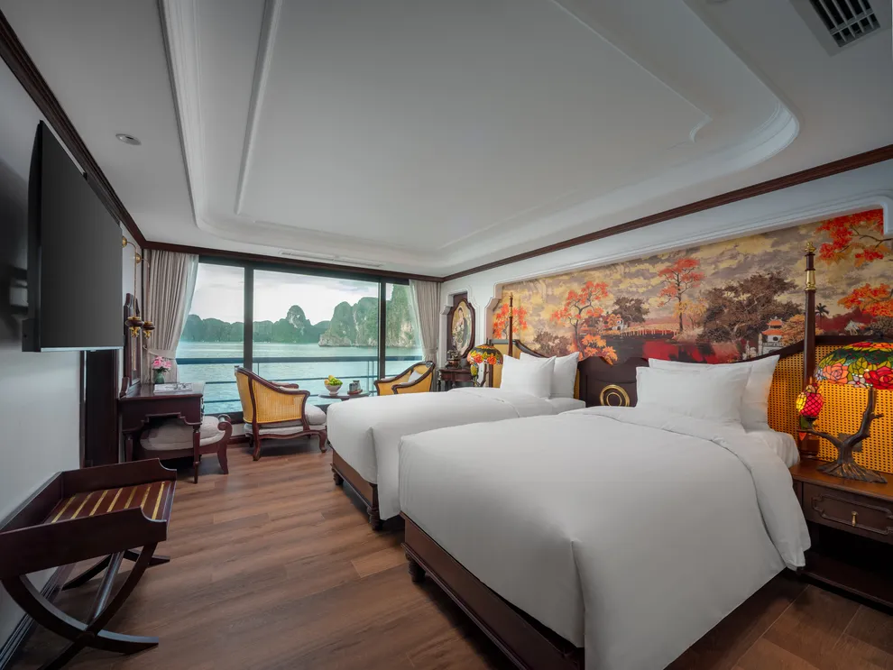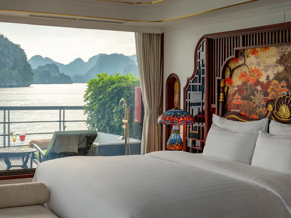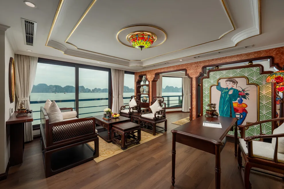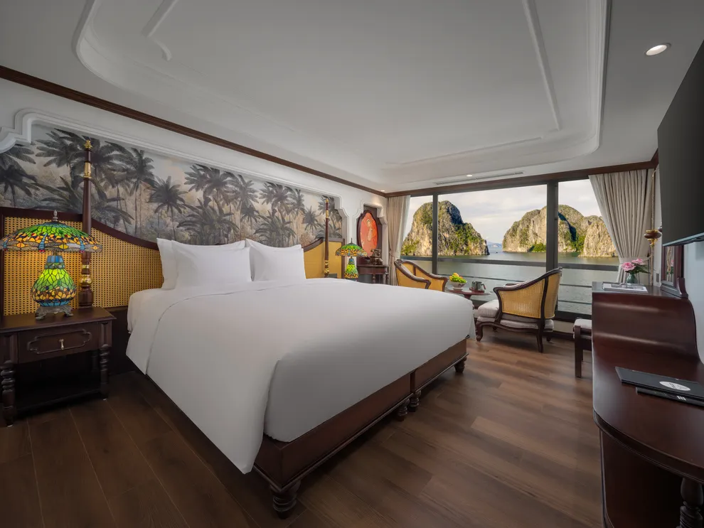 Hệ thống lưu trú của L’Amour Cruise bao gồm 33 phòng Suites được ví như những “dinh thự nổi”, tất cả đều sở hữu bồn tắm và tầm nhìn hướng biển. Hạng phòng tiêu chuẩn Century Suite (26m²) tại các tầng 1, 2, 3 phù hợp cho gia đình nhờ thiết kế cửa thông nhau. Hạng Oriental Suite (30m²) gây ấn tượng với cửa kính trượt Panorama sát trần. Cao cấp hơn, hạng Imperial Suite (55m²) tại tầng 2 sở hữu sân hiên riêng và bồn sục Jacuzzi ngoài trời. Hạng Majestic Suite (70m²) nâng tầm trải nghiệm Wellness với phòng xông hơi đá muối Himalaya tích hợp ngay trong phòng. Đỉnh cao của sự xa hoa là Royal Palace Suite (100m²) tại tầng 3, nơi du khách tận hưởng đặc quyền tối thượng với quản gia riêng phục vụ 24/24 và các bữa ăn riêng tư ngay tại phòng.