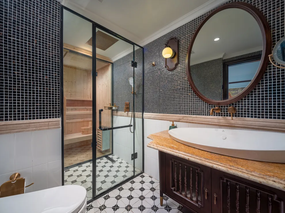 • cửa kính trượt sát trần (sliding door), bồn tắm Jacuzzi hiện đại.