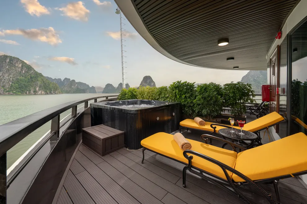 3. Thay đổi địa điểm ăn tối: Bữa tối thường được phục vụ tại Nhà hàng Thăng Long (Sundeck). Tuy nhiên, trong điều kiện thời tiết không thuận lợi (mưa, gió lớn), bữa tối sẽ được chuyển xuống phục vụ tại Nhà hàng Hoa Lư.