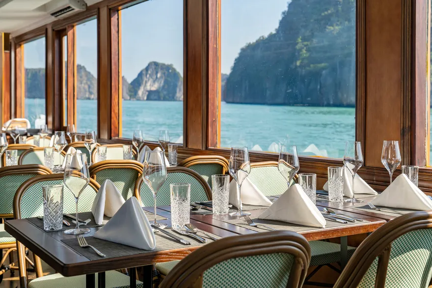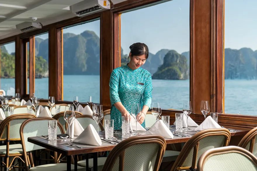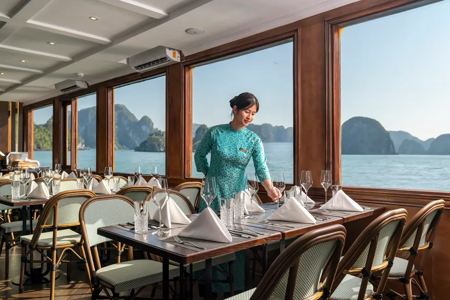 Bên cạnh đó, an toàn và tiện nghi luôn là tôn chỉ vận hành nghiêm ngặt được Lavoya đặt lên hàng đầu. Du thuyền không chỉ tuân thủ các quy chuẩn hàng hải hiện đại mà còn cung cấp đầy đủ bảo hiểm hành khách cùng các loại thuế phí dịch vụ trong gói lịch trình, giúp du khách hoàn toàn an tâm tận hưởng kỳ nghỉ. Để đảm bảo sự kết nối không gián đoạn với thế giới bên ngoài, khu vực nhà hàng luôn được hỗ trợ Wi-Fi miễn phí, cho phép du khách chia sẻ ngay lập tức những khoảnh khắc đáng nhớ giữa lòng kỳ quan. Sự hòa quyện giữa hạ tầng kỹ thuật tối tân và dịch vụ chuẩn mực chính là lý do khiến Lavoya Boutique Day Cruise trở thành lựa chọn hàng đầu cho hành trình khám phá di sản