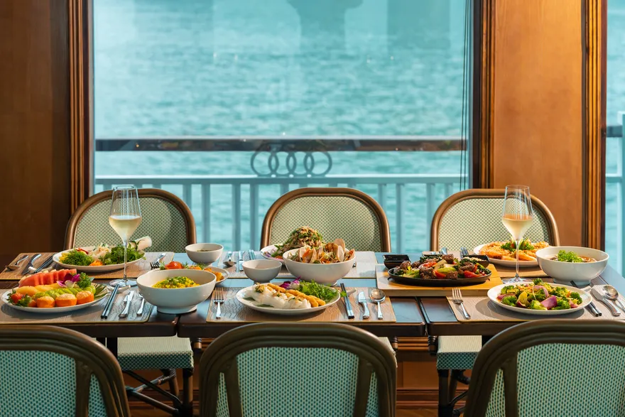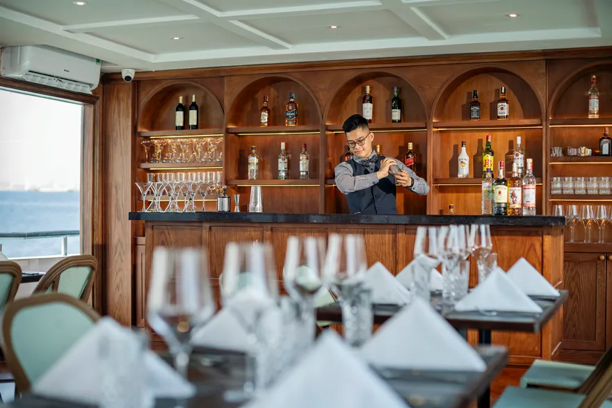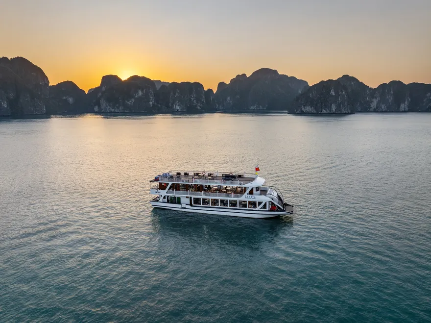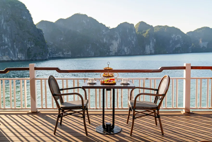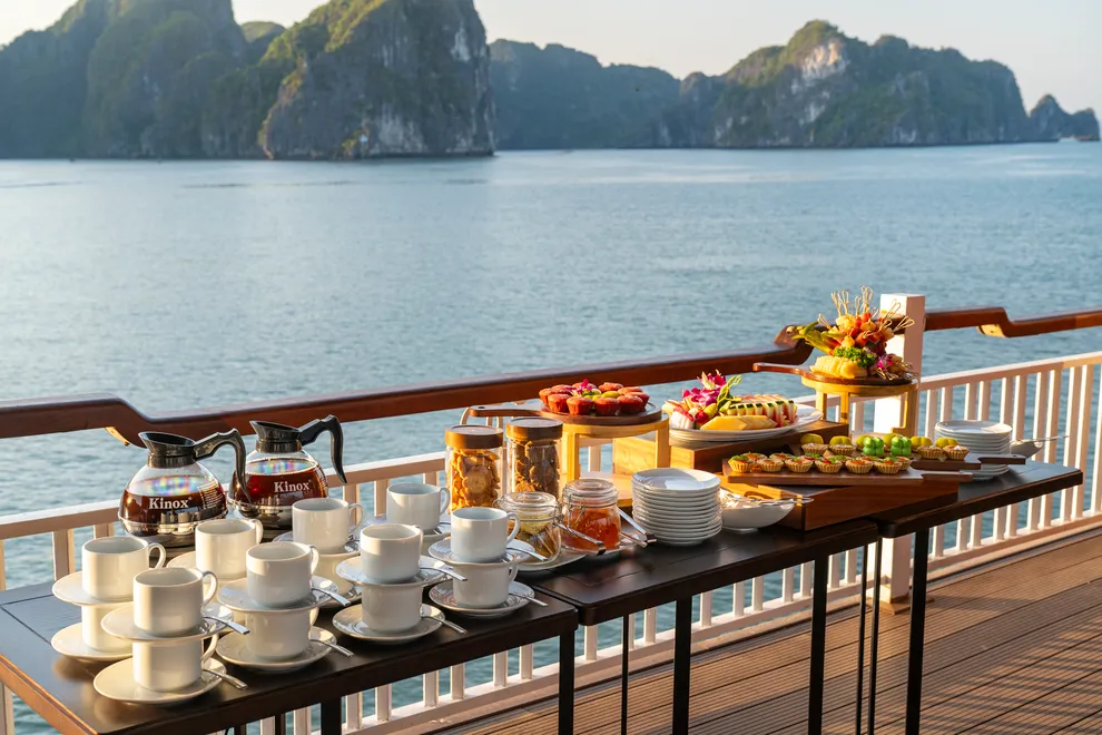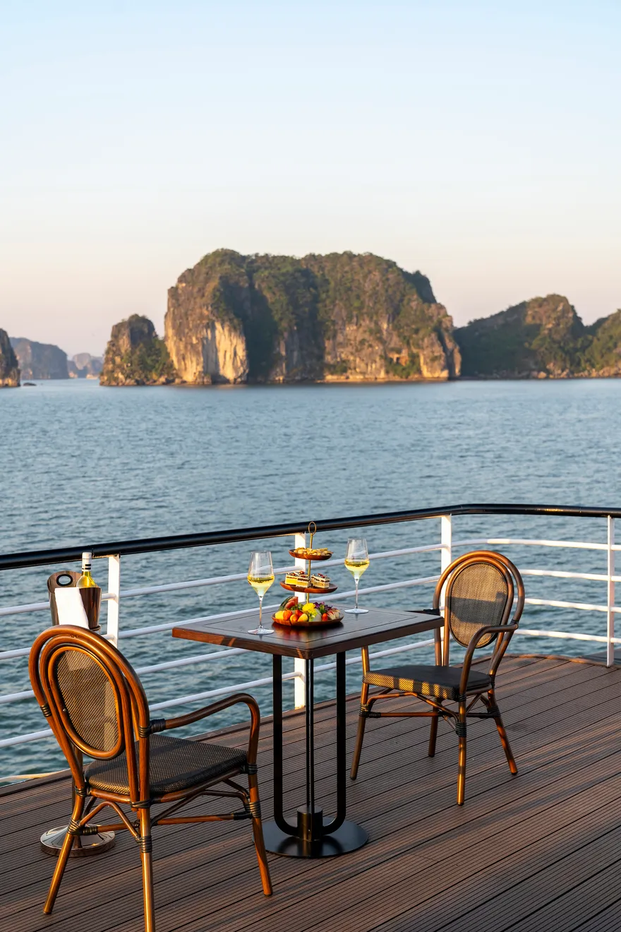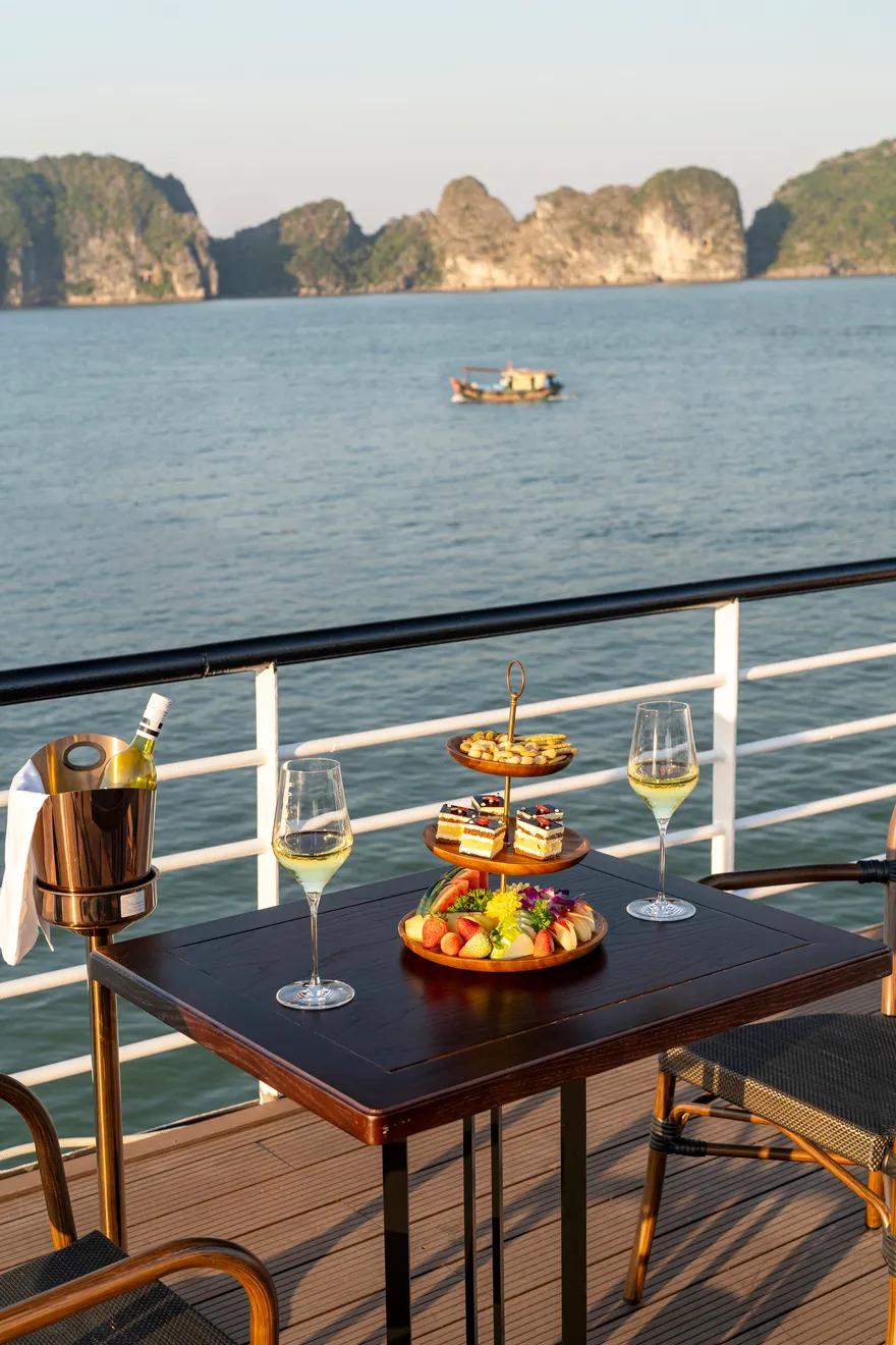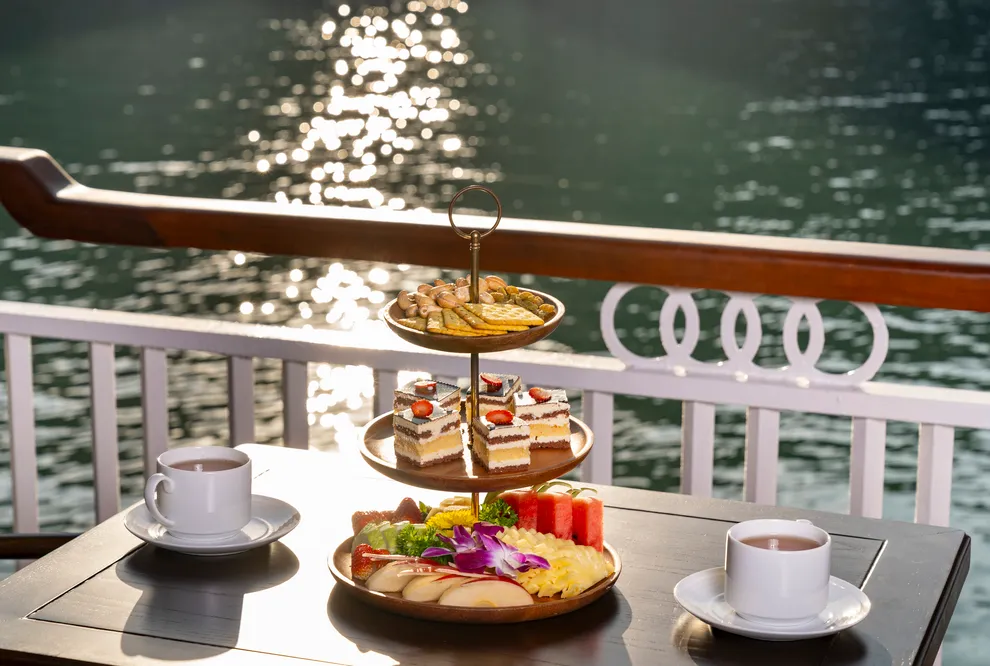 Khi nắng chiều dần buông, trải nghiệm ẩm thực được tiếp nối bằng buổi tiệc trà hoàng hôn (Sunset Tea) đầy lãng mạn trên boong tàu. Tại đây, du khách được thưởng thức trà và cà phê Việt Nam truyền thống cùng các loại bánh quy bơ, bánh quy mứt trái cây và hoa quả theo mùa. Đặc biệt, hoạt động “Chef’s Taste Demonstration” sẽ cho phép bạn trực tiếp tham gia làm và thưởng thức món nem rán truyền thống – một trải nghiệm văn hóa thú vị giúp gắn kết du khách với tinh hoa ẩm thực Việt. Sự kết hợp giữa tiệc trà chiều thanh tao và khung cảnh vịnh biển nhuộm màu hoàng hôn chính là khoảnh khắc lắng đọng nhất, khép lại một ngày khám phá trọn vẹn và đầy cảm xúc.