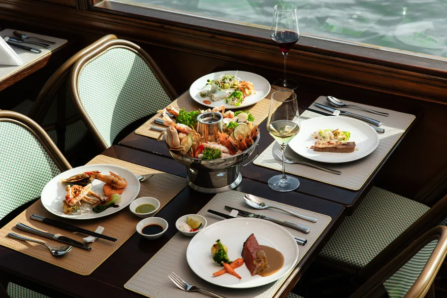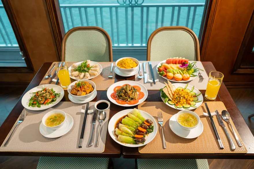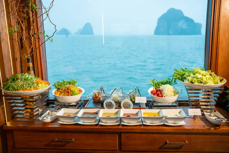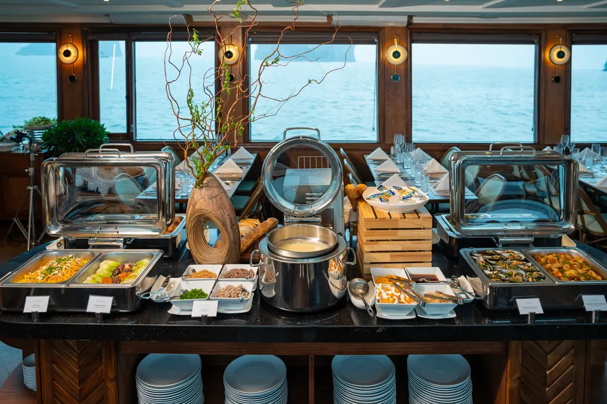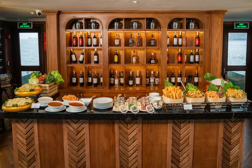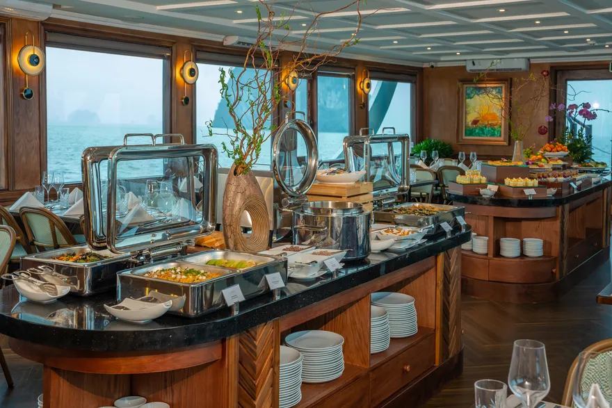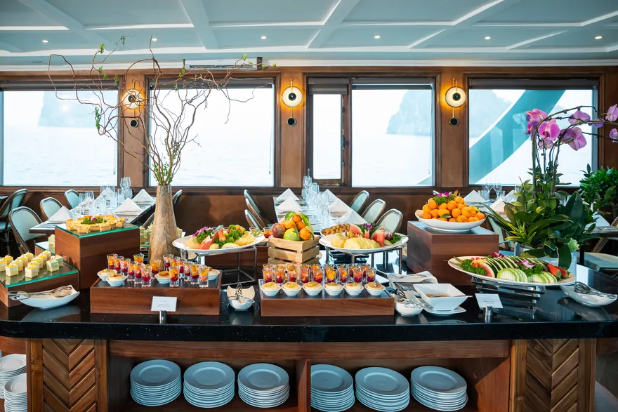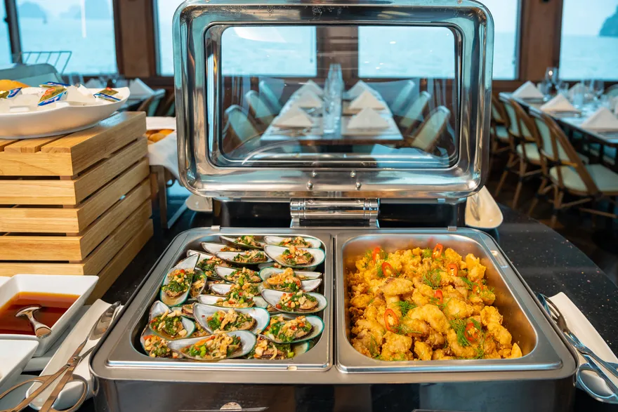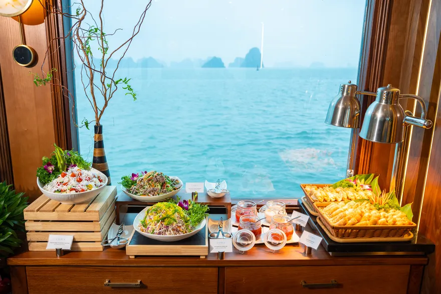 Thưởng thức bữa trưa Buffet thượng hạng trên du thuyền trong khi tàu tiếp tục hải trình.