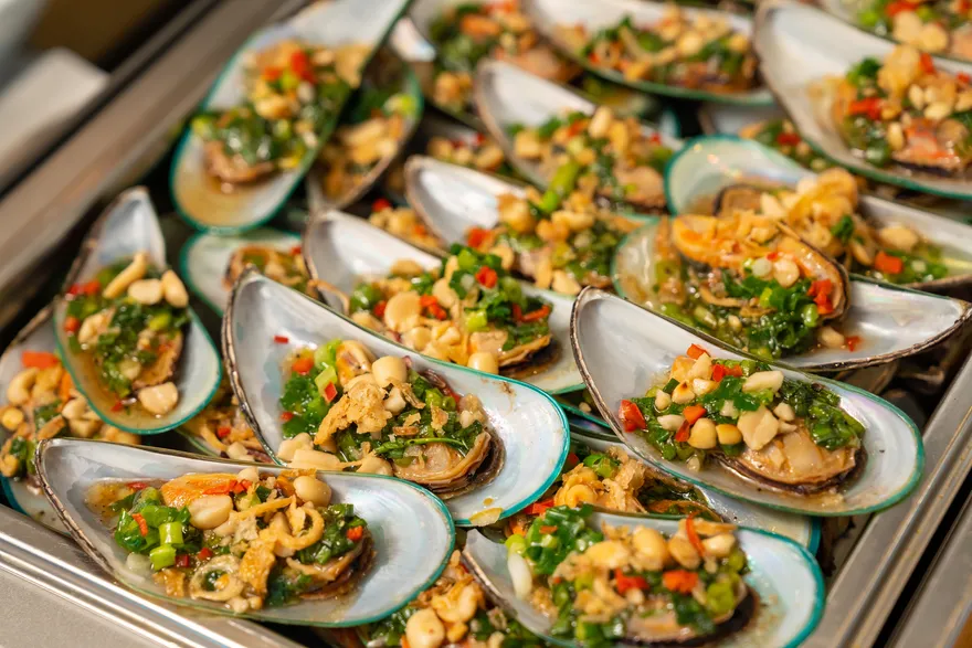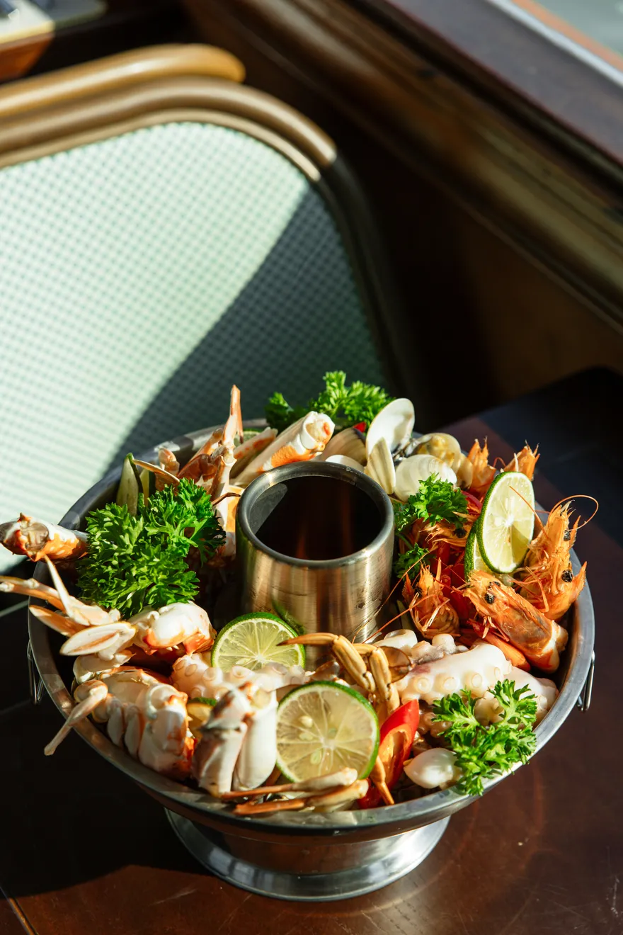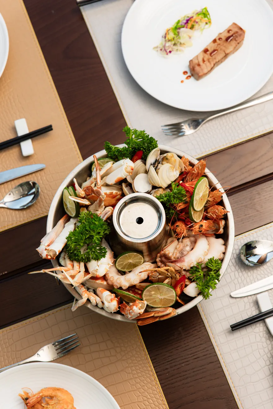 Ẩm thực trên Lavoya Boutique Day Cruise không chỉ đơn thuần là các bữa ăn, mà là một hành trình khám phá hương vị được thiết kế cầu kỳ để đánh thức mọi giác quan của du khách. Tâm điểm của trải nghiệm này chính là bữa trưa Buffet Á – Âu thượng hạng, nơi hội tụ những nguyên liệu tinh túy nhất từ biển cả và đất liền. Tại khu vực “Hot Corner”, bạn sẽ được thưởng thức những món hải sản đậm đà hương vị địa phương như Vẹm xanh nướng mỡ hành, Mực xào tiêu xanh Phú Quốc, hay Tôm chiên muối ớt giòn rụm. Bên cạnh đó, các món chính như Nạc vai heo nướng mật ong và Thăn cá chiên xốt bơ chanh mang lại sự cân bằng hoàn hảo giữa phong vị truyền thống và kỹ thuật chế biến phương Tây hiện đại.