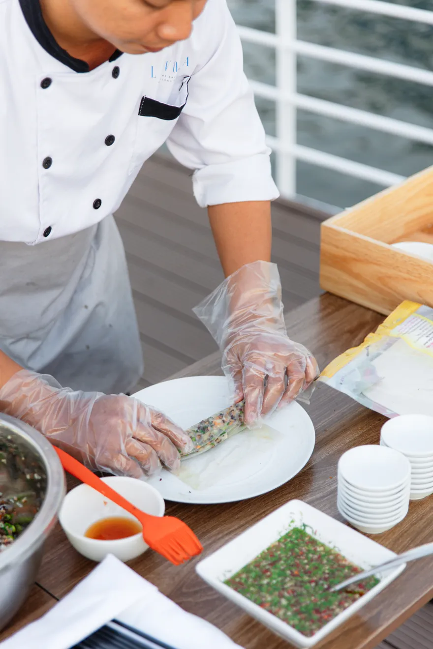 Trải nghiệm lớp học nấu ăn (làm nem truyền thống) và thưởng thức tiệc trà chiều hoàng hôn trên boong tàu.