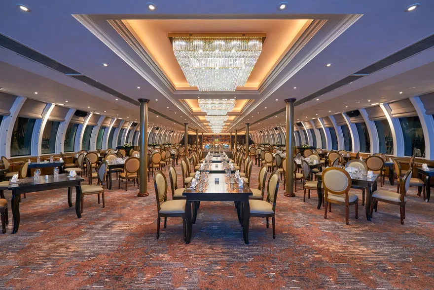 Hành trình ẩm thực trên Paradise Delight là một cuộc dạo chơi giữa những hương vị thượng hạng, được dẫn dắt bởi hai không gian nhà hàng mang phong cách hoàn toàn khác biệt. Nếu nhà hàng El Loto tại tầng chính là tâm điểm của sự sôi động với đại tiệc Buffet quốc tế phong phú sức chứa 200 khách, thì El Jazmin tại tầng trên lại là chốn riêng tư lý tưởng cho những bữa tiệc Set menu tinh tế với 100 chỗ ngồi. Sự phân cấp này không chỉ nằm ở quy mô không gian mà còn ở cung cách phục vụ, giúp thực khách dễ dàng lựa chọn giữa không khí lễ hội náo nhiệt hay sự tĩnh lặng, sang trọng bậc nhất dành cho tầng lớp thượng lưu.