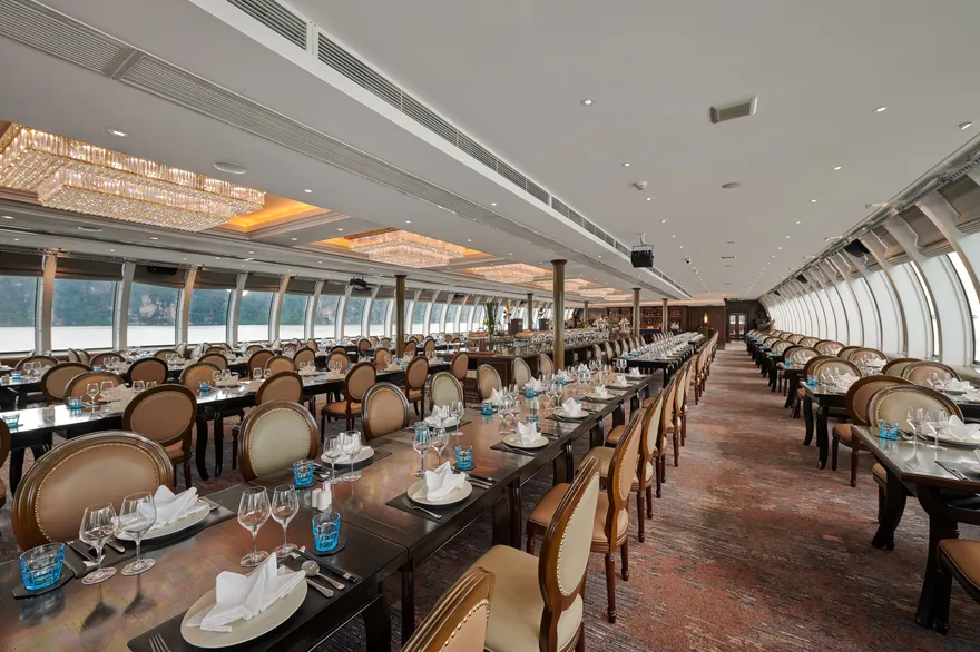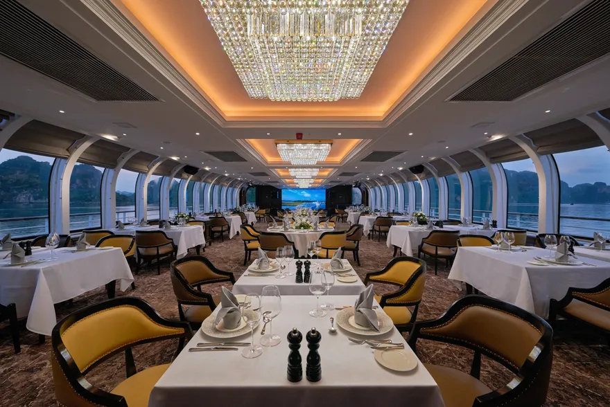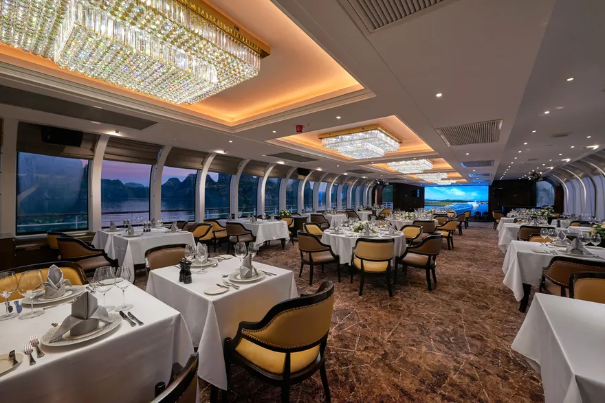 Điểm nhấn kiến trúc đắt giá nhất của Paradise Delight chính là hệ thống vách kính vô cực bao quanh các tầng nhà hàng. Thiết kế này không chỉ mang lại vẻ đẹp thẩm mỹ hiện đại mà còn xóa nhòa ranh giới giữa không gian nội thất sang trọng với kỳ quan thiên nhiên bên ngoài, cho phép du khách tận hưởng tầm nhìn 360 độ ôm trọn vẻ đẹp di sản từ bất kỳ vị trí nào trên tàu. Đây là yếu tố cốt lõi giúp tối ưu hóa ánh sáng tự nhiên và tạo nên những góc check-in “triệu view” cho mọi thực khách.