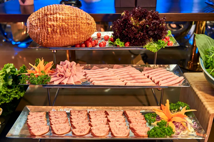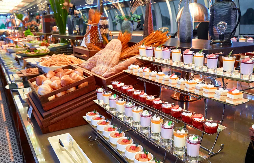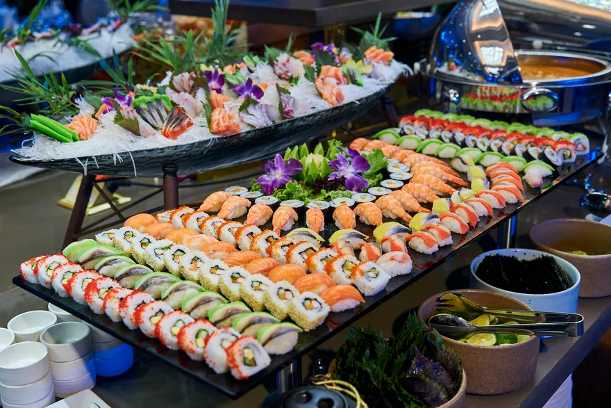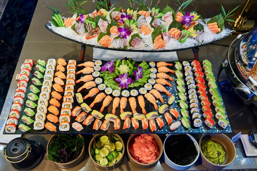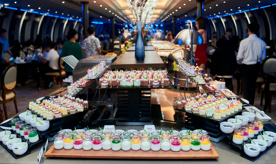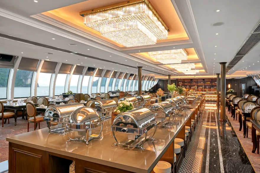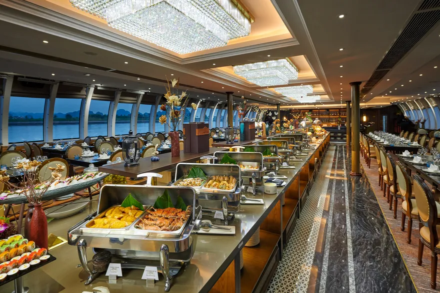 Tâm điểm của hành trình chính là đại tiệc buffet quốc tế thượng hạng với thực đơn lên đến hơn 100 món ăn được chế biến cầu kỳ, tinh tế bởi đội ngũ đầu bếp tài hoa. Bạn sẽ được thỏa sức khám phá một thế giới hương vị phong phú, trải dài từ những món Á Đông quen thuộc như sushi tươi ngon, sashimi chuẩn vị Nhật Bản, các món gỏi và salad thanh mát kiểu Việt, đến các món Âu kinh điển được chế biến công phu như bò nướng mềm mọng, sườn cừu thơm lừng hay các loại pasta hấp dẫn. Đặc biệt, không thể không nhắc đến quầy hải sản tươi sống trứ danh của Hạ Long, nơi hội tụ những sản vật biển cả cao cấp nhất như tôm hùm chắc thịt, cua hoàng đế béo ngậy (tùy theo mùa và gói dịch vụ), tôm mũ ni ngọt lịm, ghẹ xanh tươi rói, bề bề mẩy… được chế biến theo nhiều phong cách từ hấp, nướng, bỏ lò phô mai đến sốt độc quyền, giữ trọn vị ngon nguyên bản của biển cả.