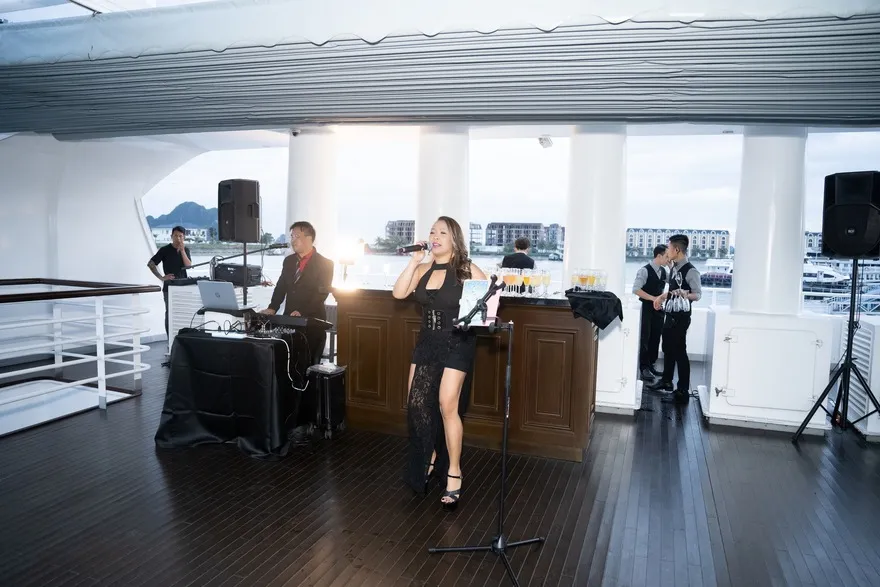 Bên cạnh màn trình diễn đỉnh cao này, không khí trên du thuyền luôn được duy trì sôi động và đa dạng bởi các tiết mục hấp dẫn khác. Ban nhạc Phi-lip-pin chuyên nghiệp, với kinh nghiệm biểu diễn quốc tế và kỹ năng điêu luyện, sẽ khuấy động không gian bằng những bản nhạc Latin sôi nổi, Pop US-UK quen thuộc hay những giai điệu Ballad trữ tình, phù hợp với từng thời điểm và không khí của hải trình, từ lúc đón khách đến khi thư giãn ngắm cảnh đêm. Đan xen vào đó, không gian có thể trở nên lãng mạn, tinh tế hơn với tiếng đàn violin réo rắt hay những phím dương cầm du dương vang lên trong khu vực nhà hàng hoặc sảnh chờ. Đôi khi, bạn còn có thể bắt gặp những màn trình diễn vũ đạo cuốn hút hoặc trầm trồ trước kỹ năng pha chế cocktail điêu luyện như một màn trình diễn nghệ thuật từ các bartender tài năng tại quầy bar.