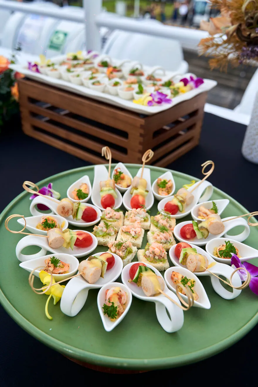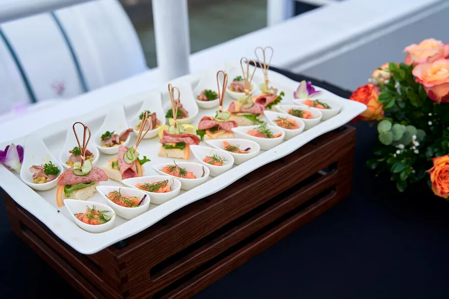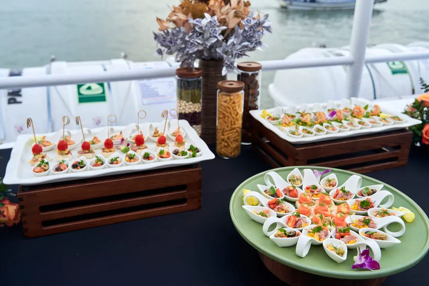 Tiệc tiệc canapé nhẹ nhàng với đồ uống chào mừng khi du khách lên du thuyền Paradise Delight