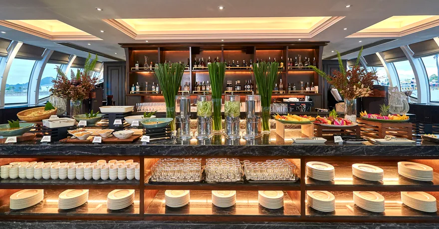 Bên cạnh các hoạt động khám phá, du khách còn được thưởng thức tiệc buffet thịnh soạn với hàng trăm món ăn đa dạng từ đặc sản Hạ Long đến tinh hoa ẩm thực thế giới. Khi kết thúc chuyến tham quan và trở lại du thuyền, không gian trà chiều hoàng hôn lãng mạn kết hợp cùng chương trình Happy Hour (mua 01 tặng 01) sẽ là nốt lặng tuyệt vời để bạn vừa nhâm nhi đồ uống, vừa chiêm ngưỡng khoảnh khắc rạng rỡ nhất của vịnh di sản trước khi tàu quay trở lại bến.