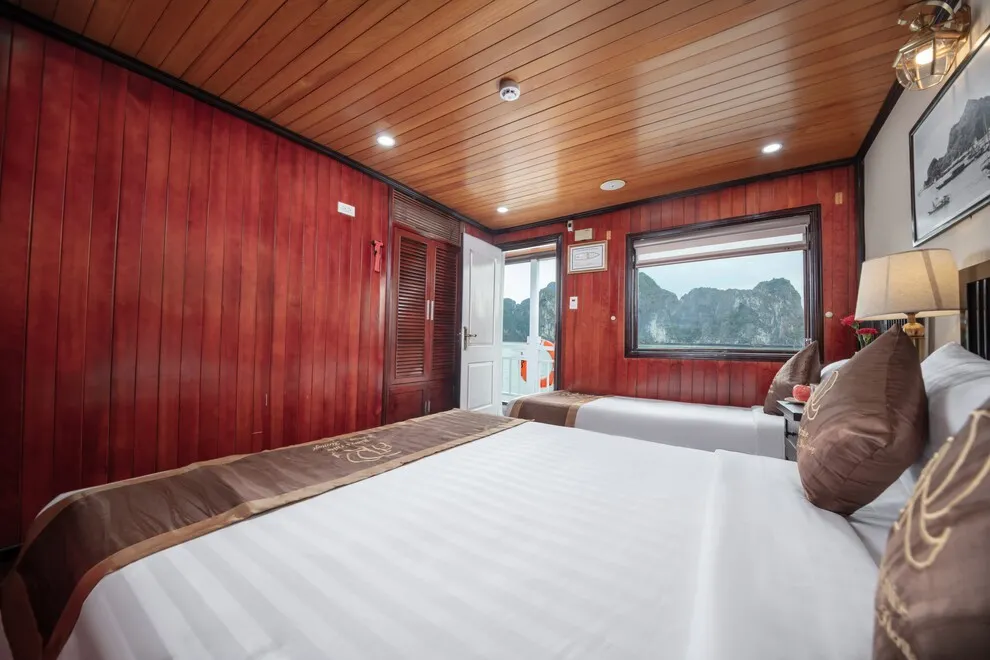 Hệ thống cabin trên Ruby Cruise được thiết kế khéo léo để đảm bảo sự thoải mái với trang thiết bị chuẩn 3-4 sao. Phòng Deluxe (Tiêu chuẩn) nằm tại tầng 1 với diện tích 16m², sở hữu sàn gỗ cứng ấm cúng và cửa sổ hướng biển. Phòng Suite (Cao cấp) tọa lạc tại tầng 2 với diện tích rộng rãi từ 20m² – 25m², mang lại tầm nhìn thoáng đãng hơn, một số phòng được trang bị bồn tắm nằm. Đặc biệt, hạng phòng Family (Gia đình) có diện tích lên tới 26.9m², bố trí 01 giường đôi lớn và 01 giường đơn, là giải pháp lý tưởng cho gia đình nhỏ. Mỗi cabin đều là không gian khép kín với điều hòa 2 chiều, phòng tắm riêng, máy sấy tóc và các trang thiết bị an toàn như áo phao, búa thoát hiểm. Một điểm thú vị là một số phòng chủ đích không trang bị Tivi để khuyến khích du khách tận hưởng thiên nhiên.