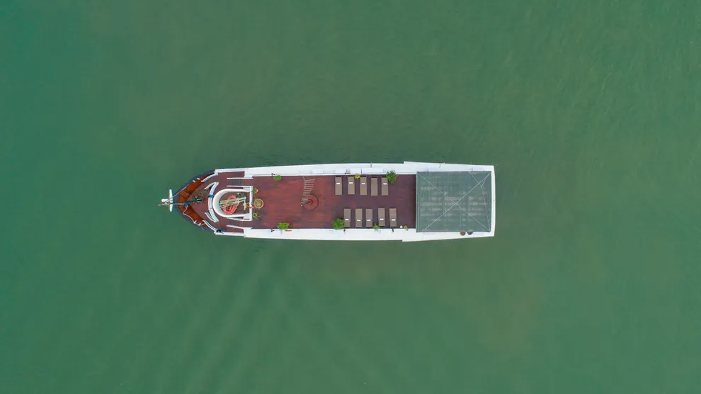 Không chạy theo xu hướng “khách sạn nổi” khổng lồ, Ruby Cruise chọn cho mình một lối đi riêng với ngôn ngữ thiết kế tôn vinh những giá trị truyền thống. Điểm nhận diện đặc trưng nhất chính là phần vỏ tàu được chế tác hoàn toàn từ gỗ tự nhiên địa phương (Local Timber). Chất liệu này không chỉ có khả năng chịu mặn tốt, đảm bảo an toàn hàng hải mà còn mang lại màu nâu trầm mặc, tạo nên nét đẹp Á Đông cổ điển. Cấu trúc tàu được quy hoạch khoa học thành 03 tầng riêng biệt để tối ưu hóa trải nghiệm: Tầng 1 là khu vực phòng ngủ chính và lễ tân; Tầng 2 kết hợp phòng nghỉ hạng sang, nhà hàng và quầy bar; Tầng 3 là Sundeck thoáng đãng. Với quy mô “boutique” nhỏ gọn gồm hai phiên bản 12 cabin và 14 cabin, Ruby Cruise giới hạn sức chứa chỉ từ 24 đến 35 khách. Điều này giúp con tàu dễ dàng len lỏi vào các khu vực nước nông, hang động nhỏ mà tàu lớn không thể tiếp cận.
