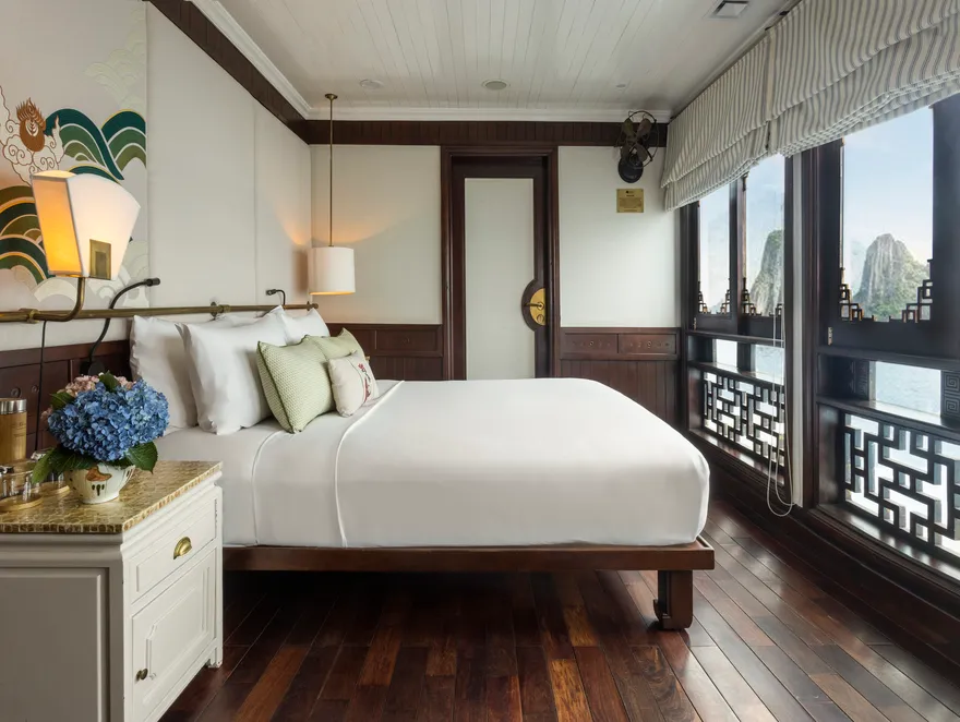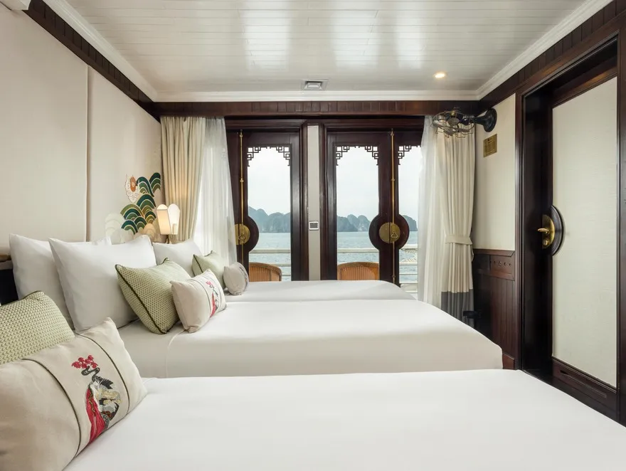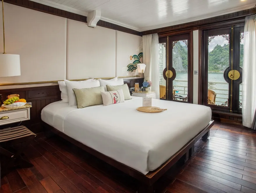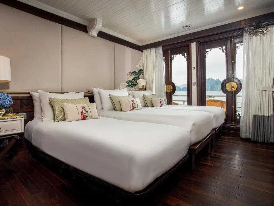 Không gian nghỉ dưỡng của The Âu Cơ bao gồm 32 cabin sang trọng, nơi mỗi phòng được thiết kế như một phòng khách sạn 5 sao di động trên mặt biển. Điểm nhấn nổi bật nhất là việc trang bị ban công riêng cho toàn bộ 100% các phòng nghỉ, thể hiện sự am hiểu về tâm lý khách du lịch hạng sang luôn khao khát không gian riêng tư để kết nối với thiên nhiên. Các hạng phòng Deluxe và Grand Deluxe sở hữu diện tích 20$m^2 với nội thất gỗ tối màu ấm cúng, trong khi hạng Executive gây ấn tượng với cửa kính trượt từ trần đến sàn mang lại tầm nhìn panorama không giới hạn. Đẳng cấp nhất là hai căn Suite mang tên Long Quân và Âu Cơ rộng 36 m^2 nằm tại mũi tàu, cung cấp góc nhìn 180 độ và được trang bị nhiều tiện nghi thượng lưu như bồn tắm nằm cao cấp và ghế tắm nắng riêng.