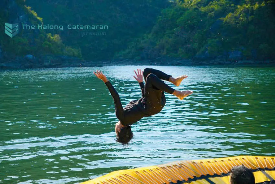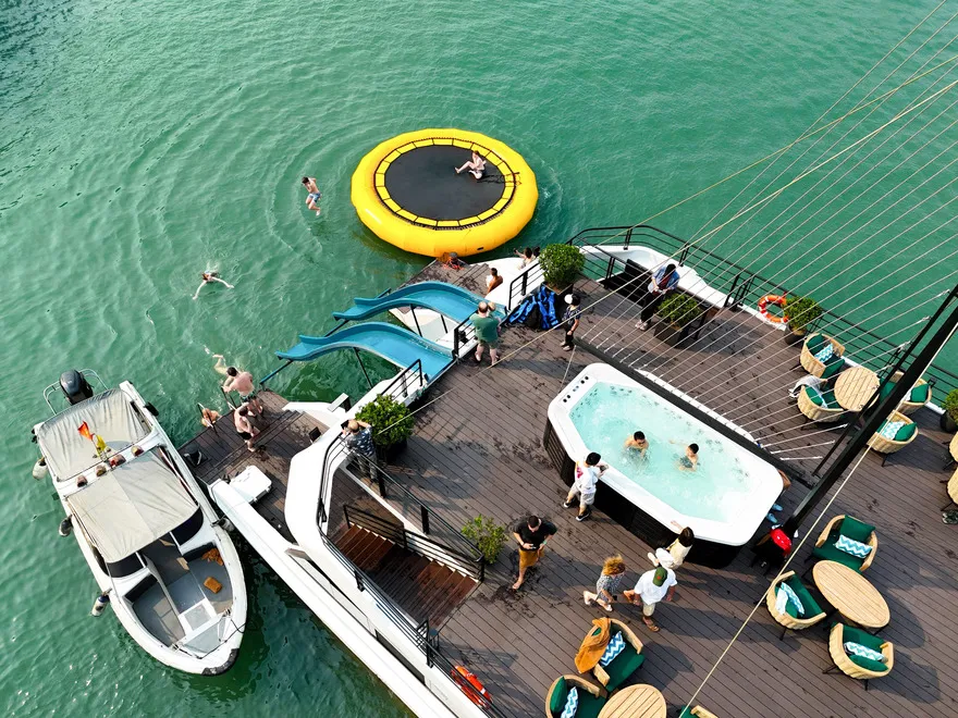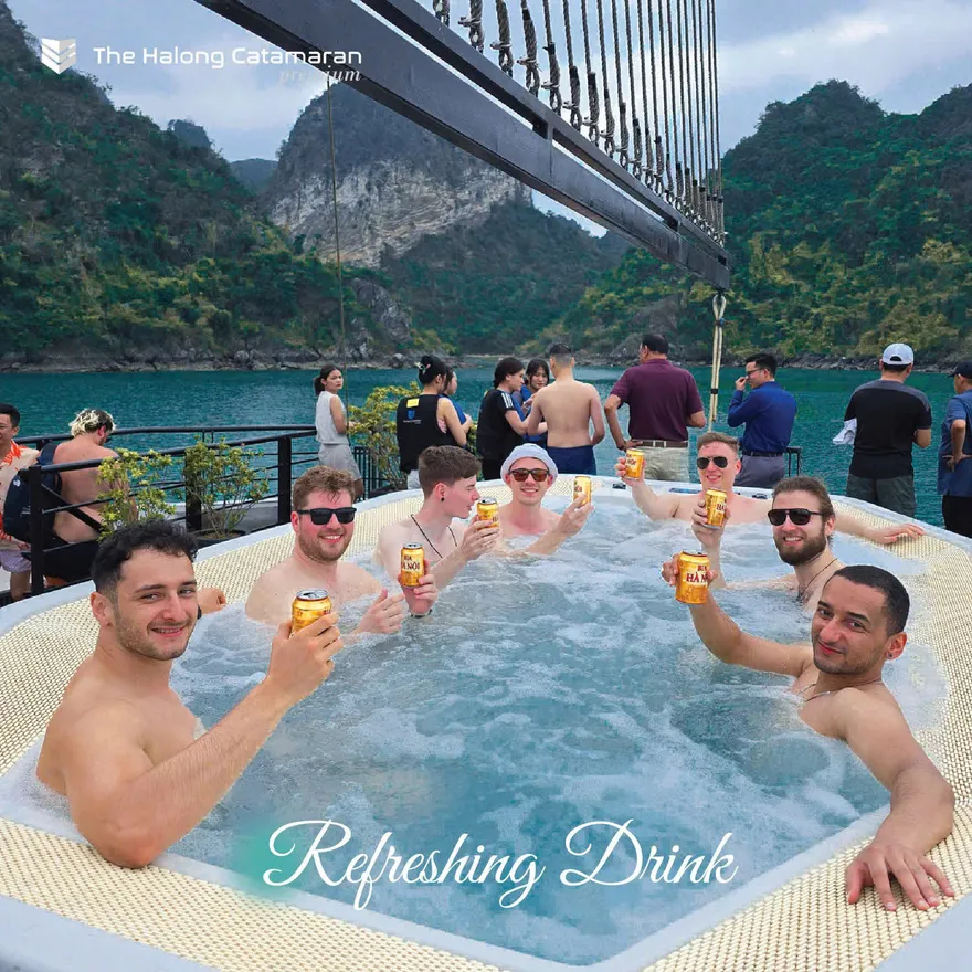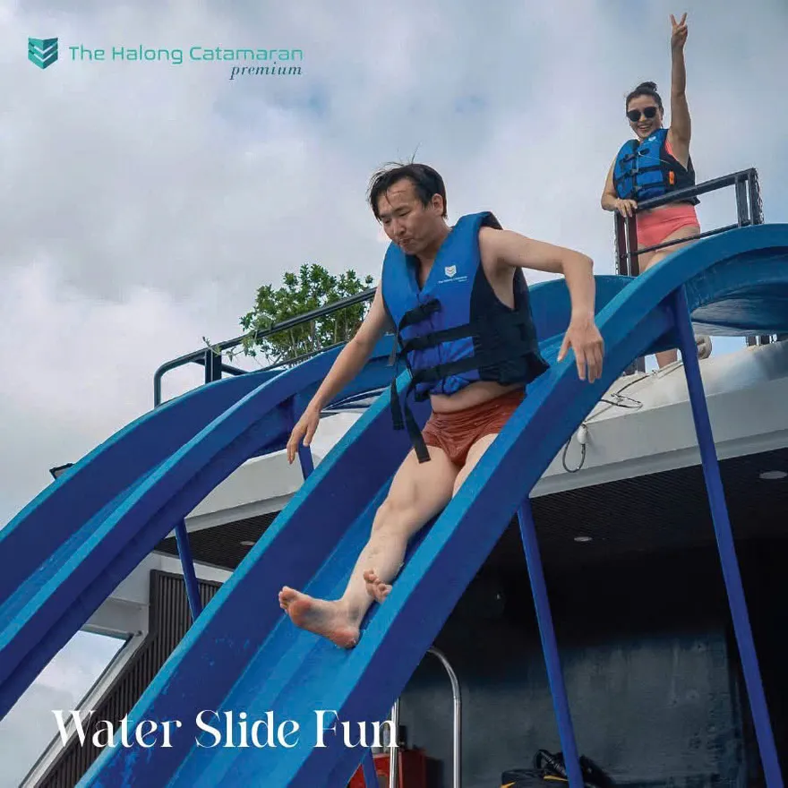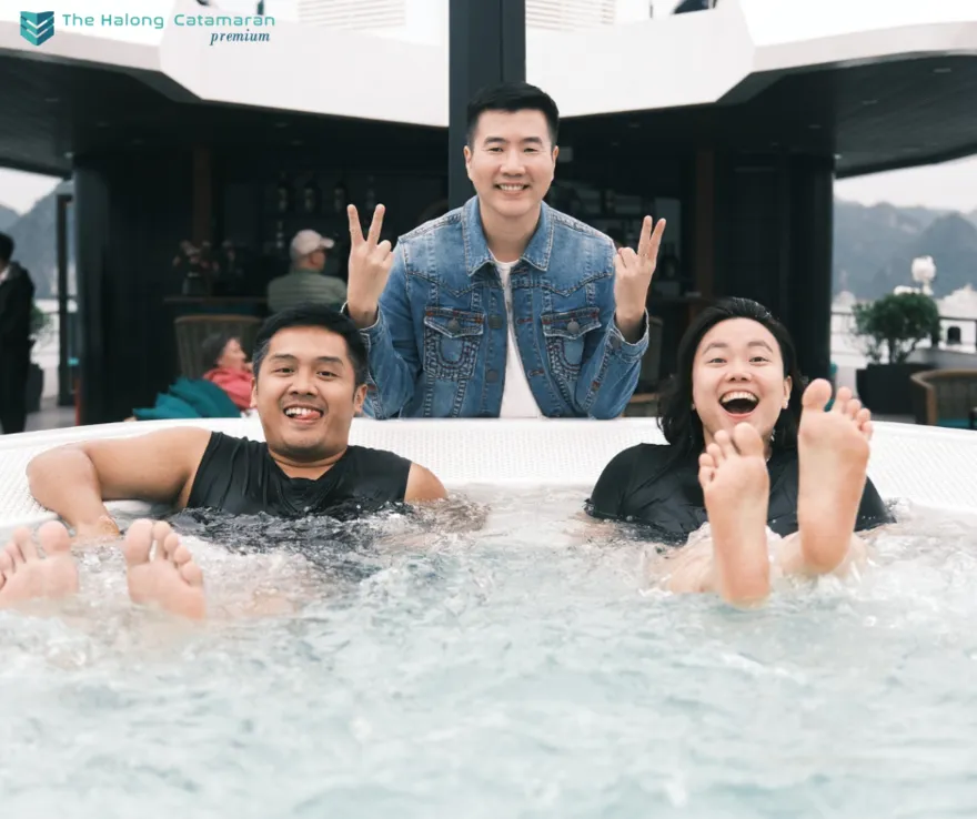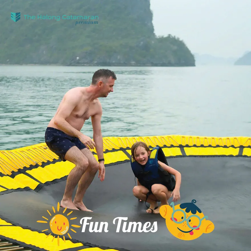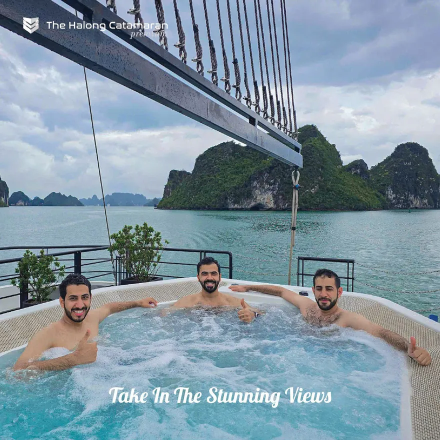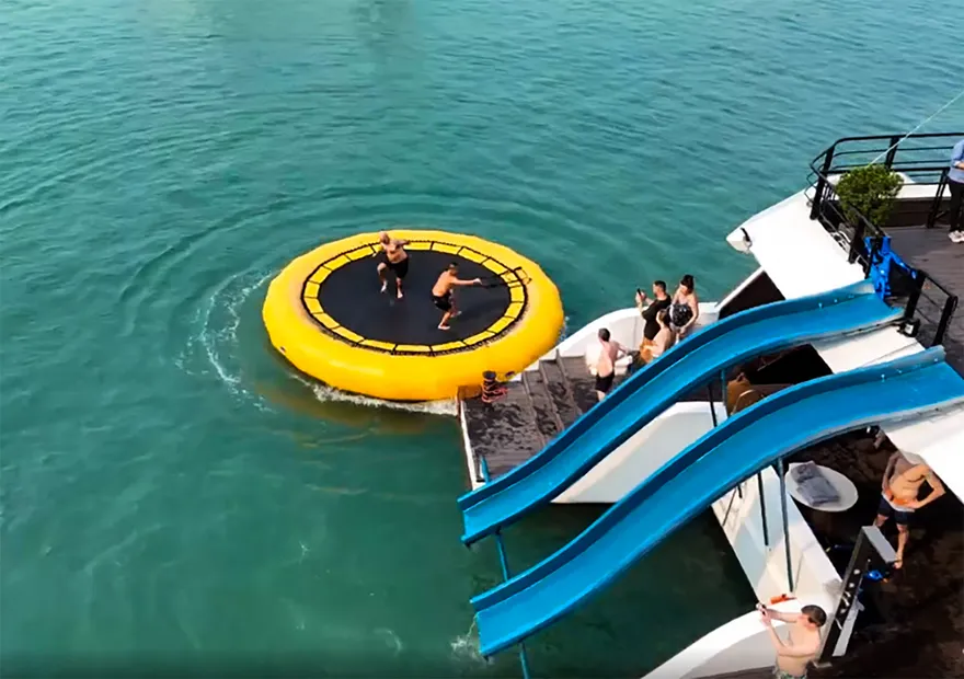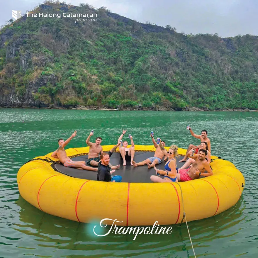 Điều thực sự làm nên danh xưng “Premium” chính là hệ thống tiện ích đẳng cấp, được thiết kế để nuông chiều mọi cung bậc cảm xúc của du khách. Điểm nhấn đắt giá nhất trong phiên bản nâng cấp này chính là bể sục Jacuzzi ngoài trời, nơi bạn có thể vừa thả mình trong làn nước ấm áp, vừa phóng tầm mắt ngắm nhìn cảnh sắc hùng vĩ của vịnh biển, mang lại một cảm giác thư giãn thượng lưu thực thụ. Đối với những tâm hồn yêu thích sự sôi động, khu vực giải trí trên biển chắc chắn sẽ là “thiên đường” với hệ thống máng trượt nước khổng lồ từ mạn tàu xuống biển, phao nổi và trampoline (lưới bật nhảy) đầy phấn khích. Đặc biệt, những tấm lưới hammock trắng tinh khôi không chỉ là nơi nghỉ ngơi lý tưởng mà còn là góc “check-in” sang chảnh, giúp bạn lưu giữ những khung hình đậm chất nghỉ dưỡng cao cấp.