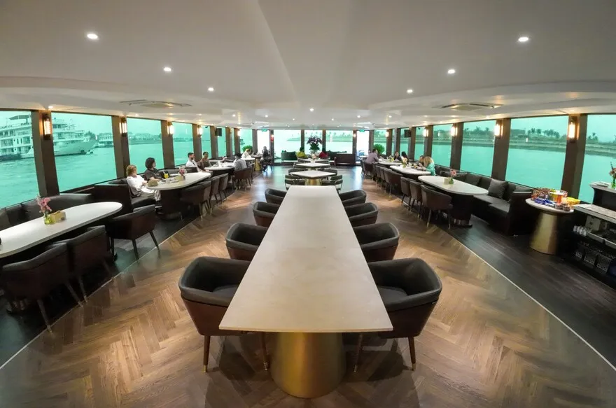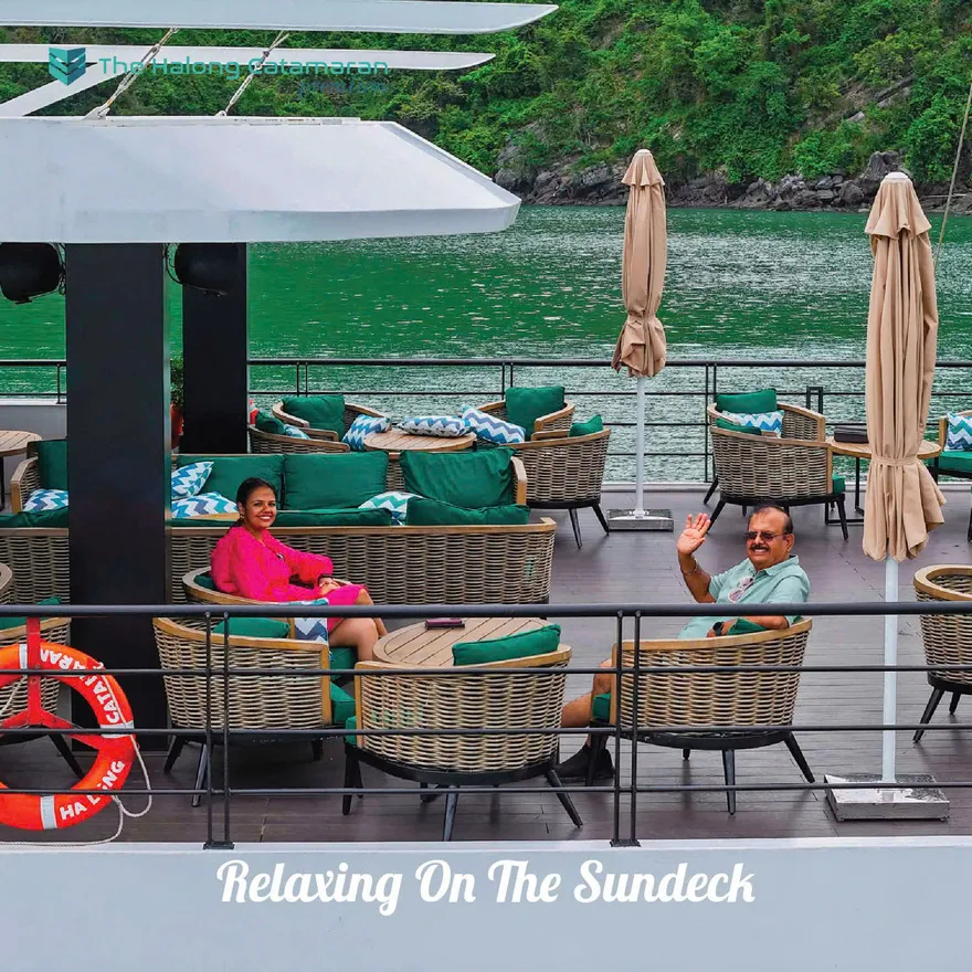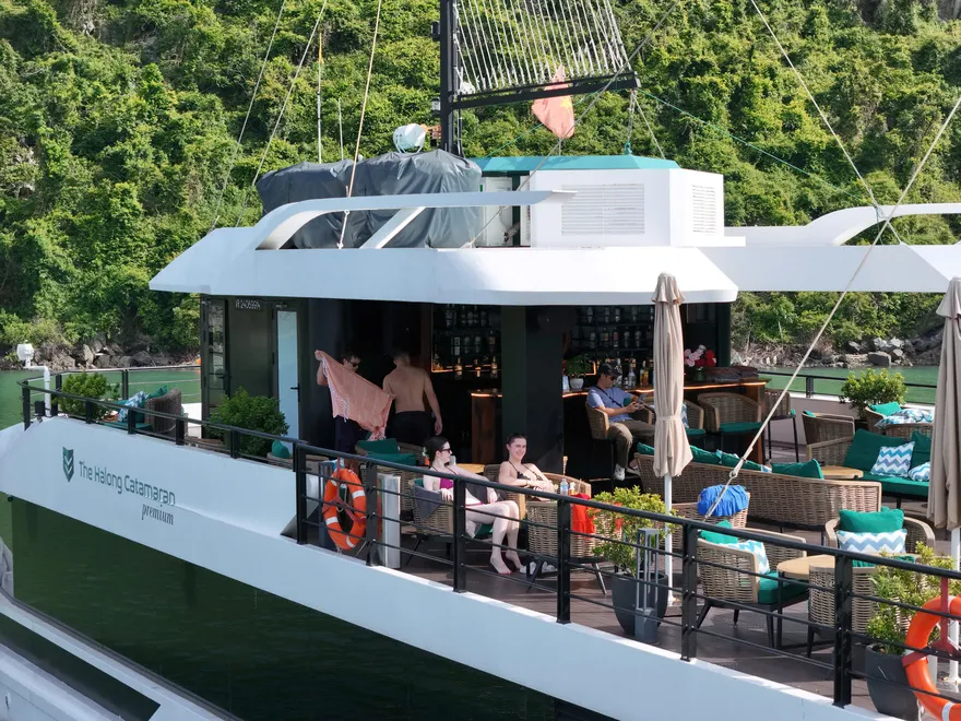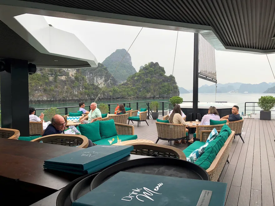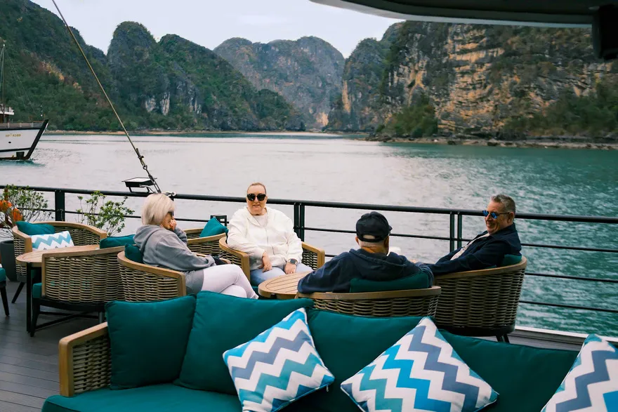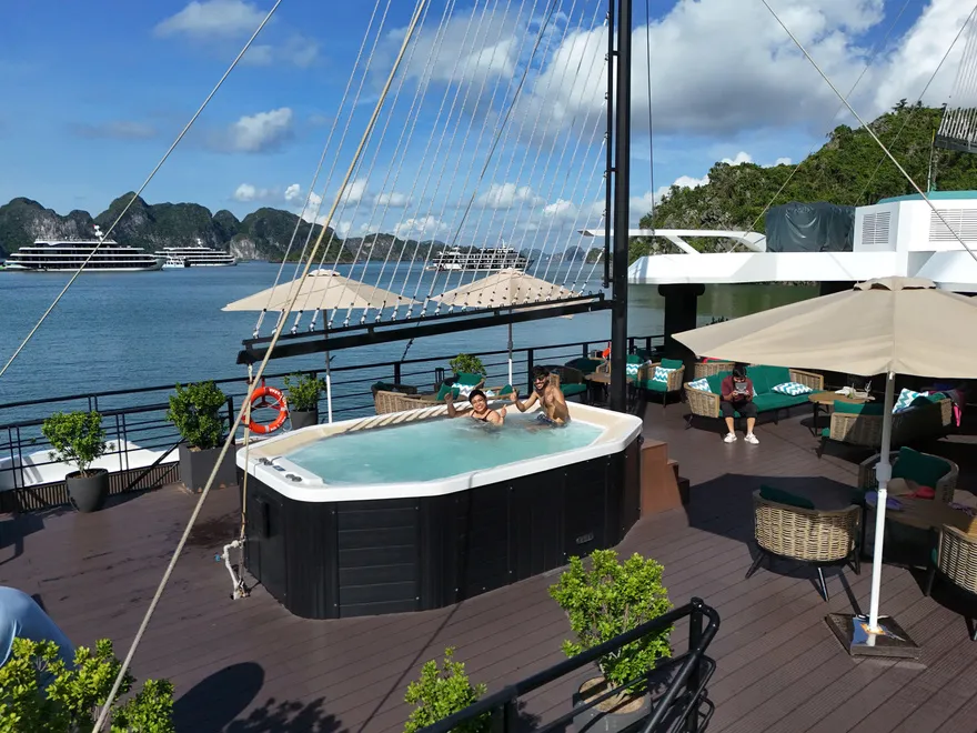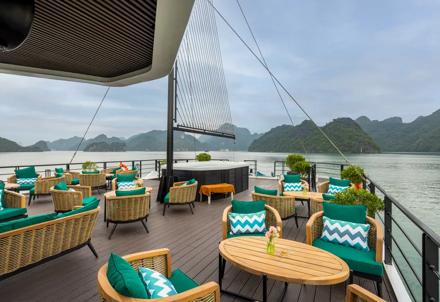 Không gian sundeck rộng rãi chính là linh hồn của con tàu, nơi được ví như một “sân khấu” tuyệt mỹ để chiêm ngưỡng kỳ quan. Với thiết kế khoáng đạt theo phong cách Châu Âu, đây là vị trí lý tưởng nhất để du khách tham dự tiệc trà hoàng hôn (Sunset Party). Giữa không gian lãng mạn khi mặt trời dần buông, việc nhâm nhi tách trà ấm cùng trái cây tươi và bánh ngọt miễn phí sẽ biến những phút giây cuối ngày trở thành một kỷ niệm khó quên trong lòng mỗi lữ khách.