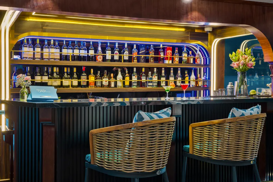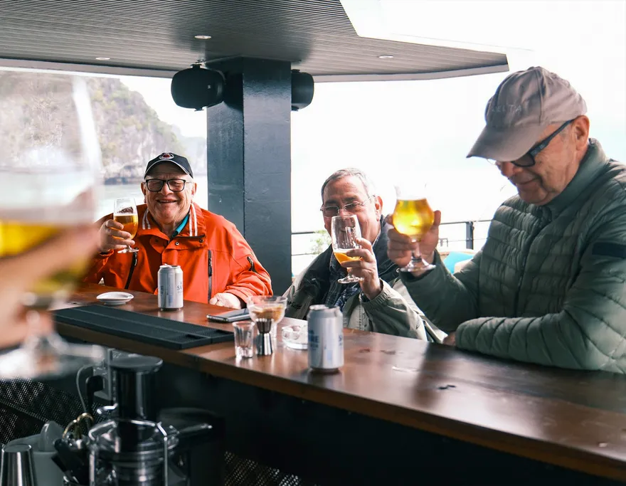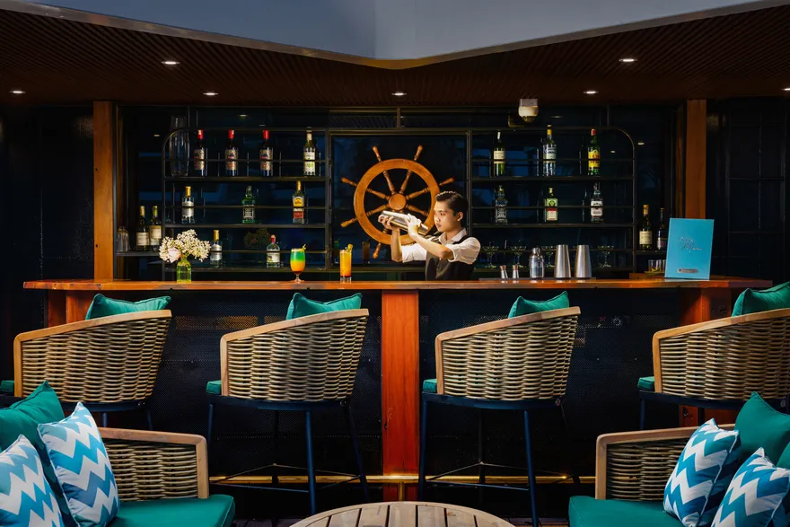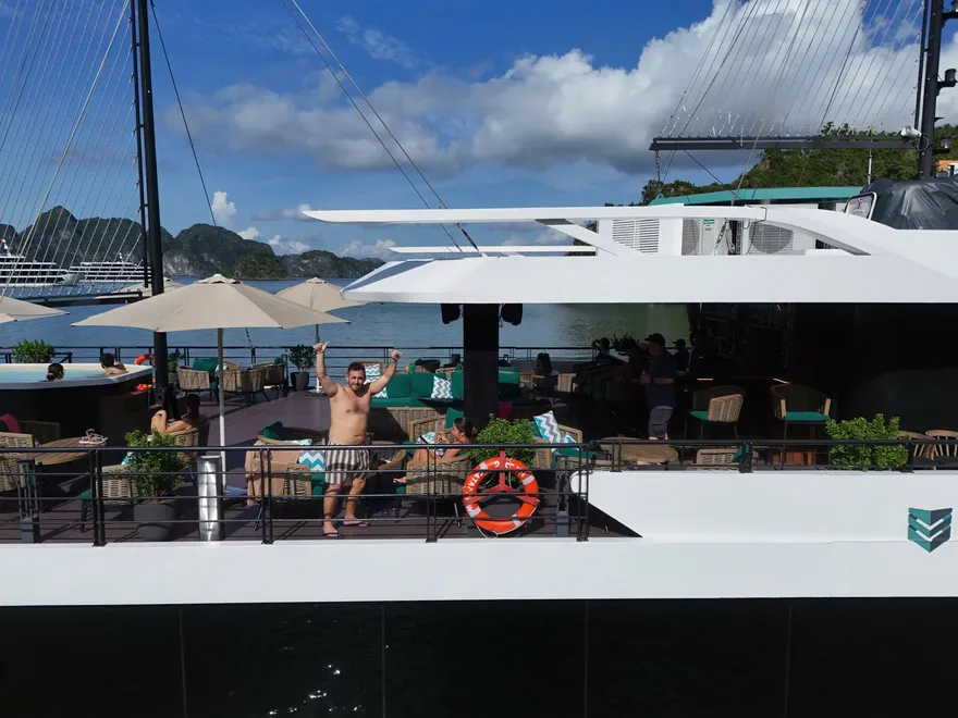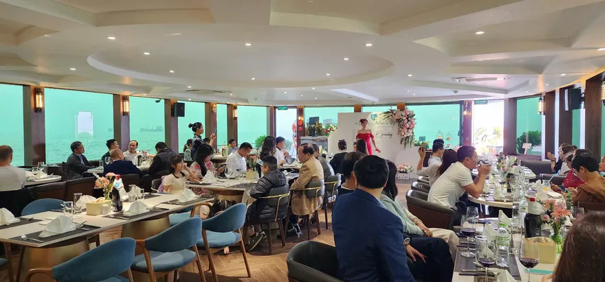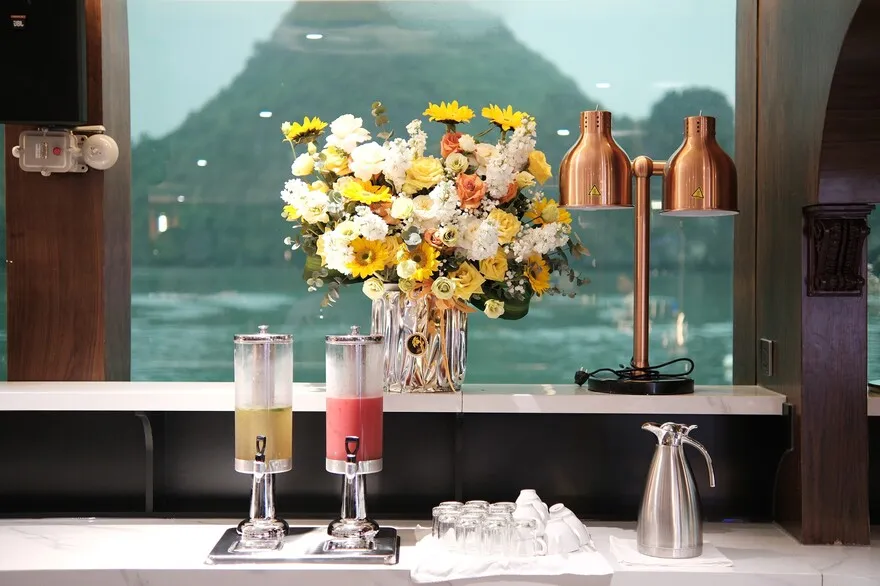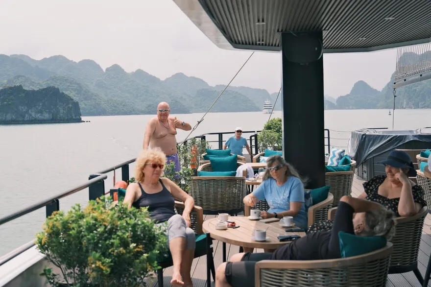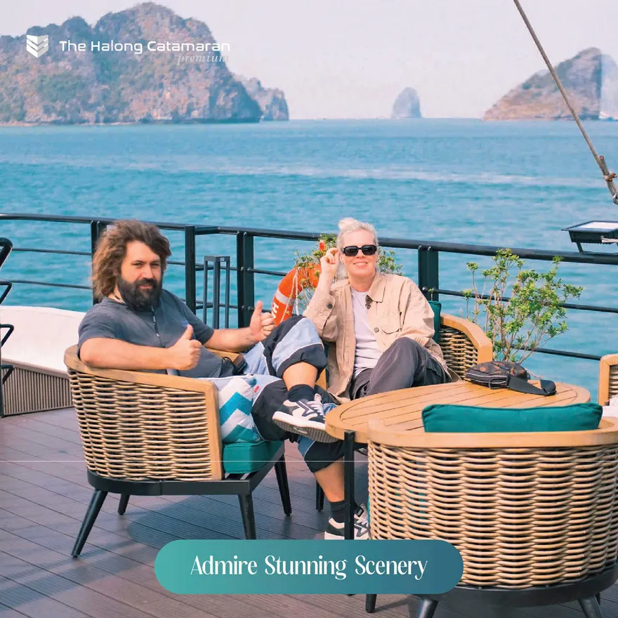 Không gian sundeck rộng rãi chính là linh hồn của con tàu, nơi được ví như một “sân khấu” tuyệt mỹ để chiêm ngưỡng kỳ quan. Với thiết kế khoáng đạt theo phong cách Châu Âu, đây là vị trí lý tưởng nhất để du khách tham dự tiệc trà hoàng hôn (Sunset Party). Giữa không gian lãng mạn khi mặt trời dần buông, việc nhâm nhi tách trà ấm cùng trái cây tươi và bánh ngọt miễn phí sẽ biến những phút giây cuối ngày trở thành một kỷ niệm khó quên trong lòng mỗi lữ khách.
