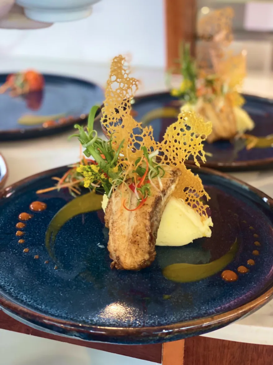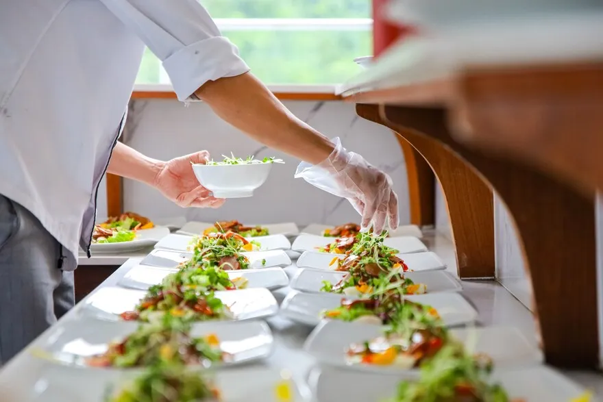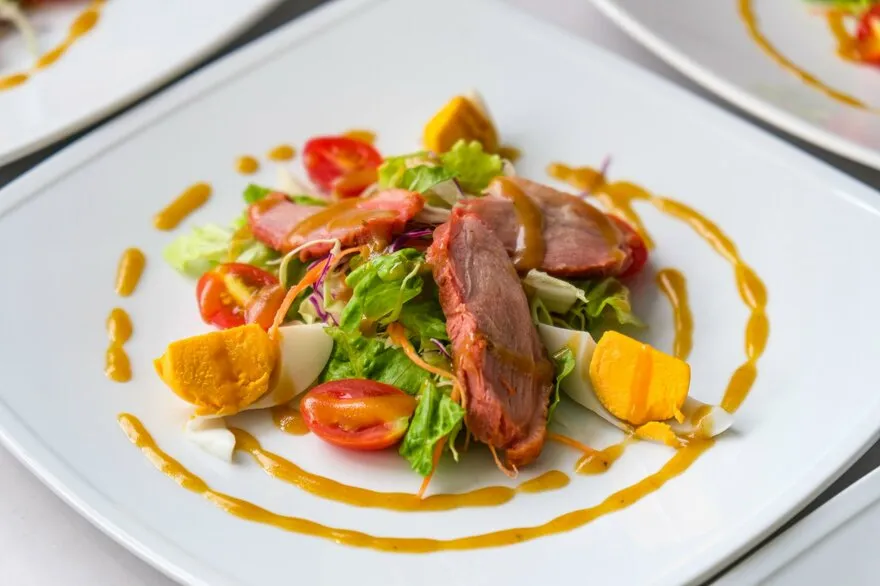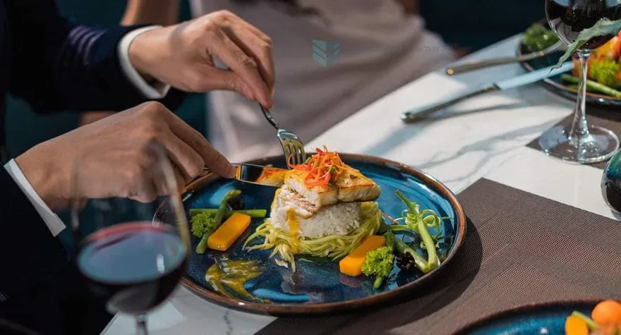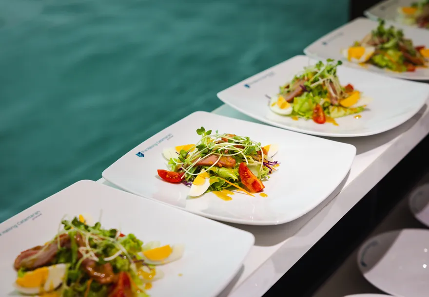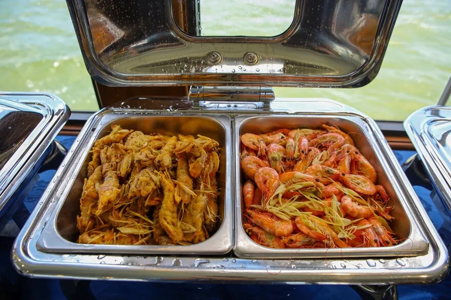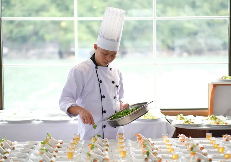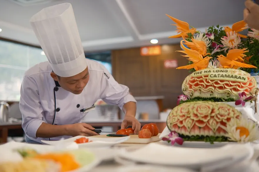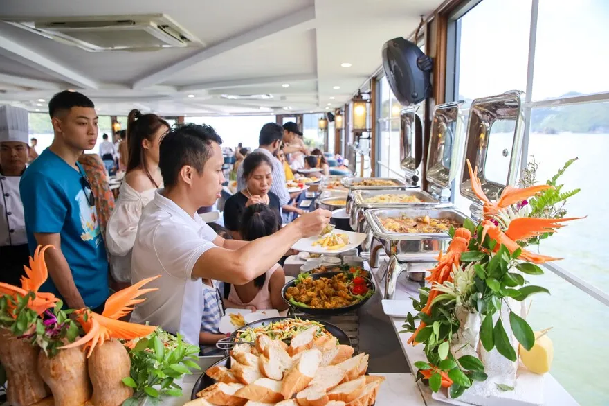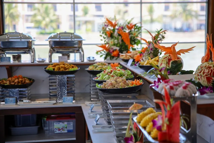 Trải nghiệm trên du thuyền The Halong Catamaran Premium sẽ không thực sự trọn vẹn nếu thiếu đi sự thăng hoa của ẩm thực, nơi mỗi món ăn được chuẩn bị bởi đội ngũ đầu bếp tài năng nhằm mang đến một “đại tiệc” vị giác giữa lòng di sản. Đối với các đoàn khách lớn (thường từ trên 40 đến 50 người), du thuyền phục vụ thực đơn Buffet thượng hạng với sự góp mặt của hơn 20 món ăn phong phú, kết hợp hài hòa giữa hải sản tươi sống và đặc sản địa phương. Bạn sẽ được thưởng thức những hương vị đặc trưng như bề bề rang muối Hồng Kông đậm đà, salad xoài non với sứa biển Hạ Long giòn sần sật hay hàu sữa Hạ Long hấp sả thơm nồng, tất cả đều được chế biến tinh tế để giữ trọn độ tươi ngon từ đại dương.