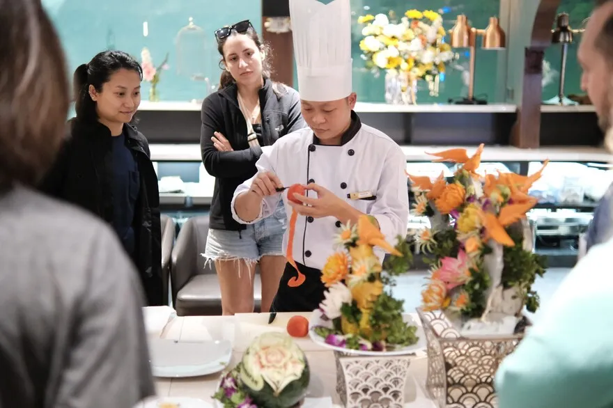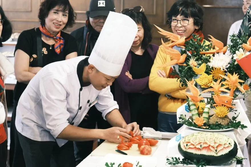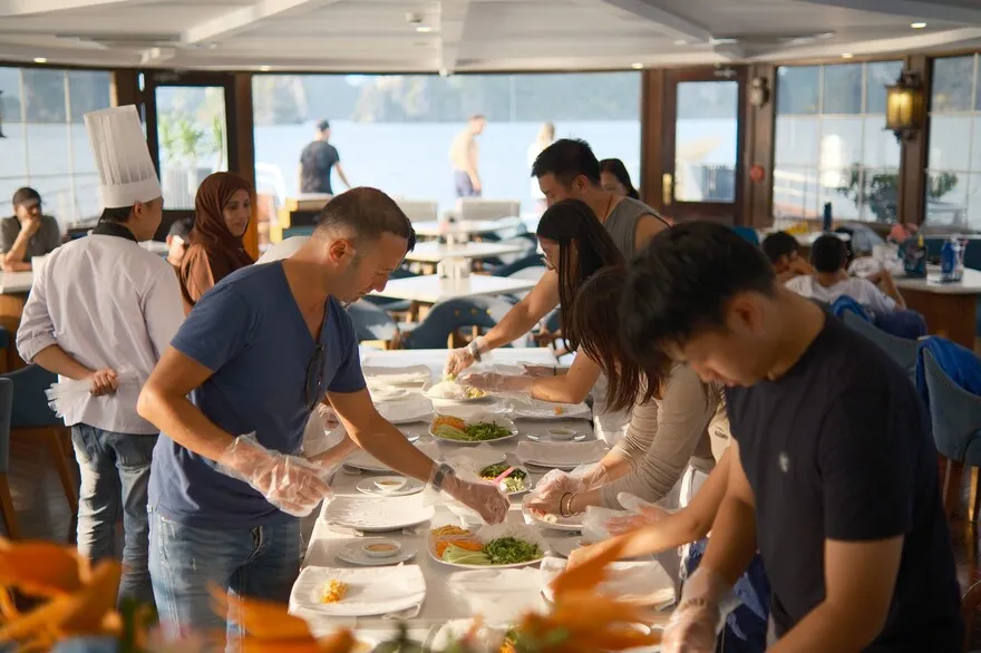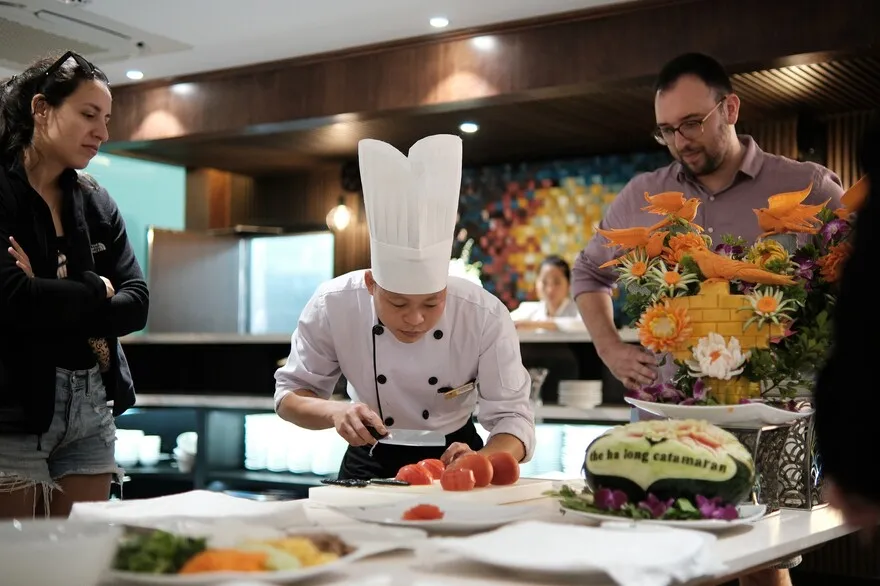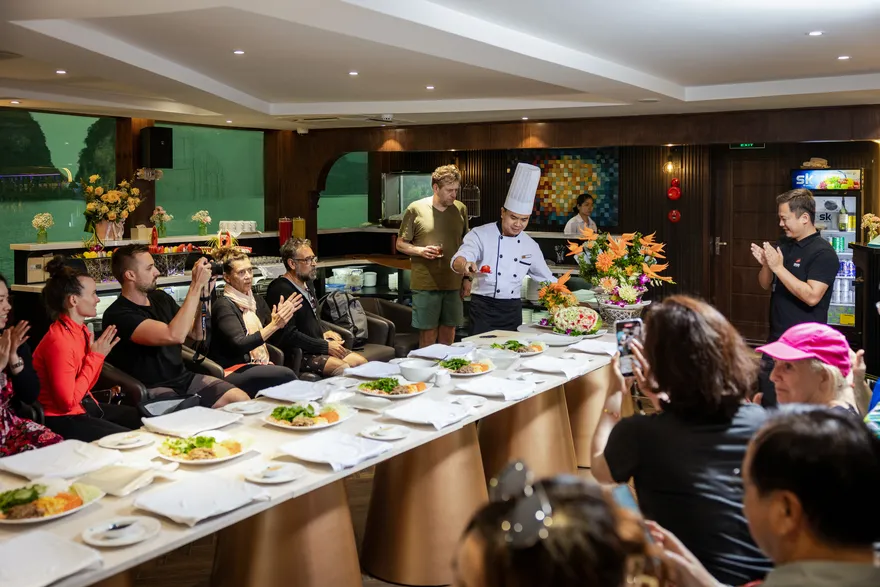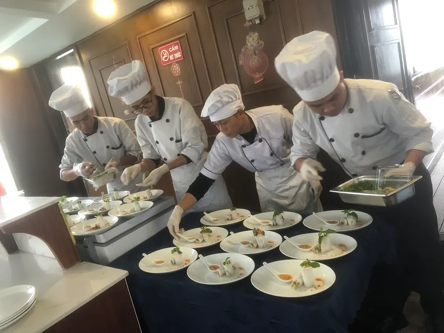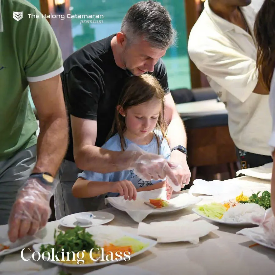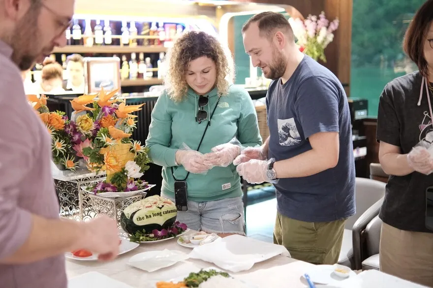 Không chỉ dừng lại ở việc thưởng ngoạn cảnh sắc, chuyến đi còn mang đến những trải nghiệm văn hóa đầy tinh tế. Bạn sẽ có cơ hội tham gia lớp học nấu ăn, tự tay chế biến món nem tươi cuốn truyền thống – một biểu tượng ẩm thực trứ danh của Việt Nam dưới sự hướng dẫn của đầu bếp chuyên nghiệp. Khi ánh hoàng hôn dần buông xuống, tiệc trà Sunset Party với trà, trái cây và bánh ngọt phục vụ miễn phí sẽ là khoảnh khắc lắng đọng nhất, cho phép bạn cùng những người thân yêu tận hưởng vẻ đẹp huyền ảo của vịnh biển trong không gian sang trọng và bình yên.
