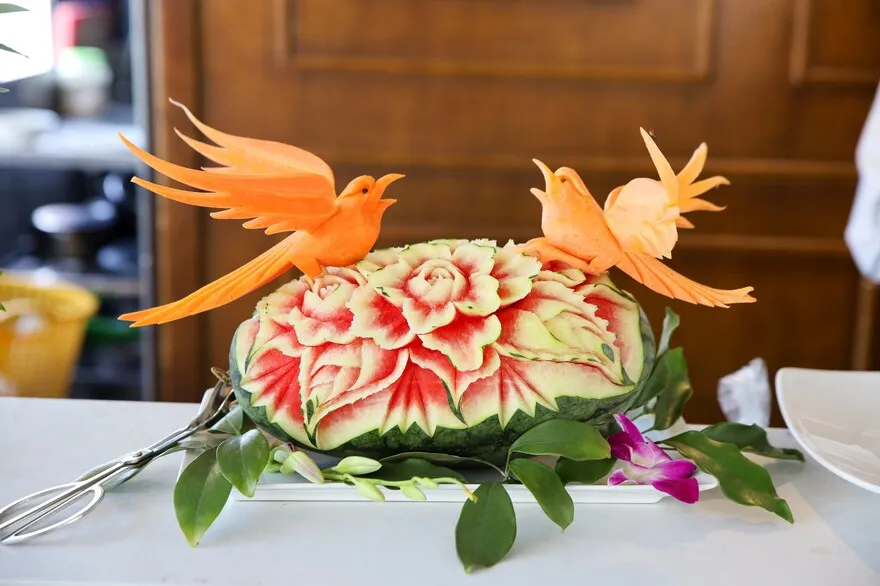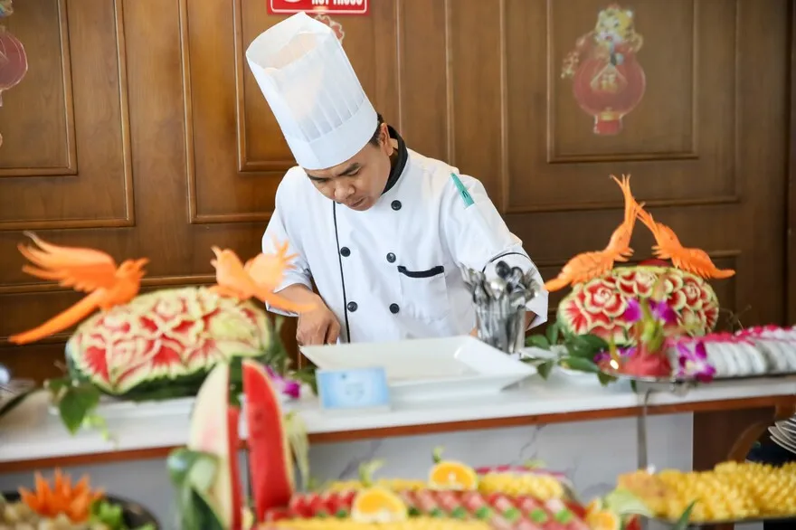 Đầu bếp cắt tỉa trang trí đồ ăn