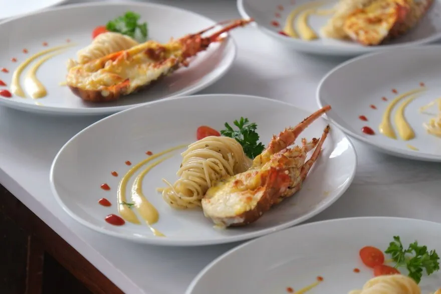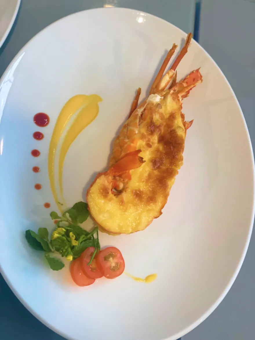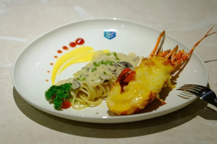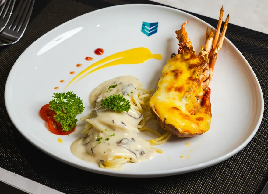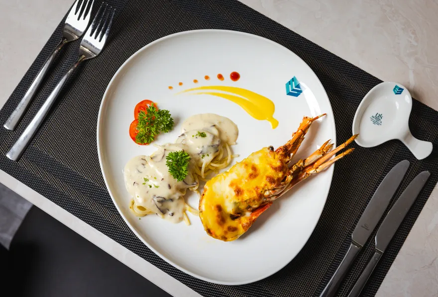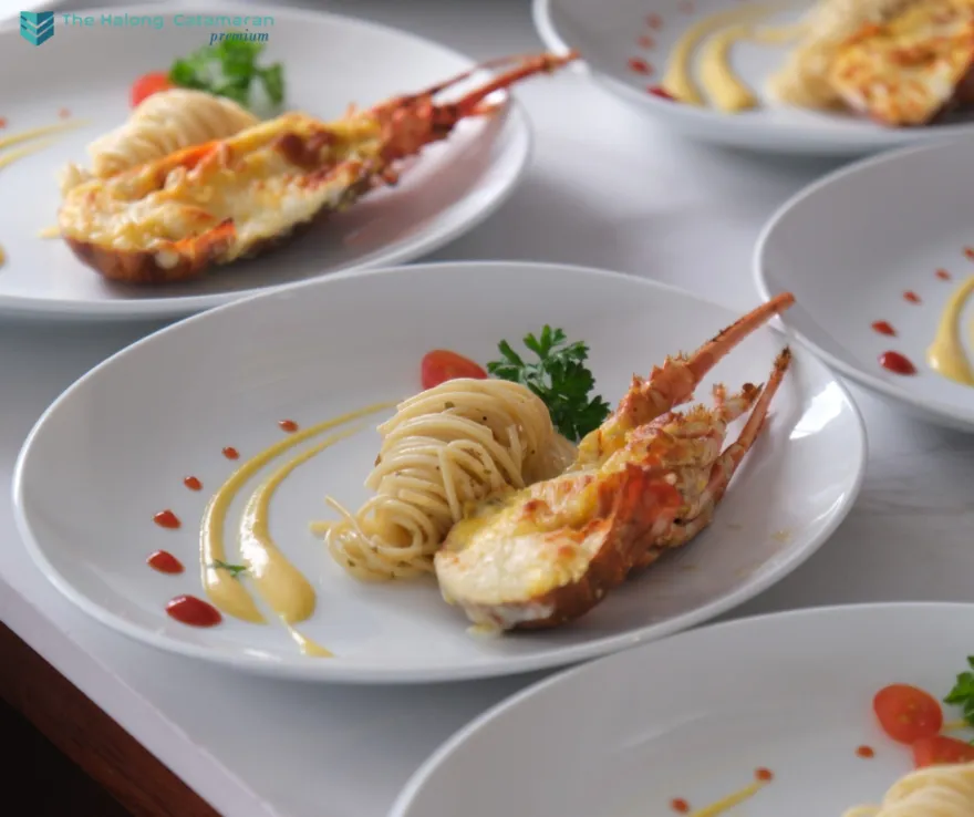 Nếu bạn đi theo nhóm nhỏ riêng tư hơn (dưới 40 đến 50 khách), hành trình ẩm thực lại càng trở nên đẳng cấp với các lựa chọn Set Menu được thiết kế tỉ mỉ. Điểm nhấn “vàng” trong thực đơn cao cấp này chính là món Tôm hùm nướng sốt phô mai trứng muối béo ngậy, ăn kèm mỳ Ý sốt kem nấm mượt mà – một sự kết hợp đầy ngẫu hứng giữa nguyên liệu quý của biển cả và phong cách chế biến phương Tây sang trọng. Đây chính là khoảnh khắc bạn có thể vừa thưởng thức bữa trưa thượng hạng, vừa thong dong ngắm nhìn những rặng núi đá vôi kỳ vĩ trôi qua khung cửa.