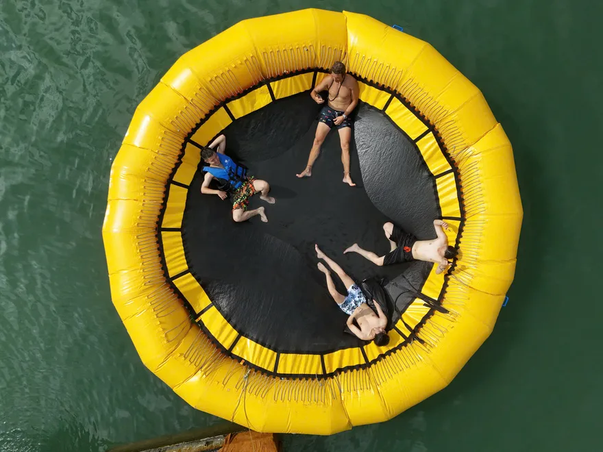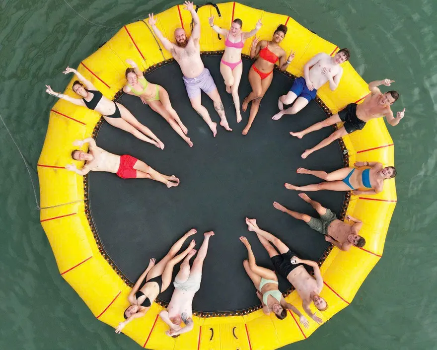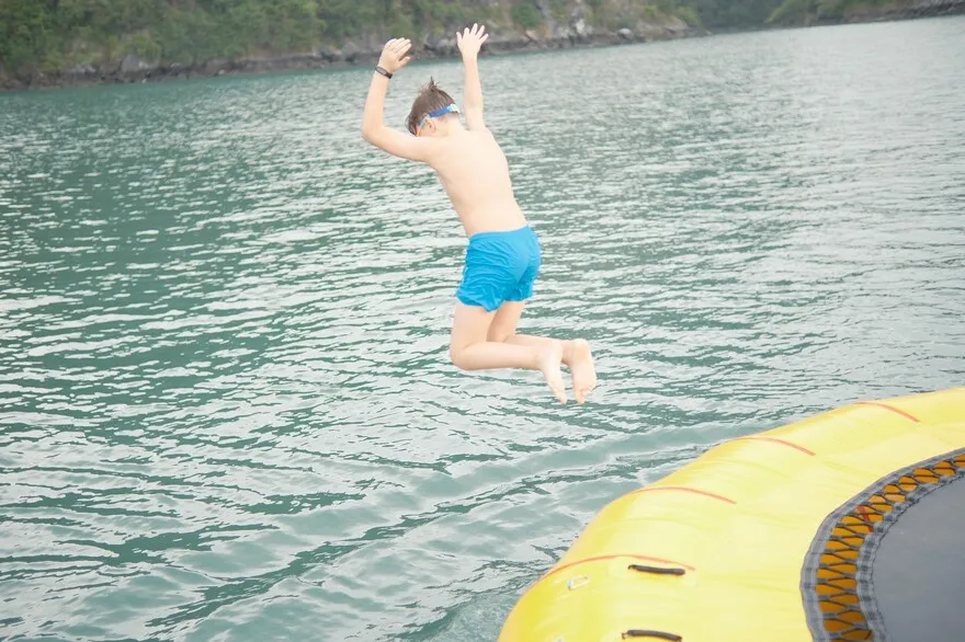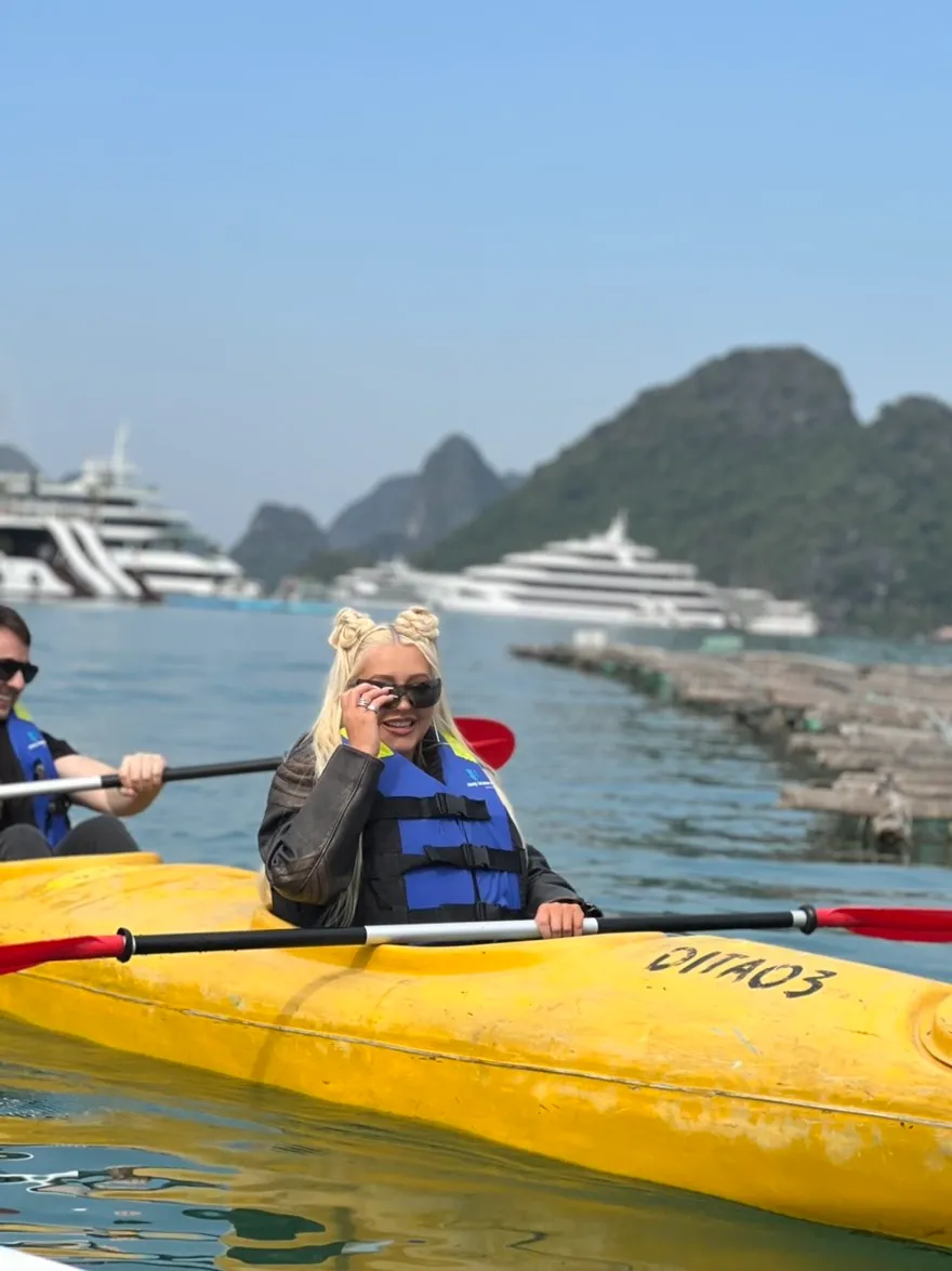 Hoạt động trải nghiệm tại khu vực Ao Ếch (Vịnh Lan Hạ). Du khách có thể chèo thuyền Kayak khám phá vịnh, bơi lội hoặc vui chơi với cầu trượt nước và phao nổi.