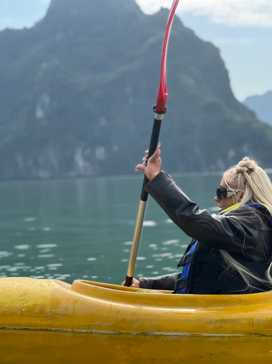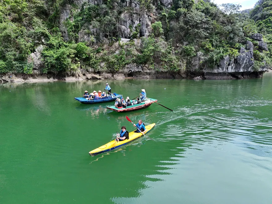 Khám phá Hang Sáng Tối, một khu vực đầm phá biệt lập bao quanh bởi núi đá vôi hùng vĩ bằng thuyền Kayak hoặc thuyền nan .