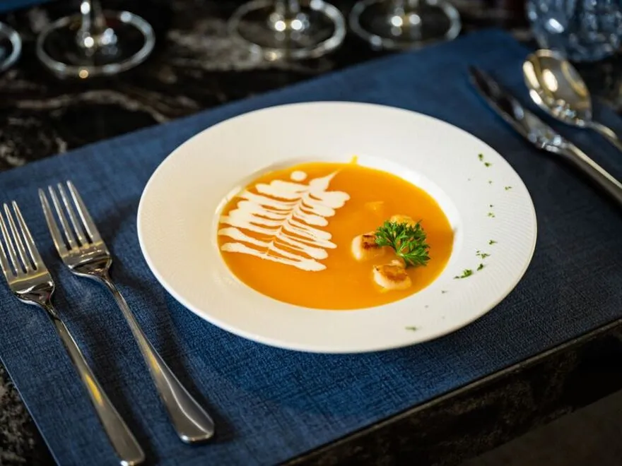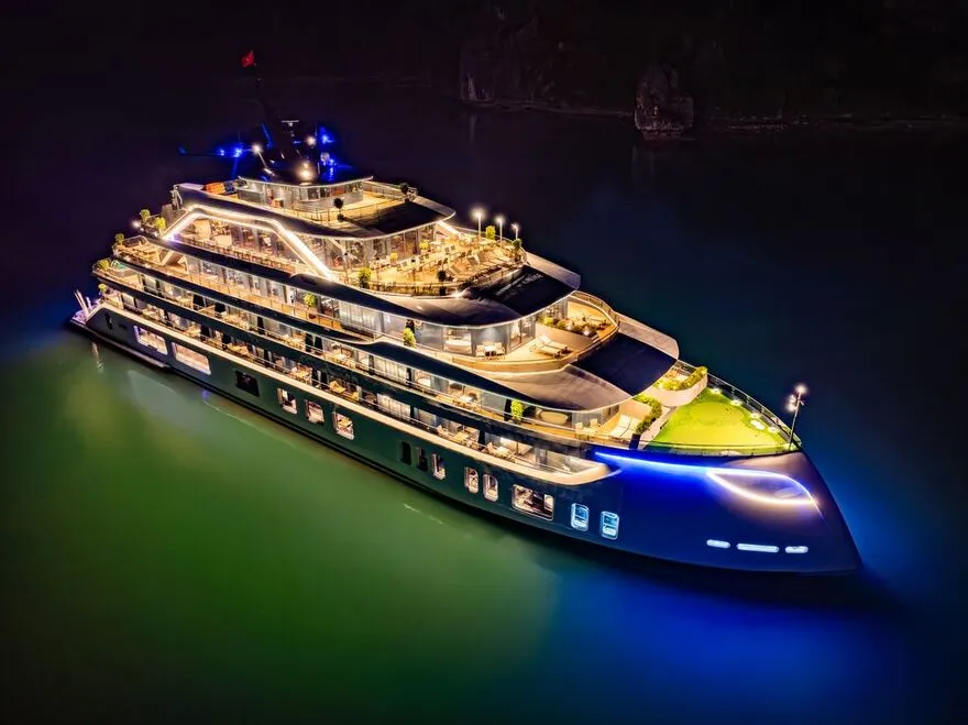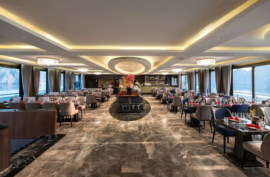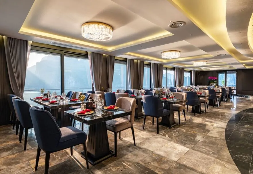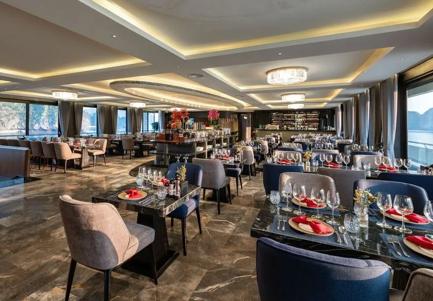 Điểm nhấn thượng lưu nhất chính là bữa tối Fine Dining theo phong cách quý tộc, nơi thực khách được thưởng thức những set menu đẳng cấp trong không gian nhà hàng Signature tầng 4. Thực đơn tối là cuộc trình diễn của các nguyên liệu xa xỉ như Tôm hùm bỏ lò phô mai ăn kèm mỳ Ý sốt kem nấm, Thăn lưng bò Nhật (Beef Fuji) nướng sốt tiêu xanh hay Súp bí ngô hầm cồi sò điệp và hạt dẻ. Sau bữa tối, Sky Bar tại tầng 5 là nơi du khách có thể nhâm nhi những ly cocktail sáng tạo như “I’m Vietnamese” hay “Dragon Legend”, trong khi ngắm nhìn toàn cảnh vịnh Lan Hạ về đêm. Sự cá nhân hóa trong phục vụ và thực đơn đa dạng cho cả trẻ em lẫn người ăn chay đã biến Tulip Cruise thành một thiên đường ẩm thực thực thụ trên sóng nước.