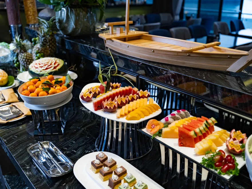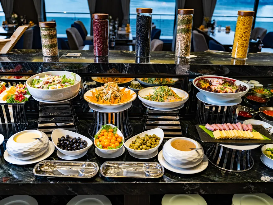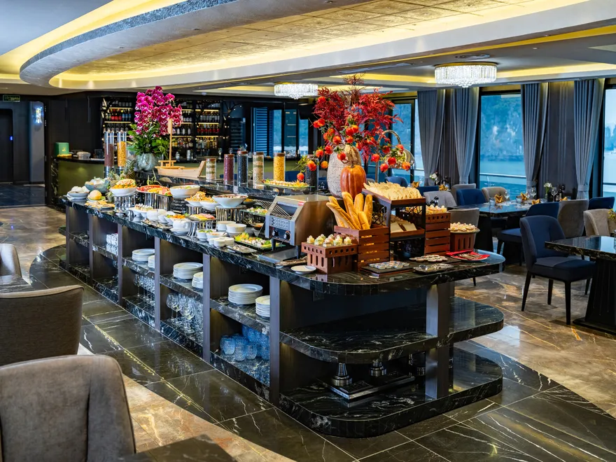 Hệ thống ẩm thực trên Tulip Cruise là một hành trình văn hóa Đông – Tây đầy tinh tế, bắt đầu từ bữa sáng lúc 06:45 với thực đơn buffet đa dạng từ Phở bò/gà truyền thống đến ngũ cốc và trái cây tươi. Bữa trưa sớm (Brunch) từ 10:00 đến 11:00 mang đến sự kết hợp độc đáo giữa Sushi cá hồi, cá trích cùng đặc sản Chả mực Hạ Long và bò Úc nướng sốt tiêu đen. Trong khi đó, bữa trưa buffet lúc 13:15 lại gây ấn tượng với các món như Ravioli, Tôm hấp nước dừa, mực xào cần tỏi và món tráng miệng Creme Brulee kiểu Pháp. Mọi nguyên liệu đều được chọn lọc kỹ lưỡng, đảm bảo độ tươi ngon đặc trưng của vùng vịnh kết hợp cùng các thực phẩm nhập khẩu cao cấp.