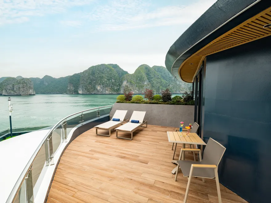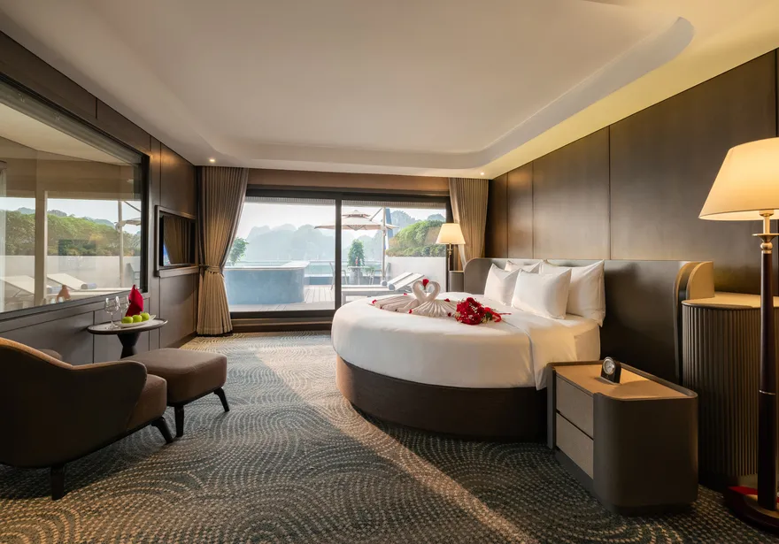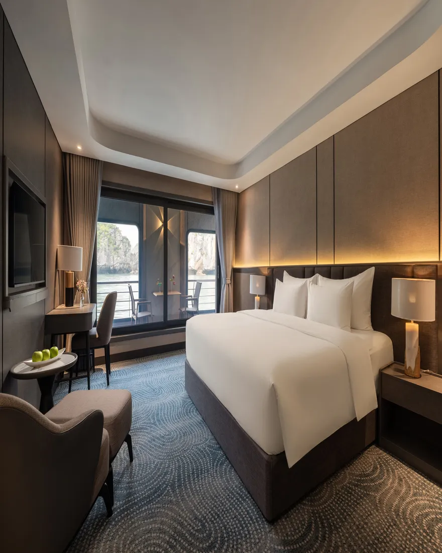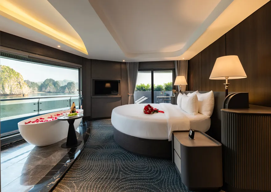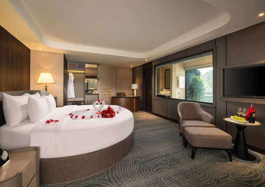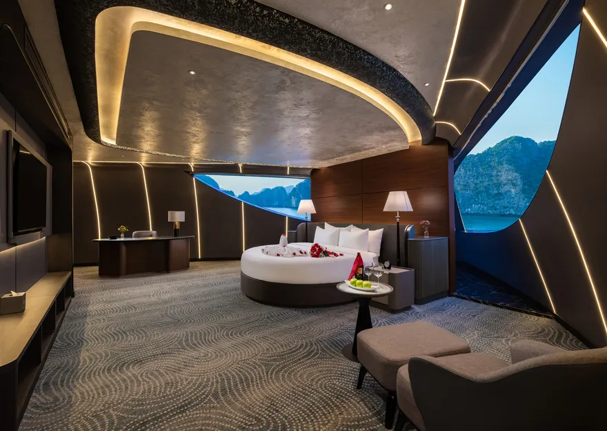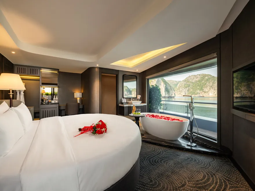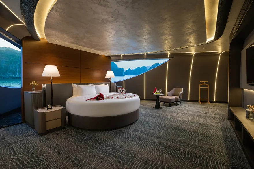 • Có 02 phòng. nằm ở Tầng 3 và Tầng 4 (vị trí mũi tàu hoặc đuôi tàu để lấy view rộng nhất).