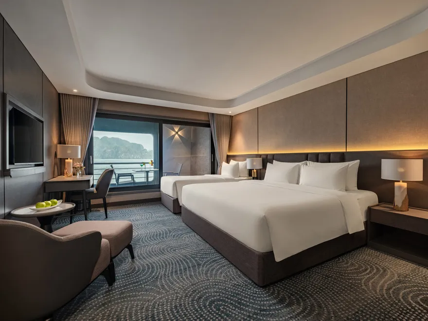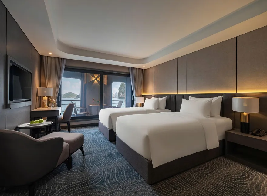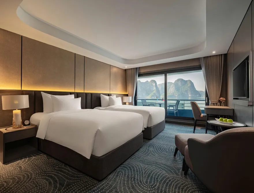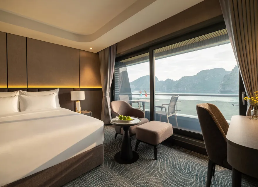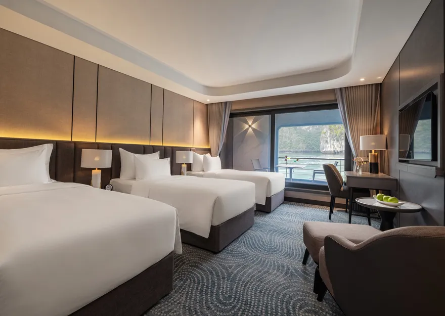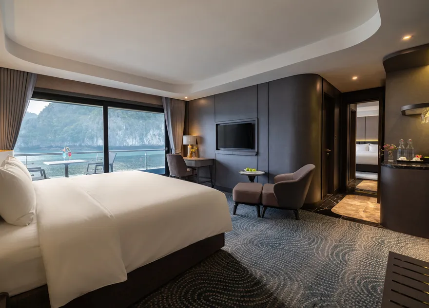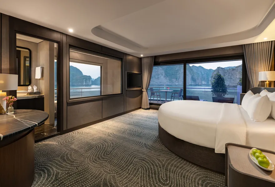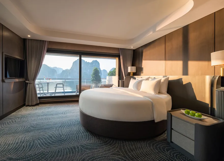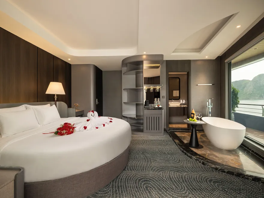 • Có 02 phòng. nằm ở Tầng 3 và Tầng 4 (vị trí mũi tàu hoặc đuôi tàu để lấy view rộng nhất).