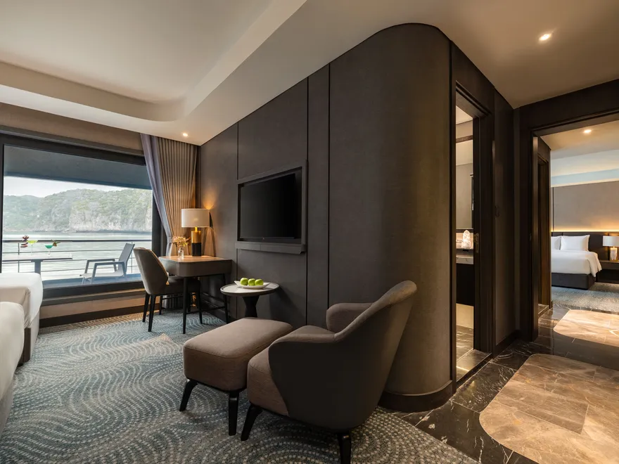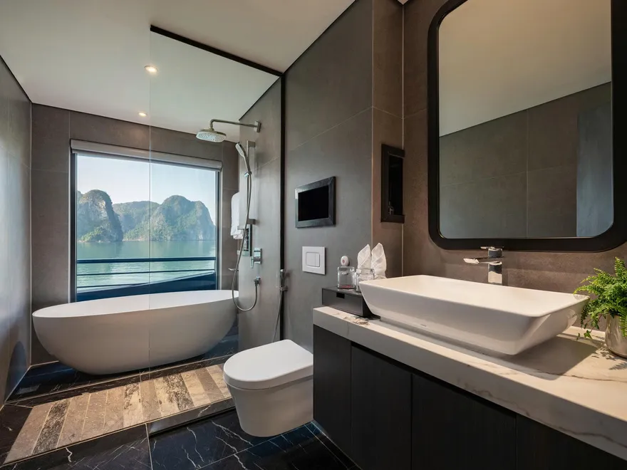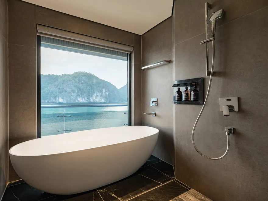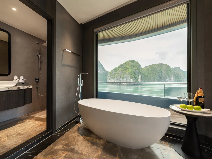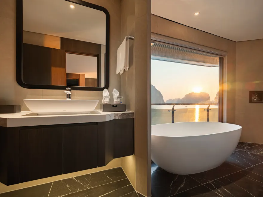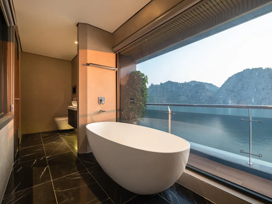 • Có Nội thất gỗ sồi ấm cúng, bồn tắm view biển, vị trí tầng cao giúp quan sát vịnh tốt hơn.