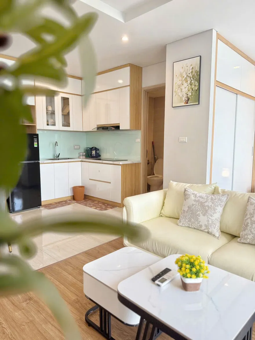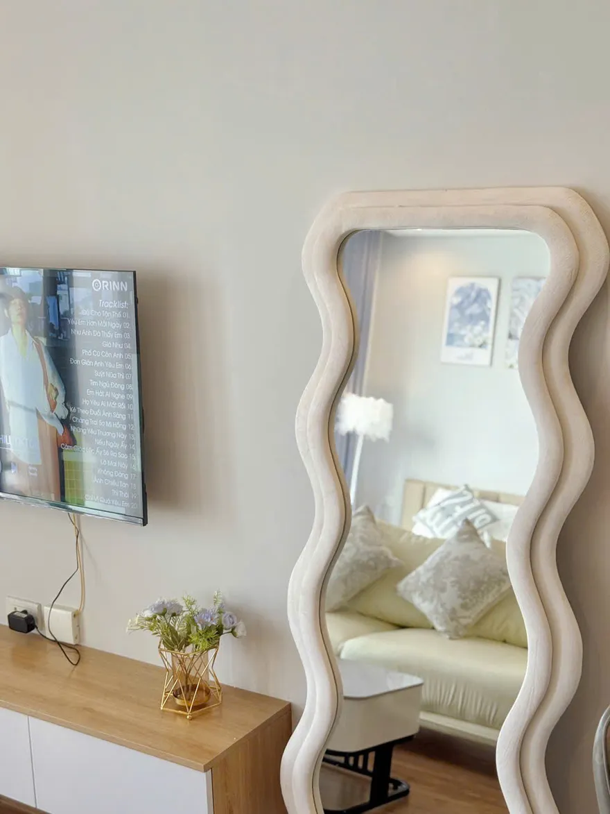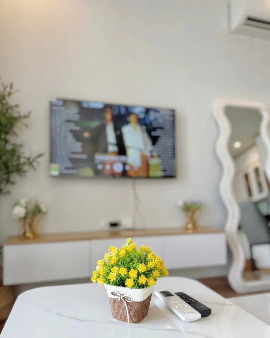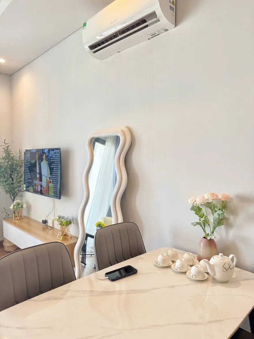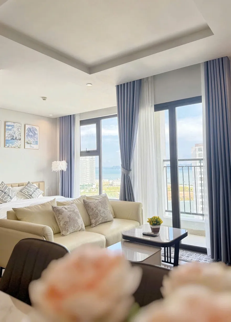 Bước chân vào bên trong, sự tinh tế được thể hiện qua ngôn ngữ thiết kế hiện đại, kết hợp nhuần nhuyễn giữa triết lý Tối giản và phong cách Scandinavian. Việc sử dụng bảng màu chủ đạo gồm trắng sứ, kem và màu gỗ sáng giúp không gian trở nên thanh lịch và rộng rãi hơn hẳn. Từng chi tiết vật liệu đều được chăm chút kỹ lưỡng, từ mặt bếp đá cẩm thạch sang trọng đến sàn gỗ chống ẩm chuyên dụng cho vùng biển. Căn hộ còn gây ấn tượng bởi những điểm nhấn décor mang tính xu hướng như chiếc gương lượn sóng nghệ thuật — góc check-in yêu thích của giới trẻ, hay chiếc đèn lông vũ tỏa ánh sáng dịu nhẹ bên giường ngủ. Mọi tiện nghi từ tủ lạnh, bếp từ đến Smart TV đều được trang bị đầy đủ, sẵn sàng phục vụ cho một cuộc sống tiện nghi như tại chính ngôi nhà mình.