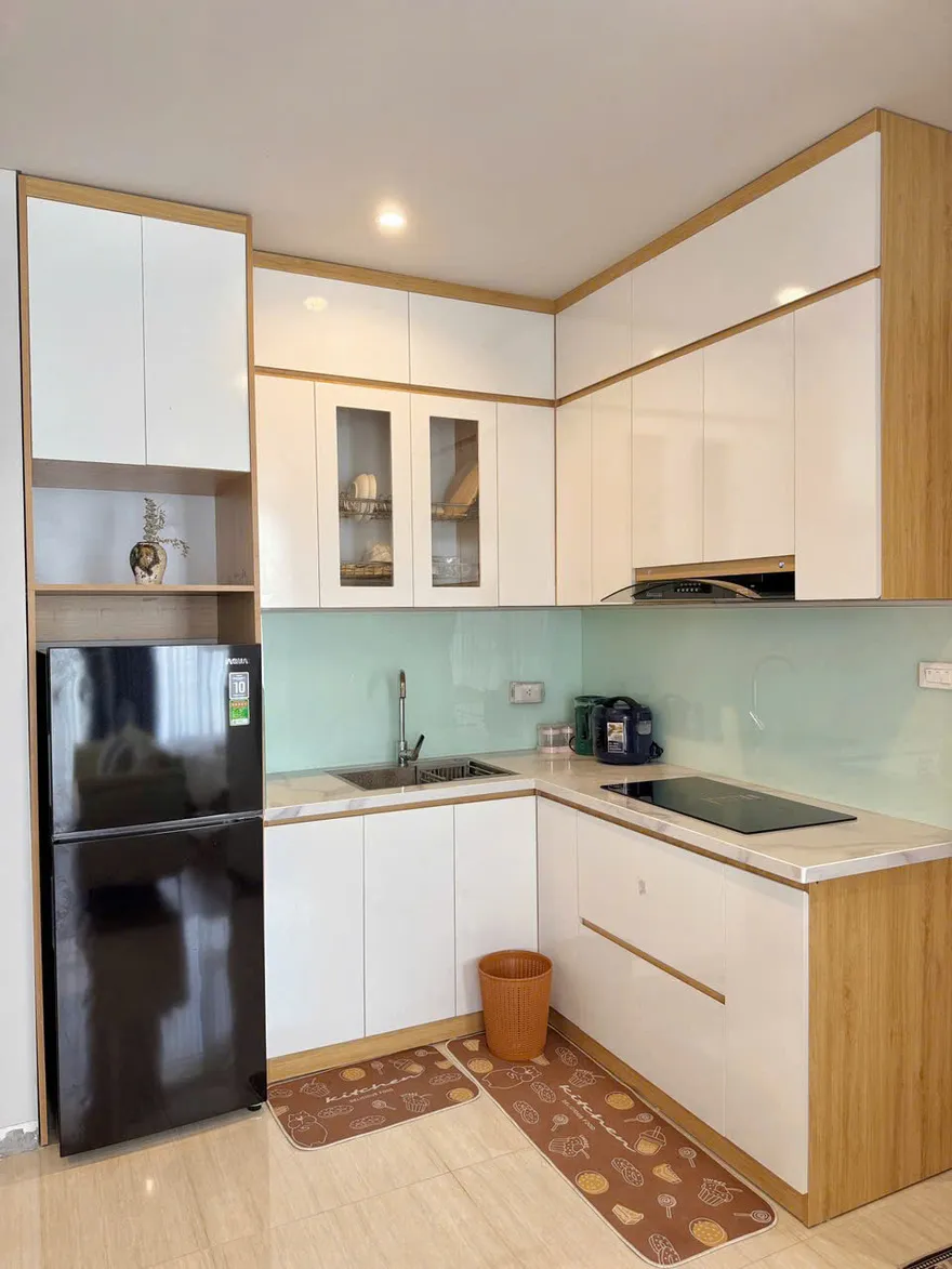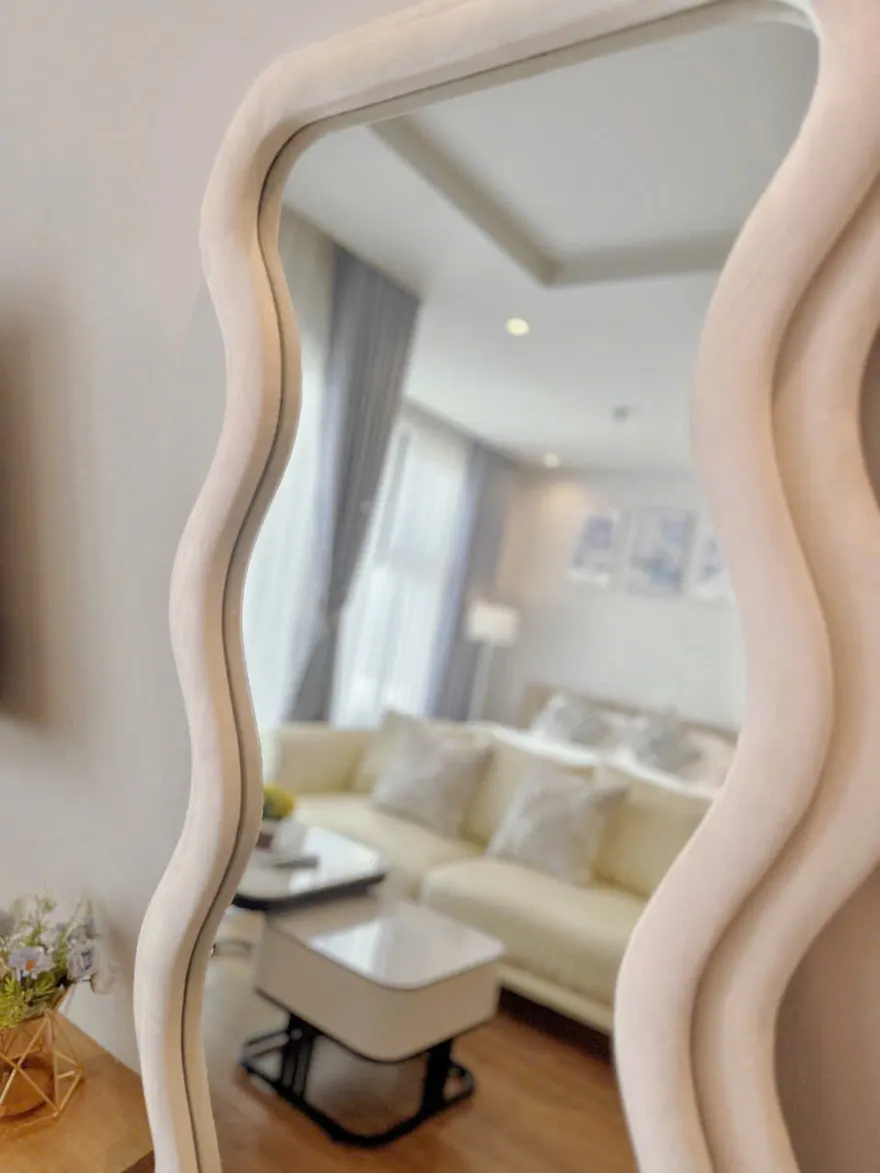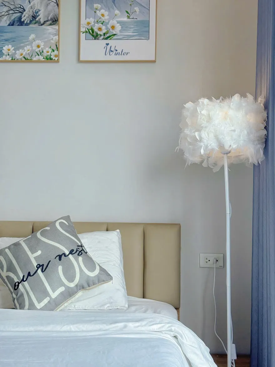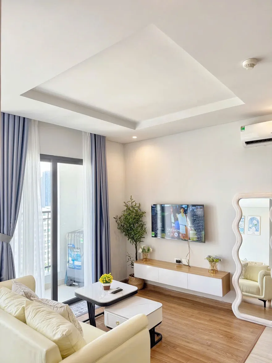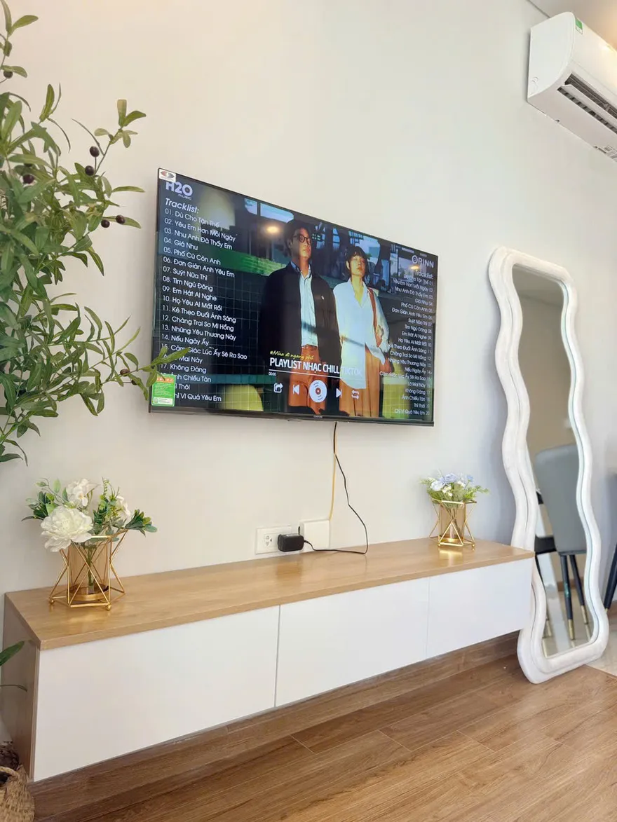 Bước chân vào bên trong, sự tinh tế được thể hiện qua ngôn ngữ thiết kế hiện đại, kết hợp nhuần nhuyễn giữa triết lý Tối giản và phong cách Scandinavian. Việc sử dụng bảng màu chủ đạo gồm trắng sứ, kem và màu gỗ sáng giúp không gian trở nên thanh lịch và rộng rãi hơn hẳn. Từng chi tiết vật liệu đều được chăm chút kỹ lưỡng, từ mặt bếp đá cẩm thạch sang trọng đến sàn gỗ chống ẩm chuyên dụng cho vùng biển. Căn hộ còn gây ấn tượng bởi những điểm nhấn décor mang tính xu hướng như chiếc gương lượn sóng nghệ thuật — góc check-in yêu thích của giới trẻ, hay chiếc đèn lông vũ tỏa ánh sáng dịu nhẹ bên giường ngủ. Mọi tiện nghi từ tủ lạnh, bếp từ đến Smart TV đều được trang bị đầy đủ, sẵn sàng phục vụ cho một cuộc sống tiện nghi như tại chính ngôi nhà mình.