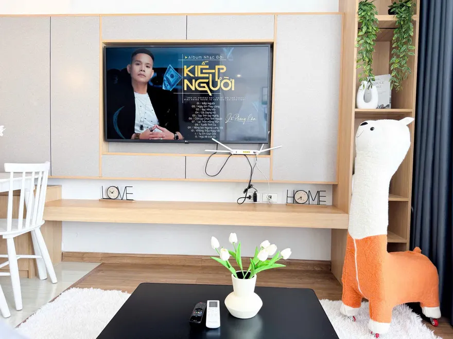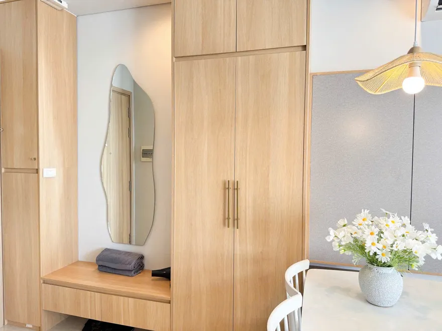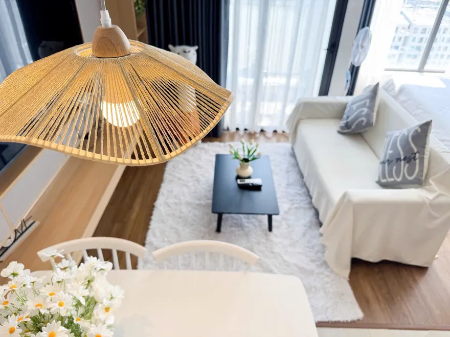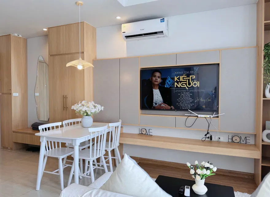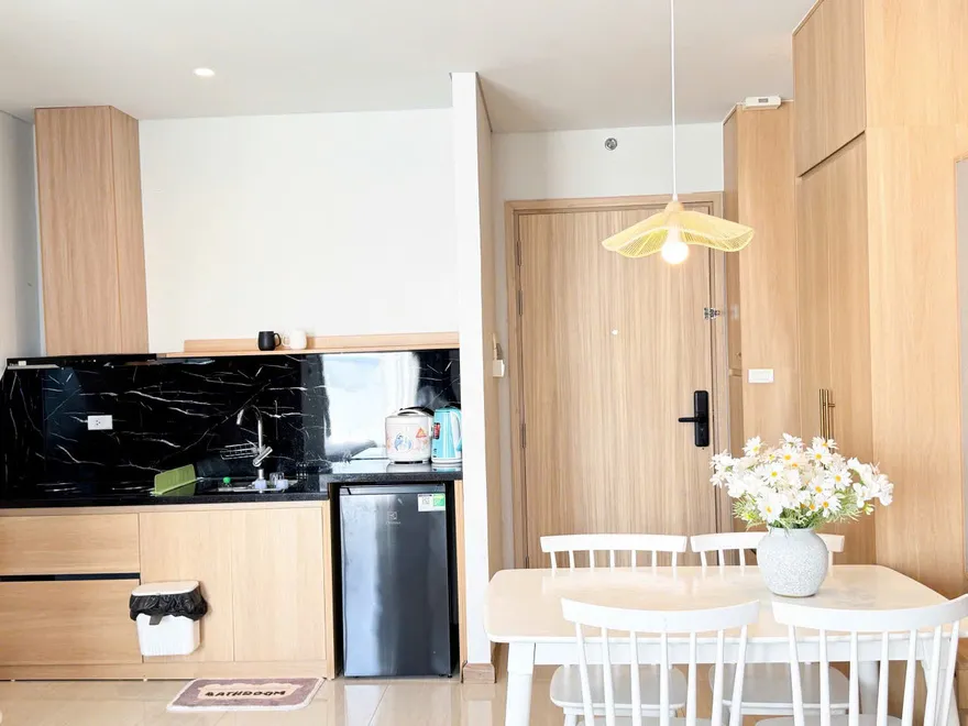 Đặc biệt, góc bếp của căn hộ được ví như một không gian “nhỏ nhưng có võ” với mặt đá đen vân mây sang trọng và đầy đủ thiết bị nấu nướng. Với lợi thế nằm ngay sát siêu thị Lotte Mart, khách lưu trú có thể dễ dàng chuẩn bị những bữa tiệc hải sản tươi ngon ngay tại phòng – một trải nghiệm mà khó có khách sạn truyền thống nào cung cấp được. Bên cạnh công năng, căn hộ còn là một “studio thu nhỏ” với những điểm nhấn sống ảo cực kỳ trendy như chiếc gương soi toàn thân dáng lượn sóng tại lối vào hay chiếc đèn mây tre đan ấm cúng khu vực bàn ăn. Và cuối cùng, linh hồn của căn hộ chính là góc ban công tầng 28 với bộ bàn trà nhỏ, nơi bạn có thể nhâm nhi ly cocktail và thu trọn vẹn vẻ đẹp của kỳ quan thiên nhiên thế giới vào tầm mắt.