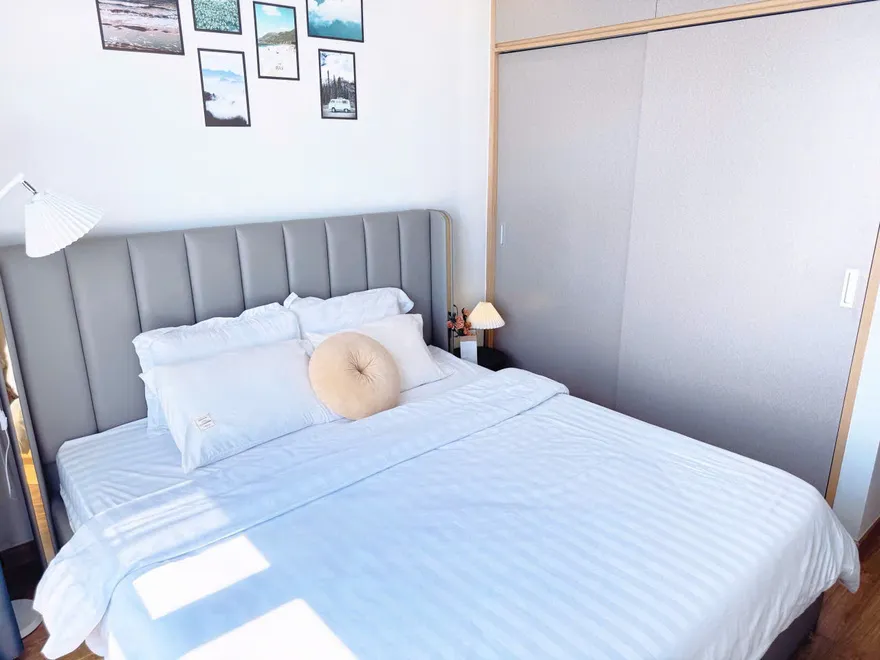 Trải nghiệm thực tế tại không gian này chính là hành trình chạm tới cảm xúc. Điểm chạm đầu tiên và cũng là đắt giá nhất chính là đặc ân được “mở mắt thấy biển” mỗi sớm mai qua hệ cửa kính lớn chạm sàn. Ánh sáng tự nhiên ngập tràn trong căn phòng xóa nhòa mọi ranh giới giữa nội thất và ngoại cảnh, tạo cảm giác như bạn đang lơ lửng giữa mây trời và sóng biển hòa làm một. Triết lý thiết kế thông minh được thể hiện sắc nét qua sự sắp đặt đầy dụng ý: khu vực nghỉ ngơi với giường ngủ chuẩn khách sạn nối liền với sofa trắng kem và thảm lông mềm mại. Toàn bộ hệ tủ đa năng sử dụng gỗ sáng màu kịch trần giúp tối ưu diện tích, tích hợp khéo léo cả kệ TV và không gian lưu trữ đồ dùng cá nhân, tạo nên một tổng thể thanh thoát và rộng mở.